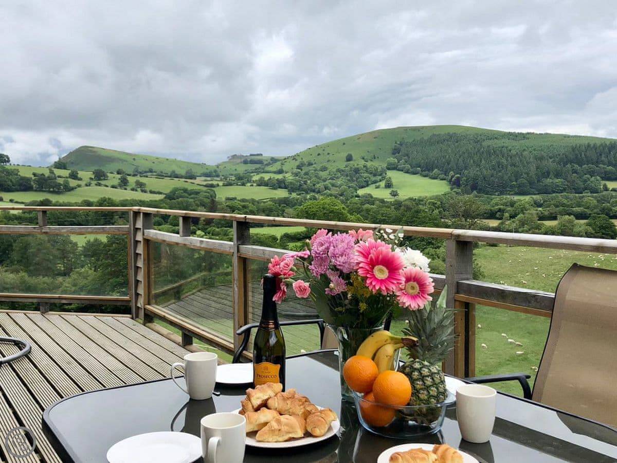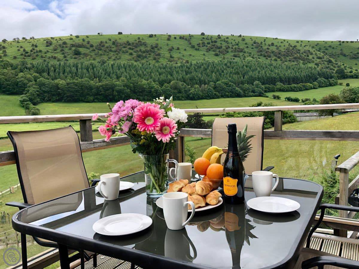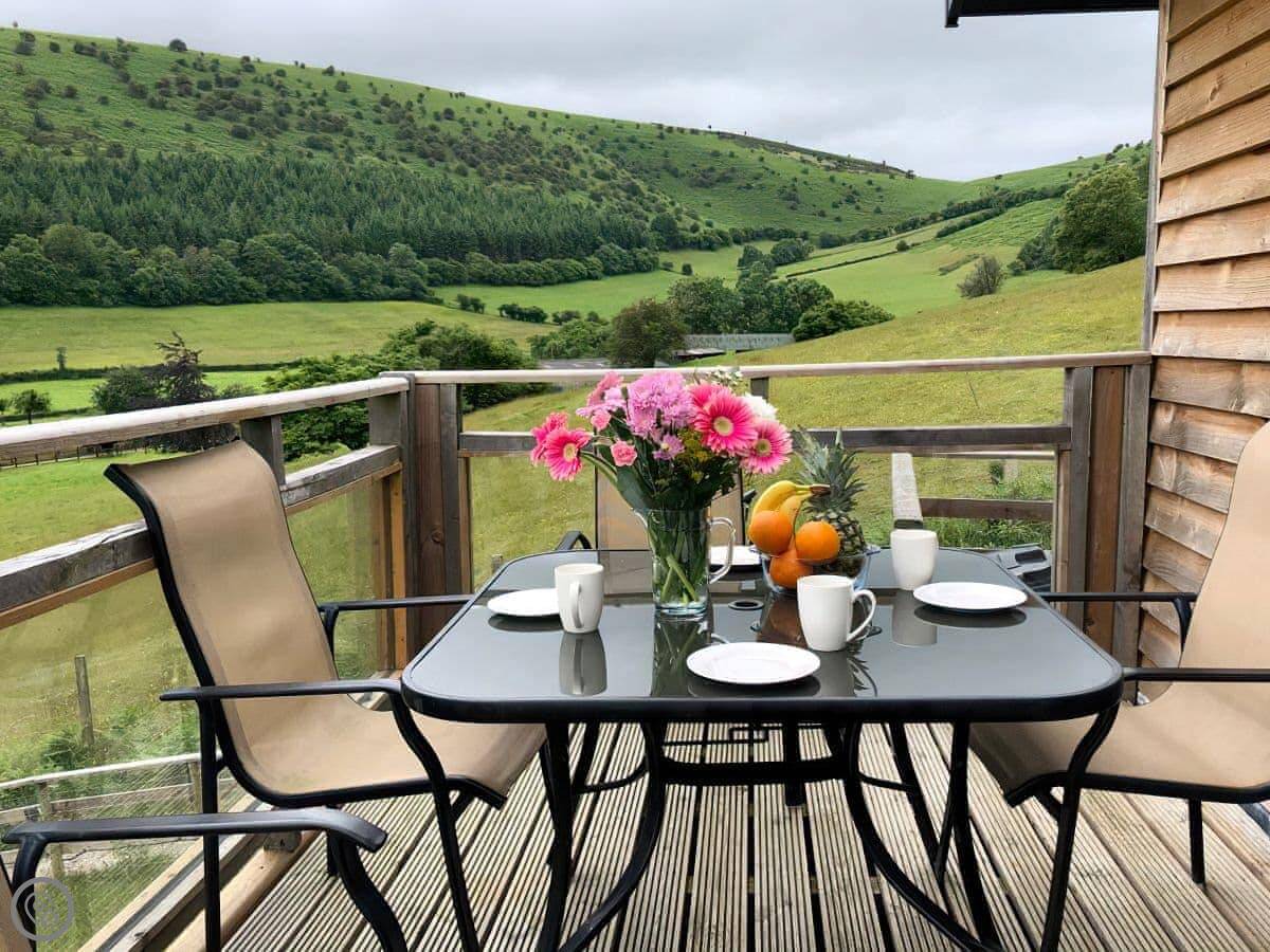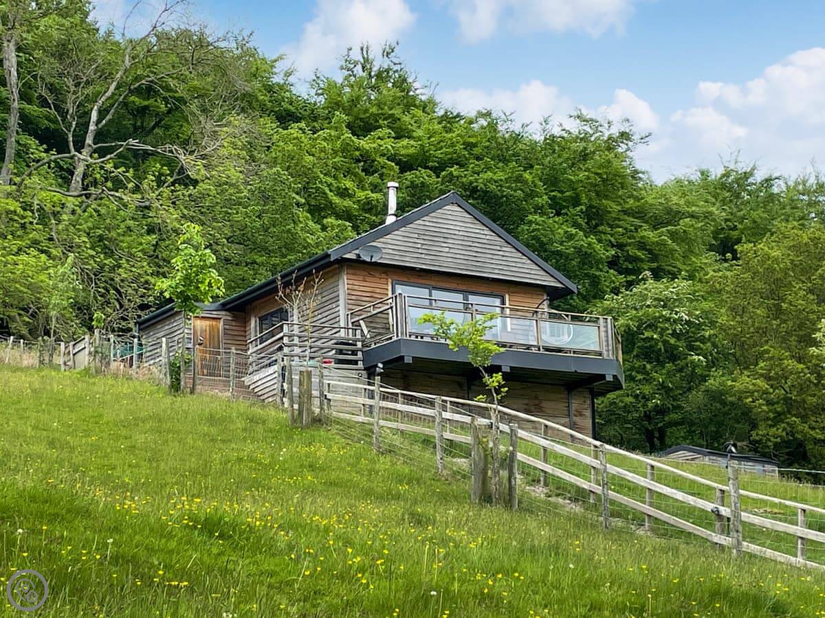 This is Offa's Dyke Lodge. It's on our farm in Stanner, up in the hills near the English border. You're on a working farm here, so there are sheep and cattle in the fields. The views from up here are very good, looking out over the valley.