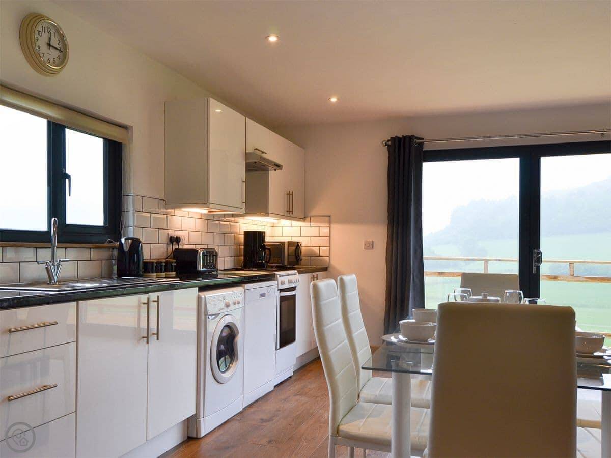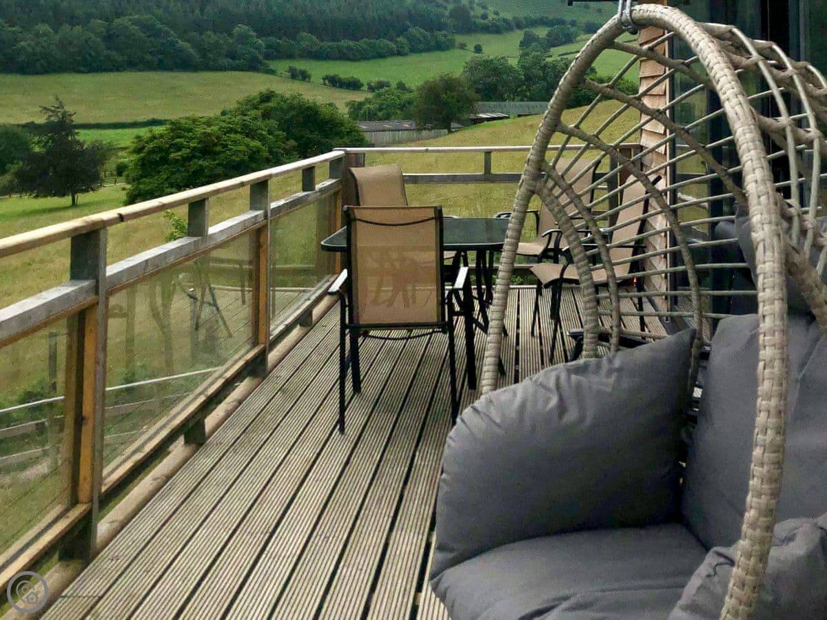 You should know about the access. You park your car below the property, then there's an uphill walk to the lodge itself, followed by about six steps up to the front door. It opens straight into the main living area. It's all open plan inside. The patio doors lead out onto a balcony, which is the best spot for the view.