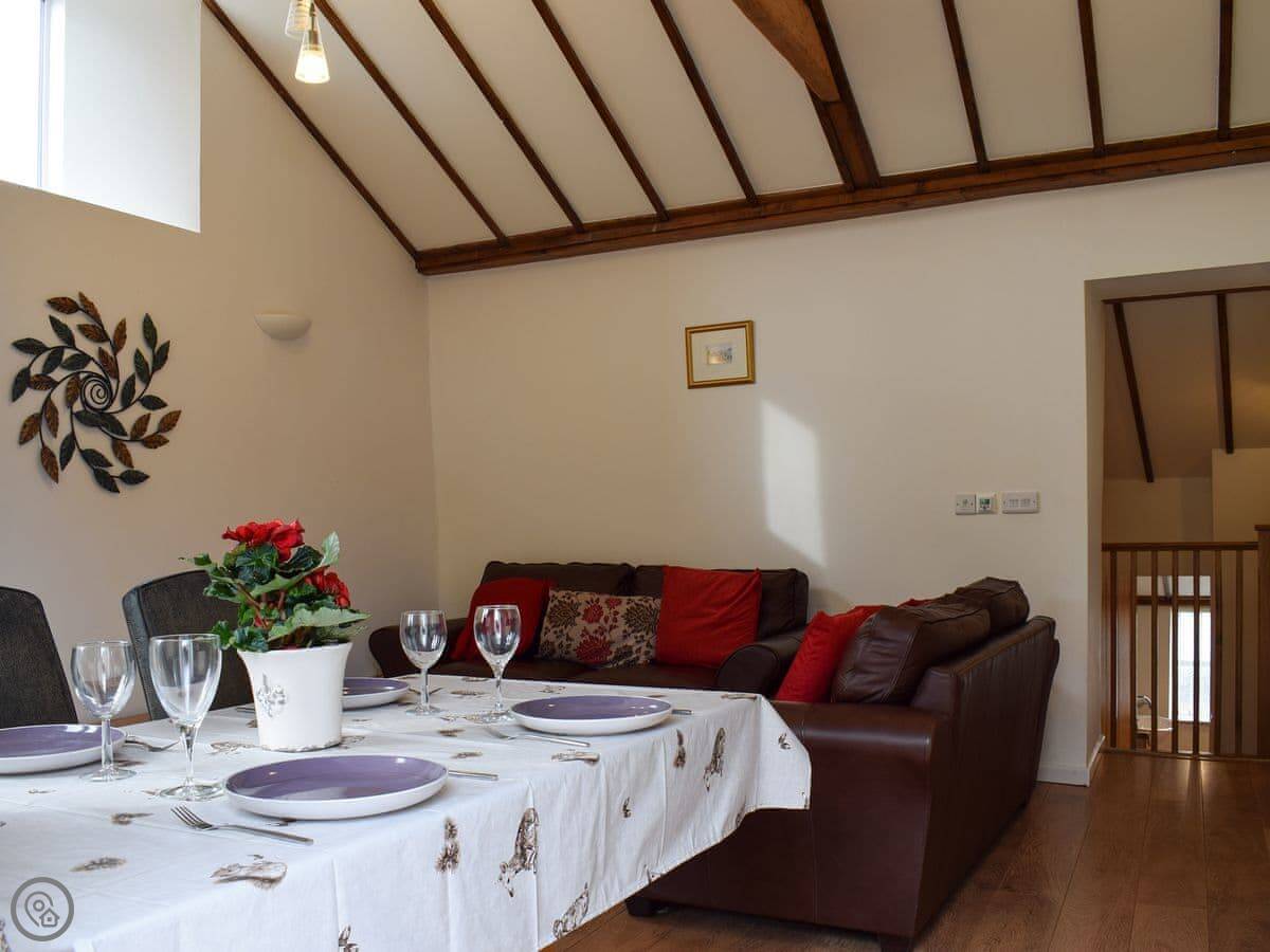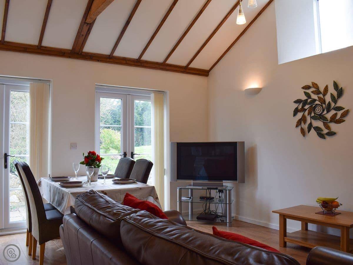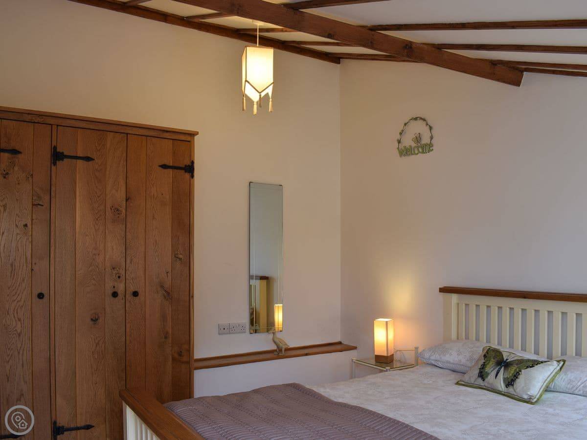It sleeps two. One bedroom, one bathroom. It's got a 4 Star rating. It's all on one level, more or less, but the layout is upside down. The bedroom and bathroom are on the ground floor. Then you go up a flight of stairs to the main living area. That's open plan, kitchen and sitting room together. There are French doors there that open onto your own patio. It looks out over fields.