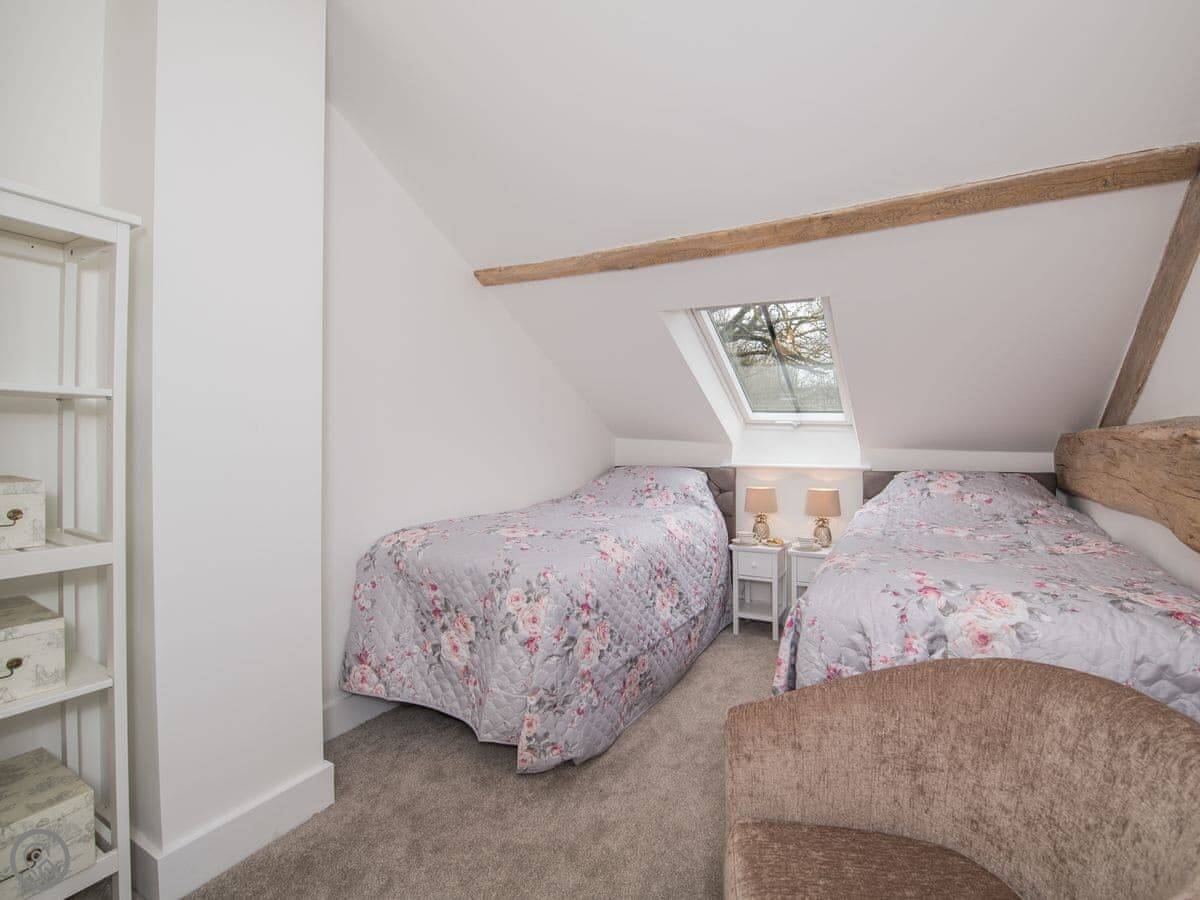 It sleeps six, has three bedrooms and two bathrooms. It's got a 4 Star rating, which means it's comfortable and well finished. The layout is a bit unusual. It's open plan downstairs. Upstairs, there are two separate staircases leading off the living room, one to a bedroom on one side and two bedrooms on the other. It means two of the bedrooms aren't connected by a landing.