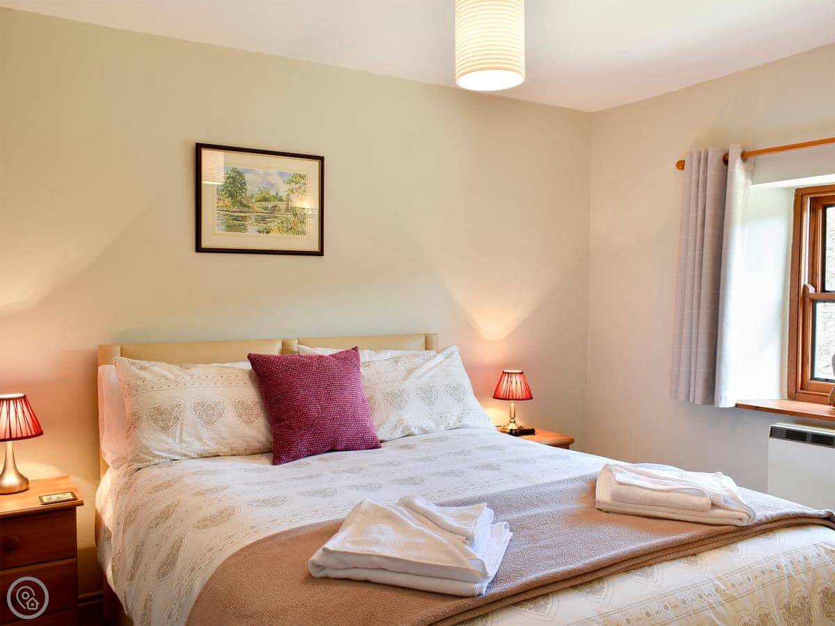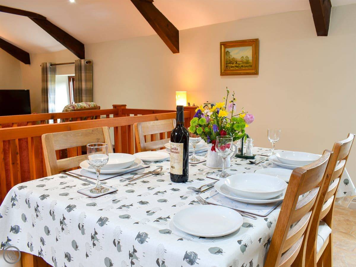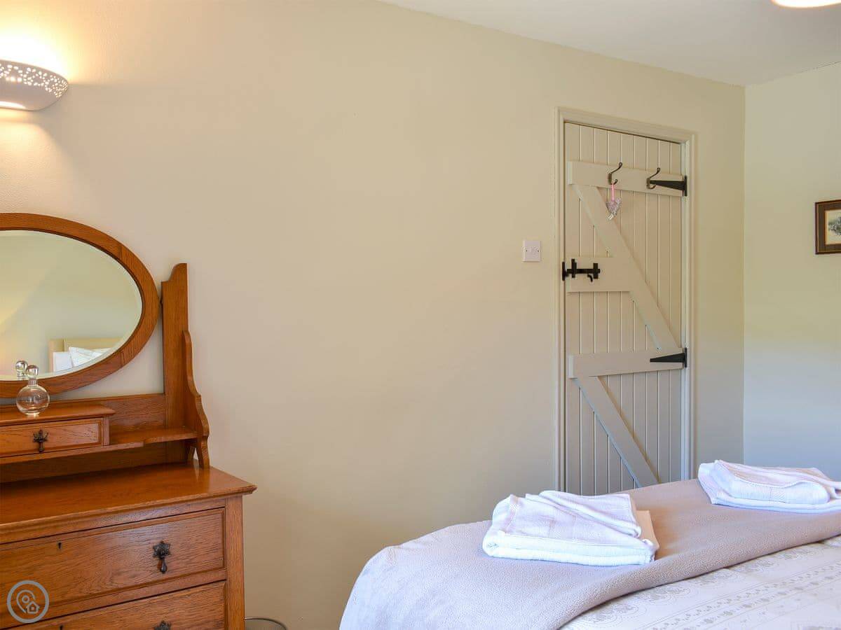Tucked away from the world in a tranquil setting with the most amazing views over the river and dale. This Grade II listed cottage oozes character and charm. Upside down in nature, taking in the fabulous views from the first floor living area window. The cottage is perfectly equipped, with quality furnishings and fittings offering home from home comfort. You’ll be tempted to sit at the window seat with a book to relax and unwind! The upper floor is open plan, light and airy and the living area has a gorgeous wood burner to keep you warm on chilly nights, a large TV with Freesat to give variety of entertainment and a DVD player to catch up on some of the classics! A well equipped gloss kitchen makes an excellent place to rustle up breakfast or supper while friends and family gather round the table – this is a great social space. Downstairs are two comfortable bedrooms, both front facing and taking advantage of the views.