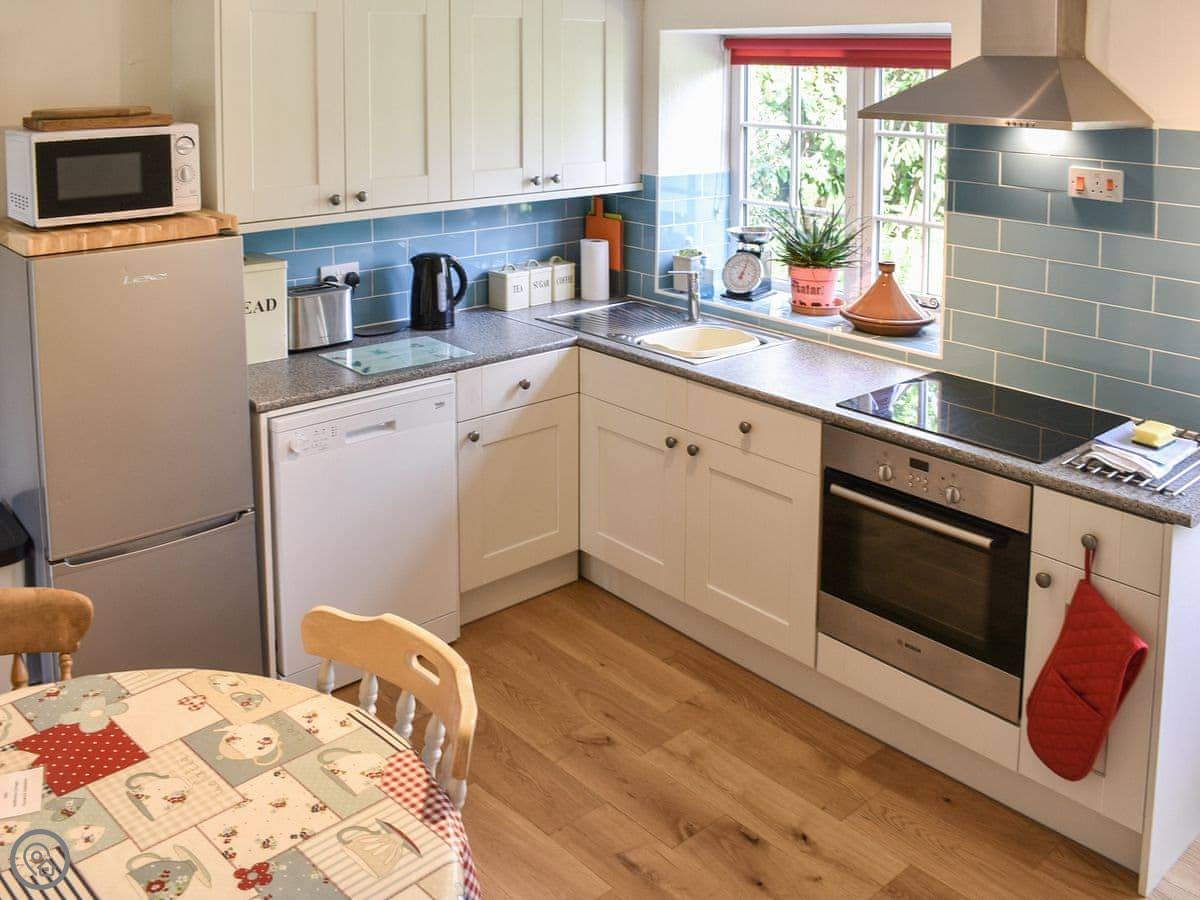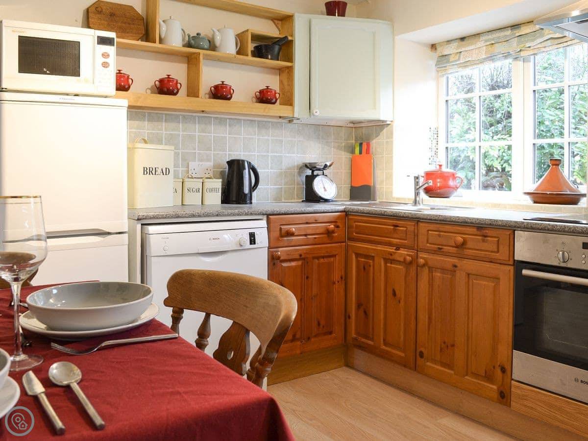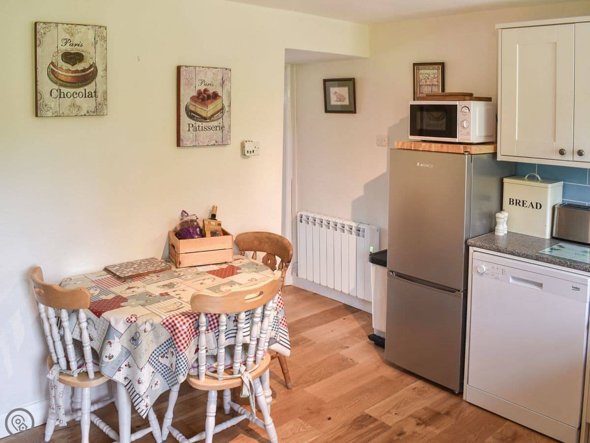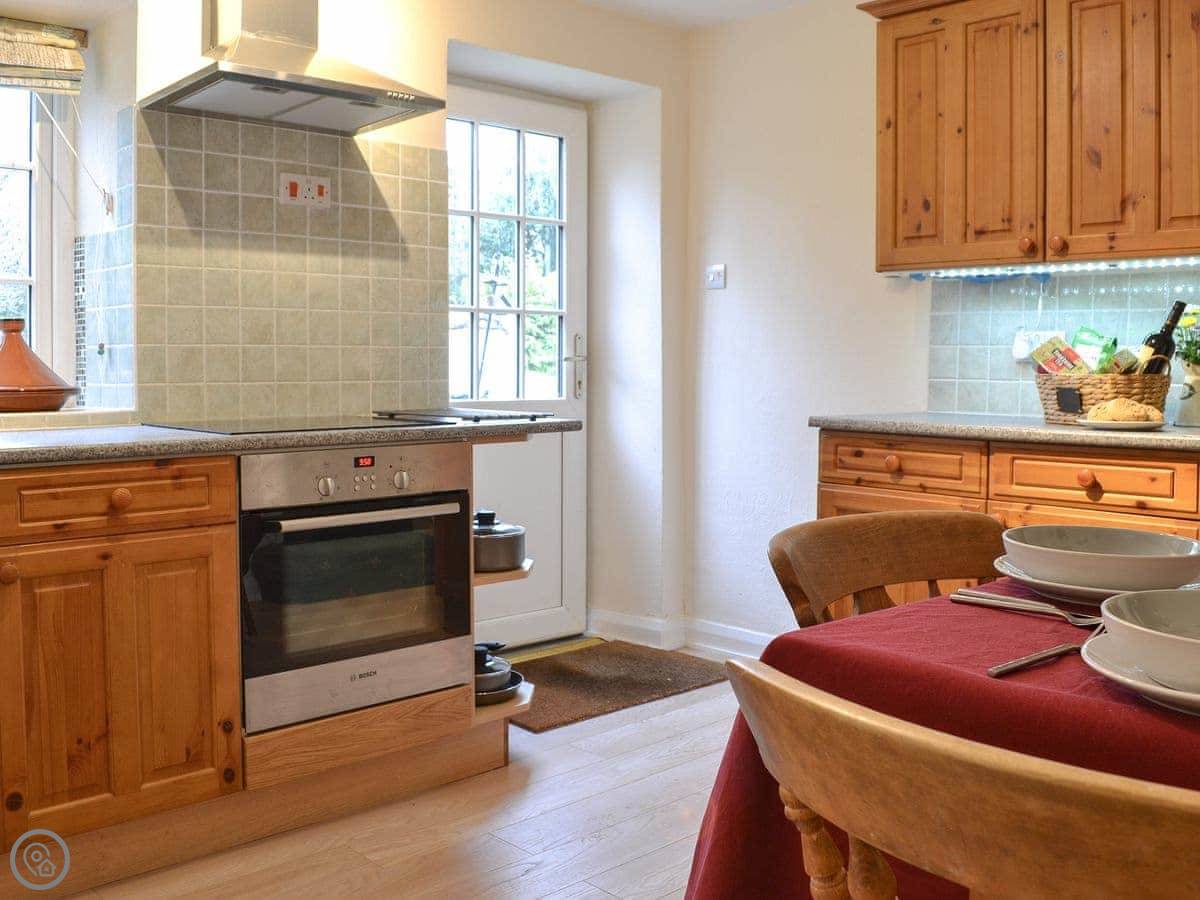 Inside, there's a country style kitchen with the dining table in it. Then a living room at the front with a wood burner. The stairs are typical cottage stairs. They're fine, but they are a bit steep and narrow.