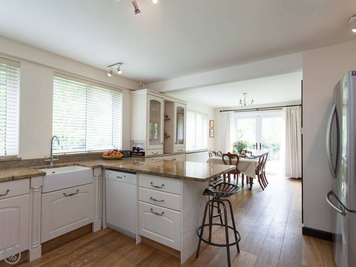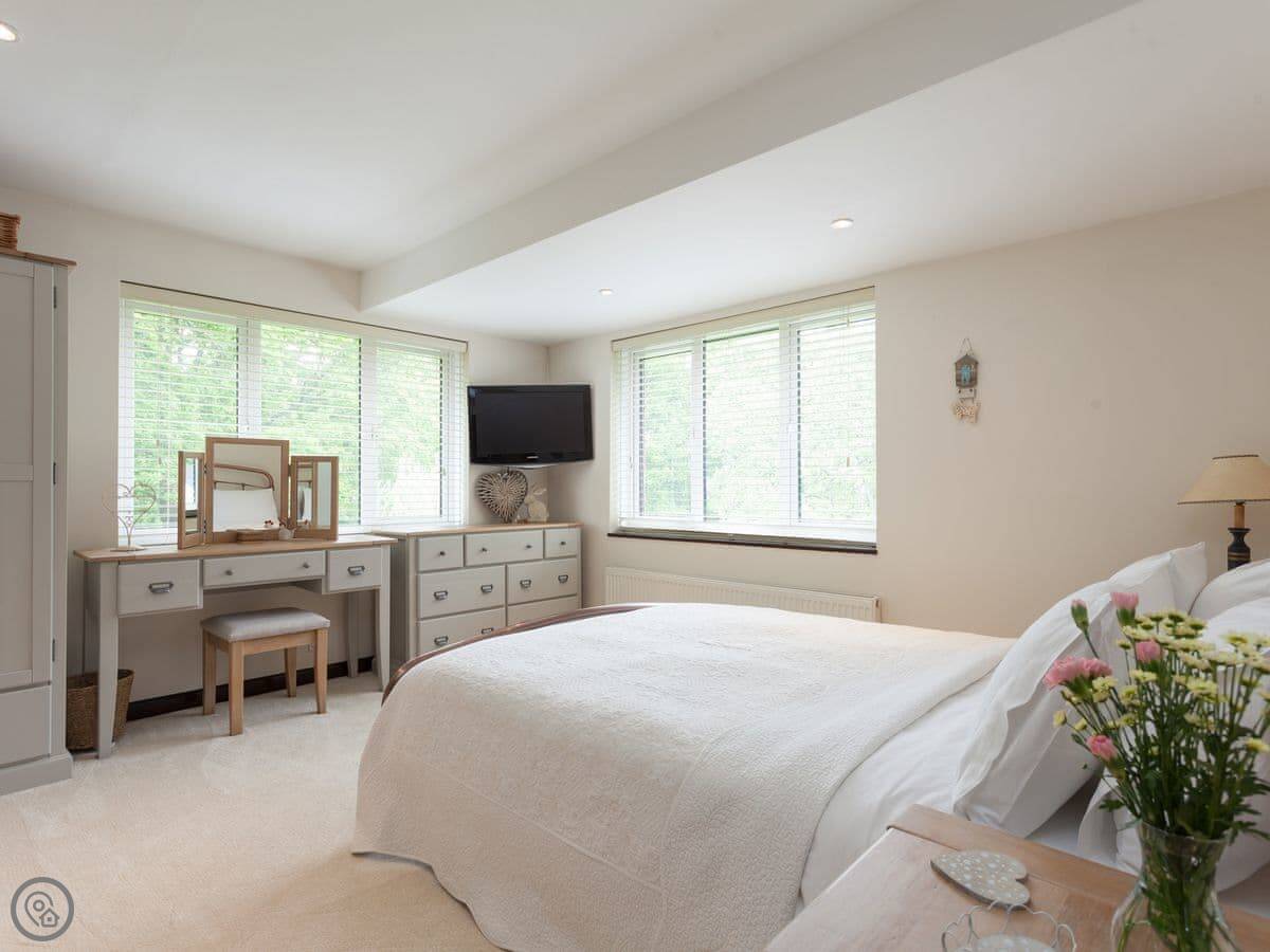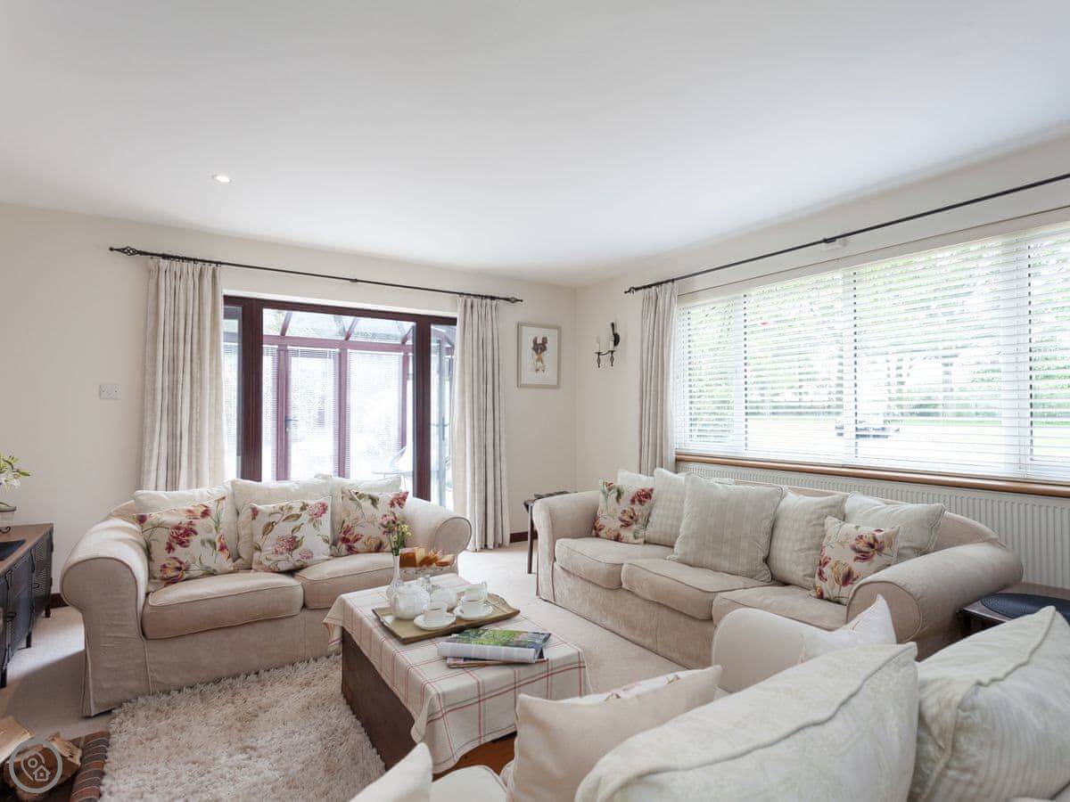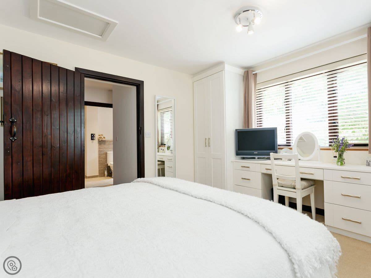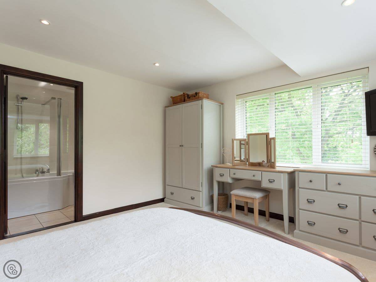 This welcoming home offers light and spacious accommodation. There is a large entrance porch, a cosy living room with a Smart TV and open fire, doors lead into the conservatory. There is a well equipped kitchen/dining room with French doors opening onto the gazebo, alFesco dining area with a fire pit, gates to lawn garden and swimming pool. There are three large bedrooms, each with king-size beds, Freeview TV and en-suite shower rooms, they all have lovely views of the woodland, swimming pool and gardens.
