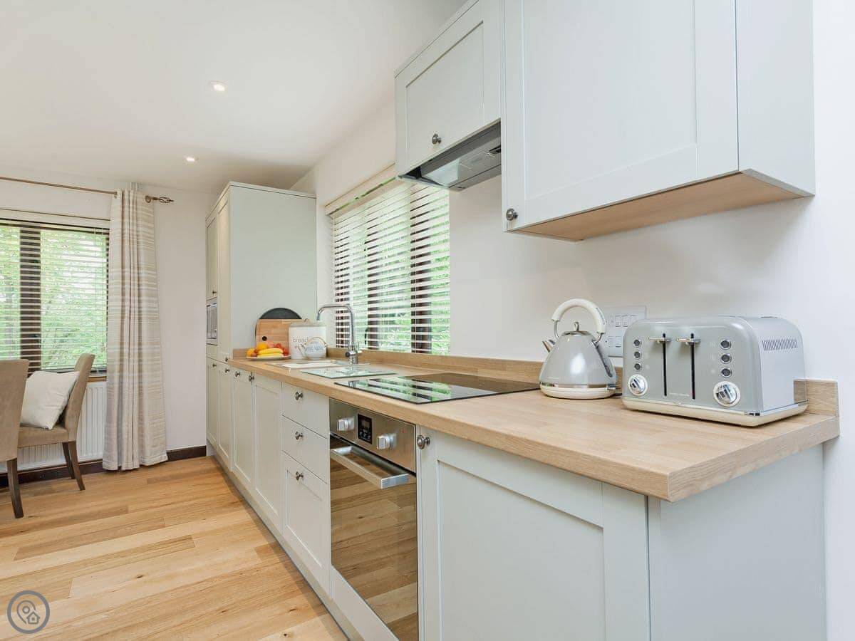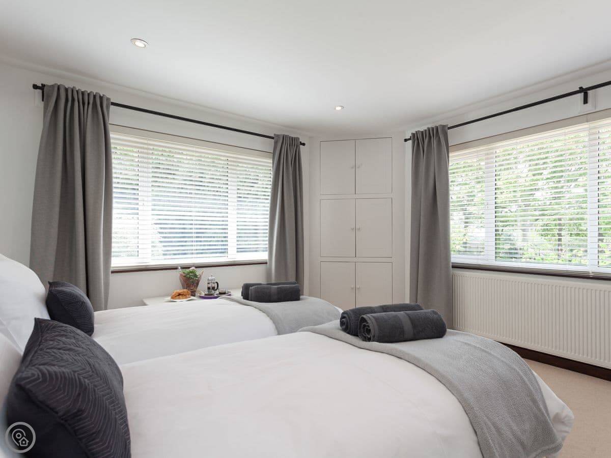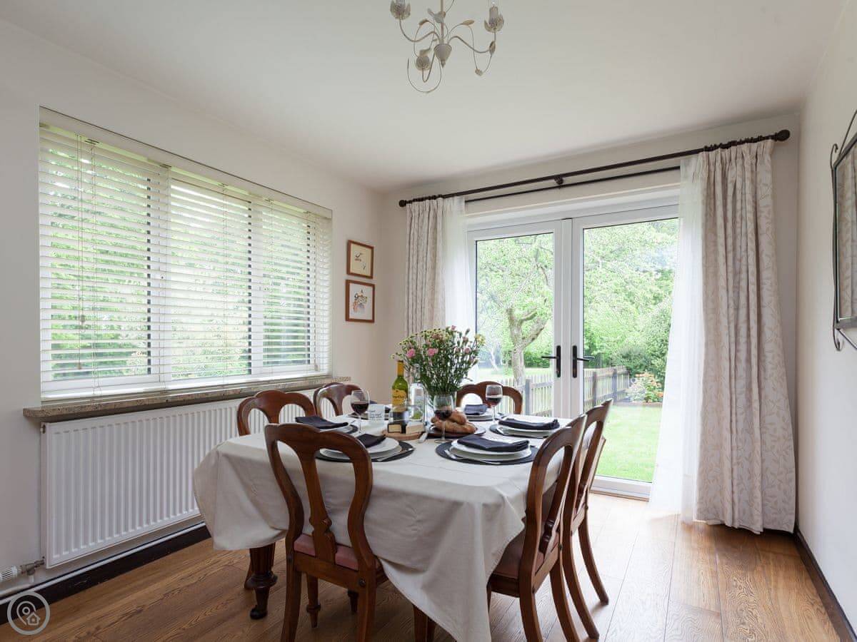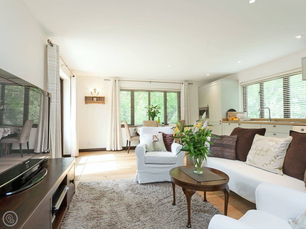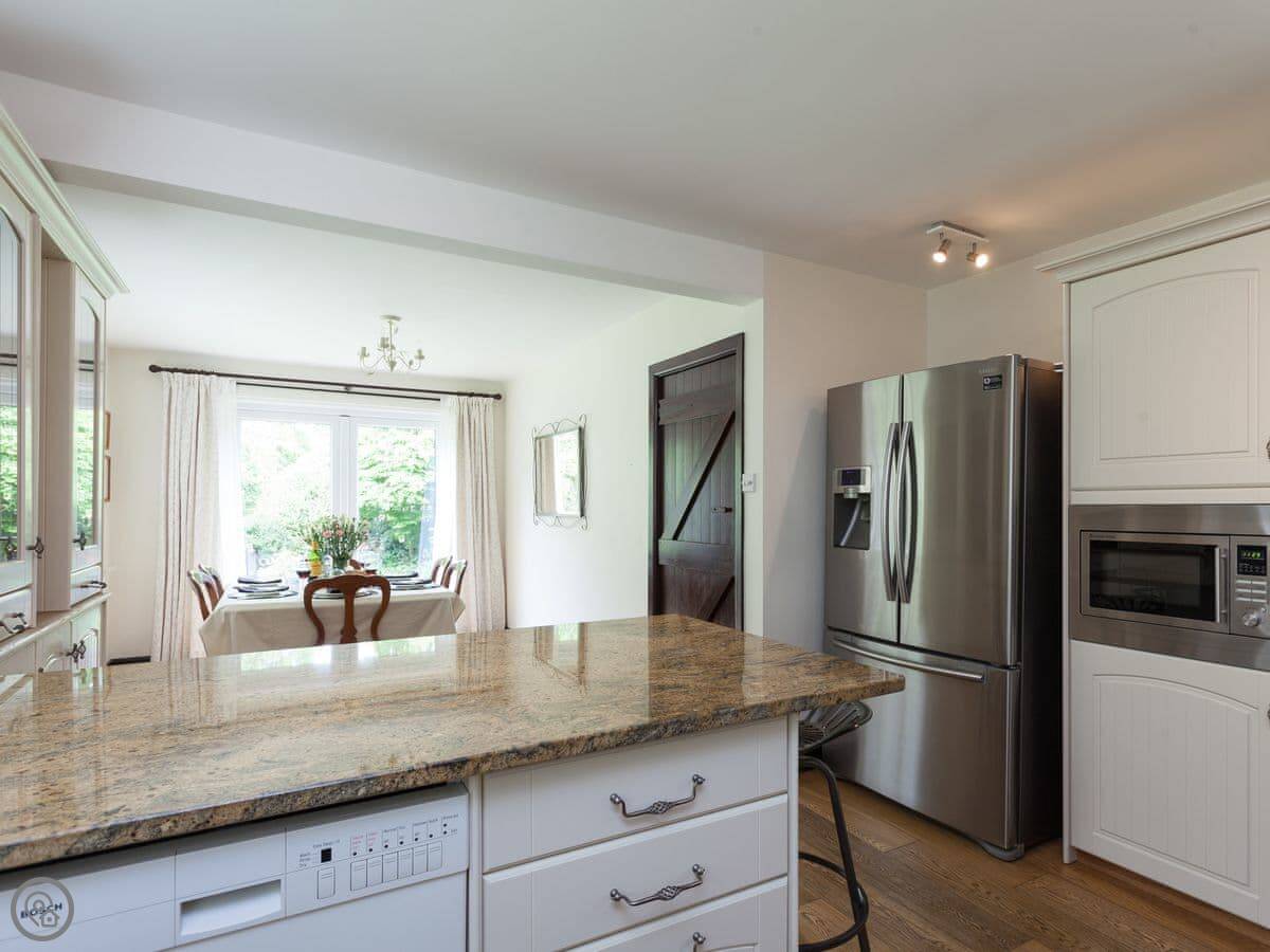 This welcoming home offers light and spacious accommodation. There is a large entrance porch, a cosy living room with a Smart TV and open fire, doors lead into the conservatory. There is a well equipped kitchen/dining room with French doors opening onto the gazebo, alFesco dining area with a fire pit, gates to lawn garden and swimming pool. There are three large bedrooms, each with king-size beds, Freeview TV and en-suite shower rooms, they all have lovely views of the woodland, swimming pool and gardens.