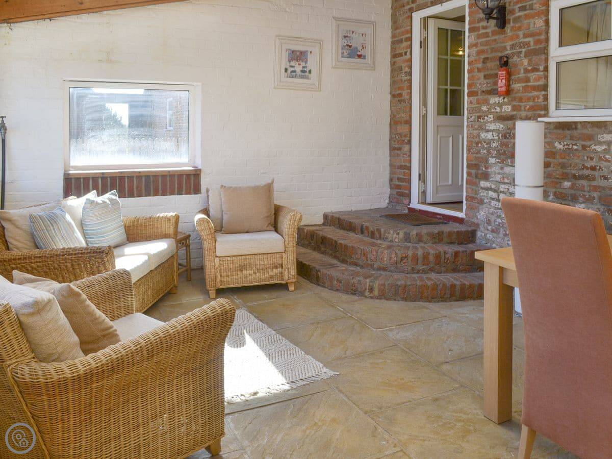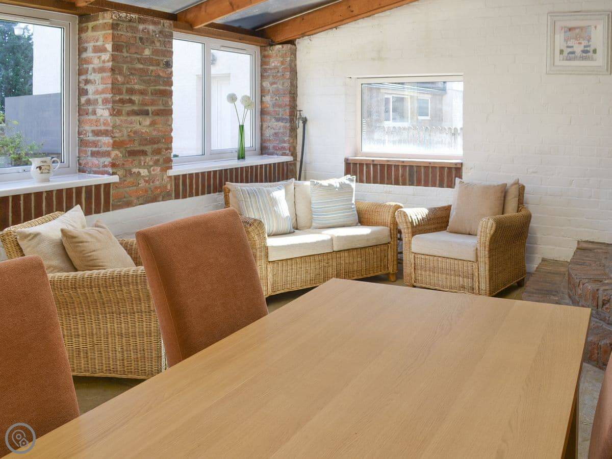 The layout is straightforward: a living room and kitchen on the ground floor, and a conservatory at the back that you use as a dining room. It gets the sun.