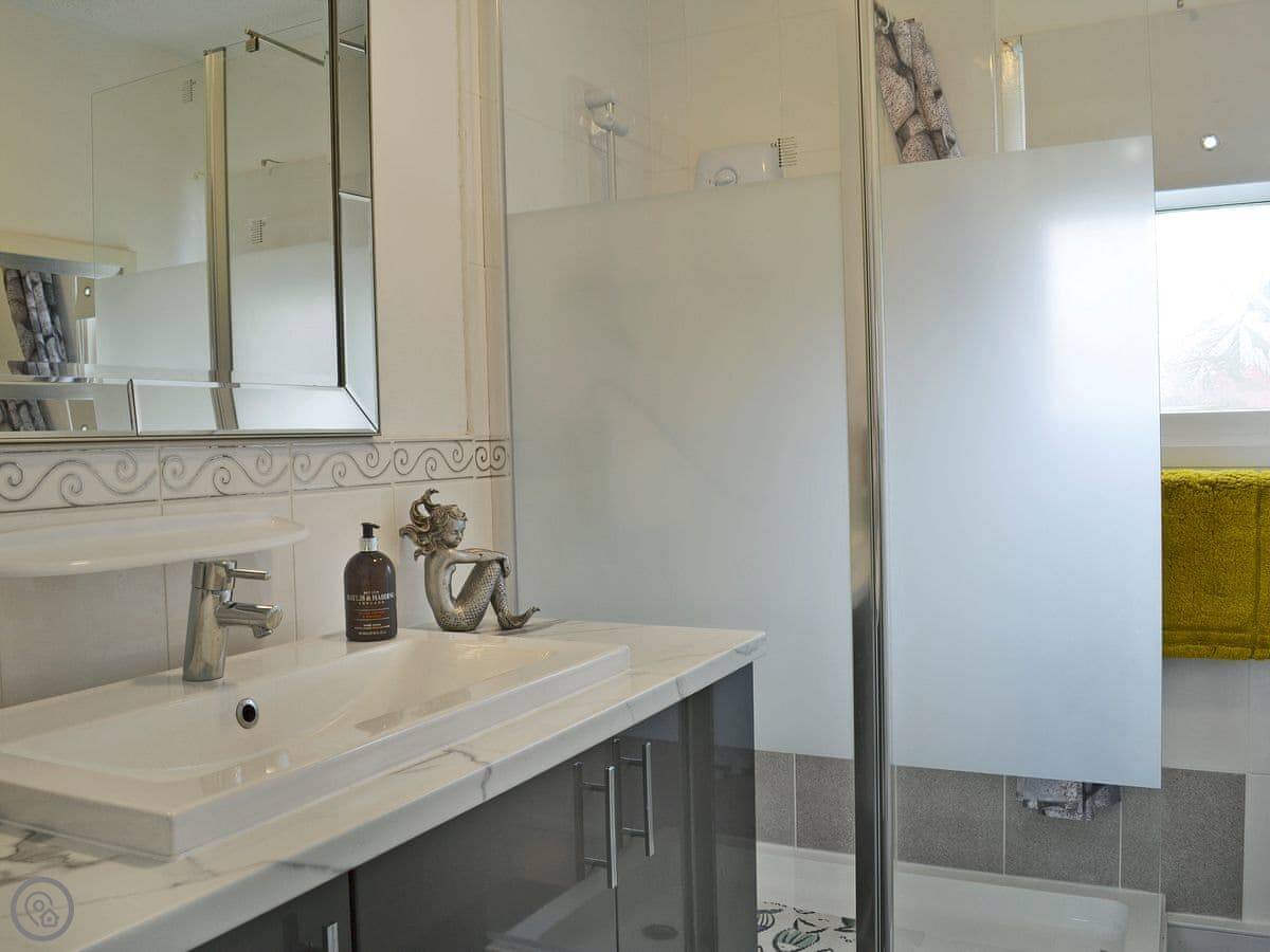 It sleeps five. There are two bedrooms: one double and one with three single beds. One bathroom with a shower. Everything is on the ground floor, so no stairs.