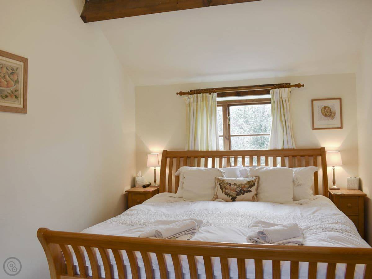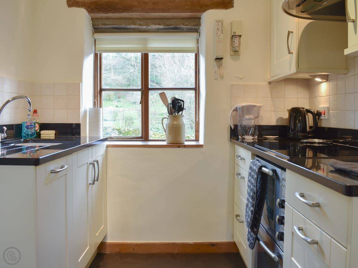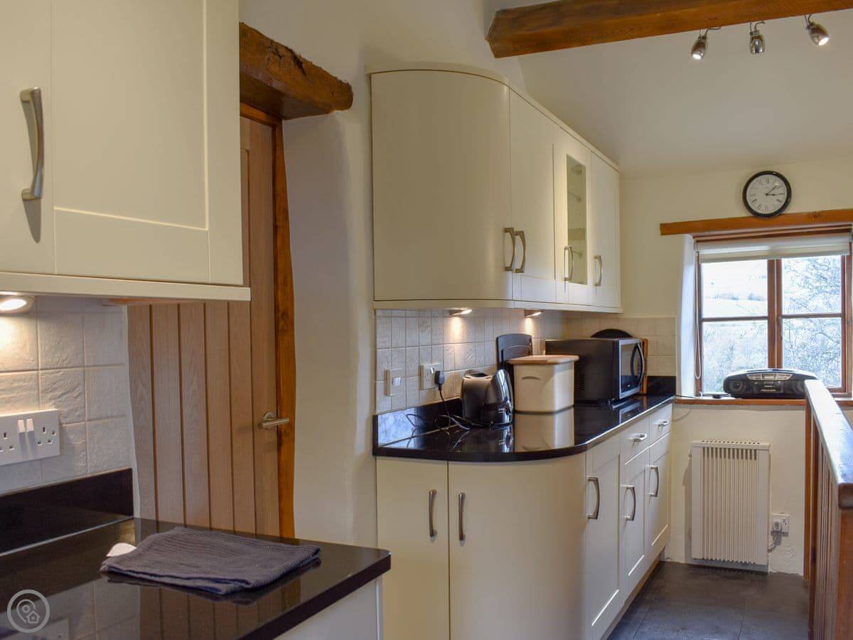 The main room is upstairs. You get the views from there. The stairs are the original ones, so they're steep and a bit winding. The kitchen is downstairs, along with the shower room and a useful boot room for muddy boots.