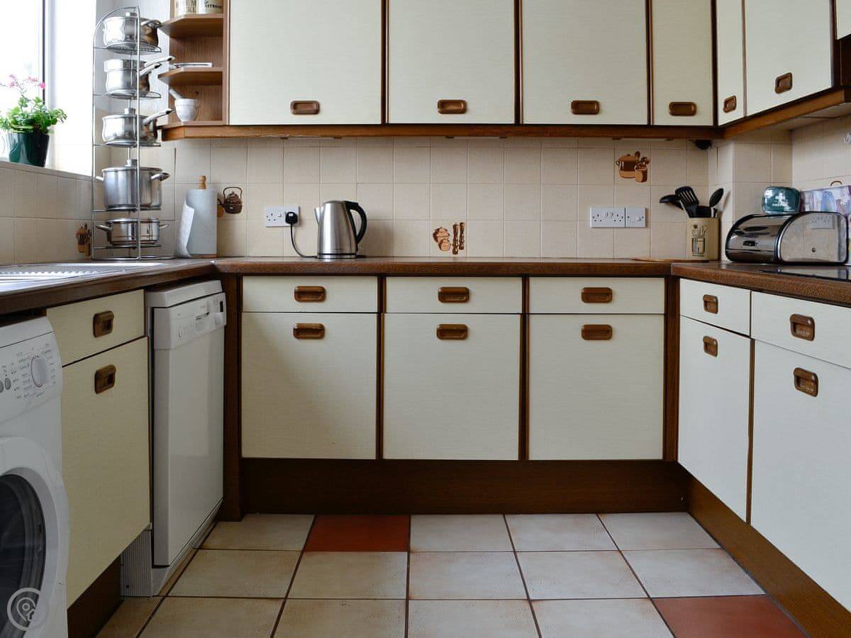 Downstairs there's a living room, a separate dining room, and a kitchen that leads out to a small patio. The kitchen has a dishwasher and a washing machine. All the bedding and towels are included.