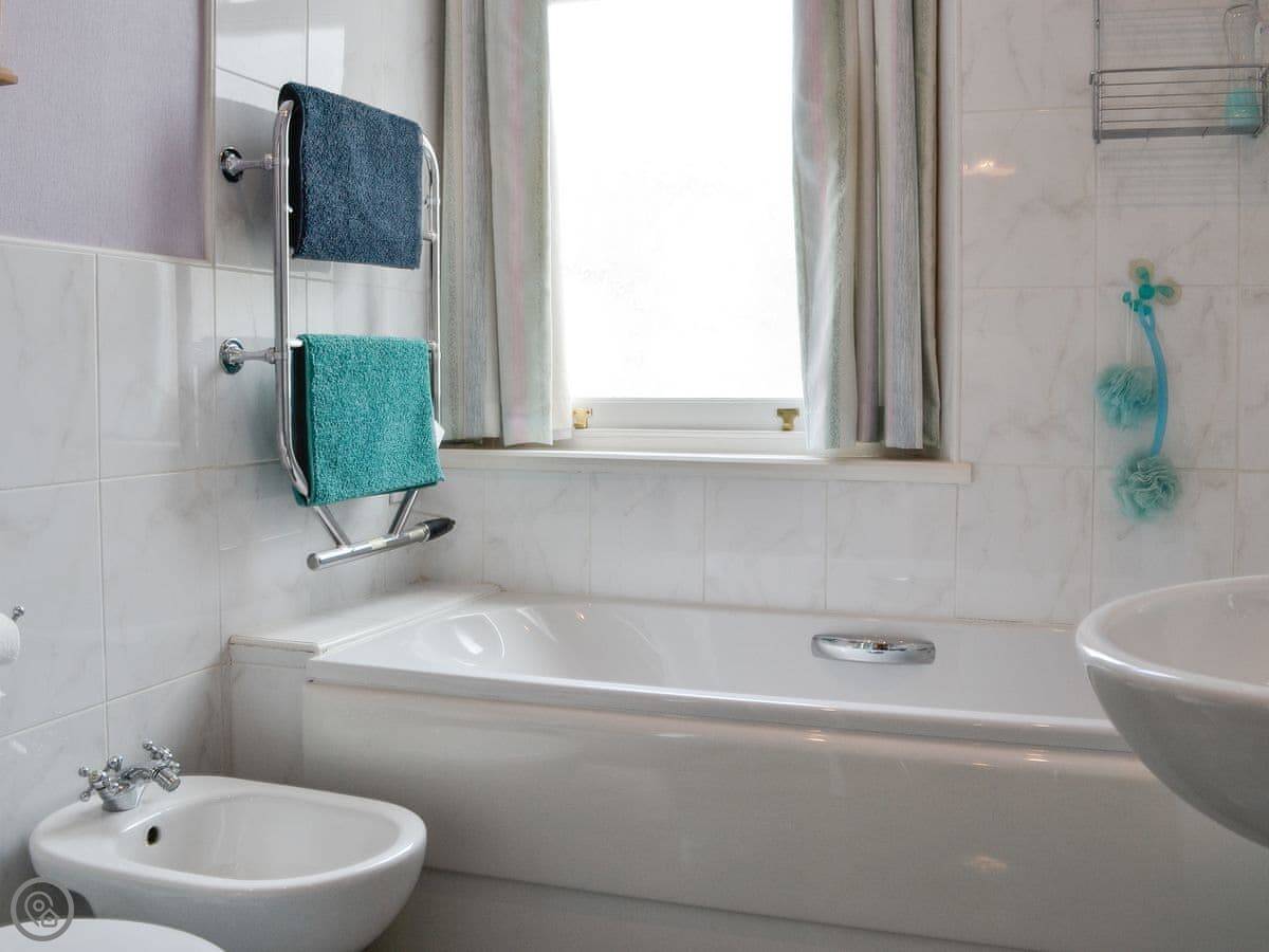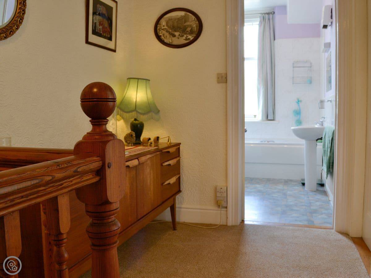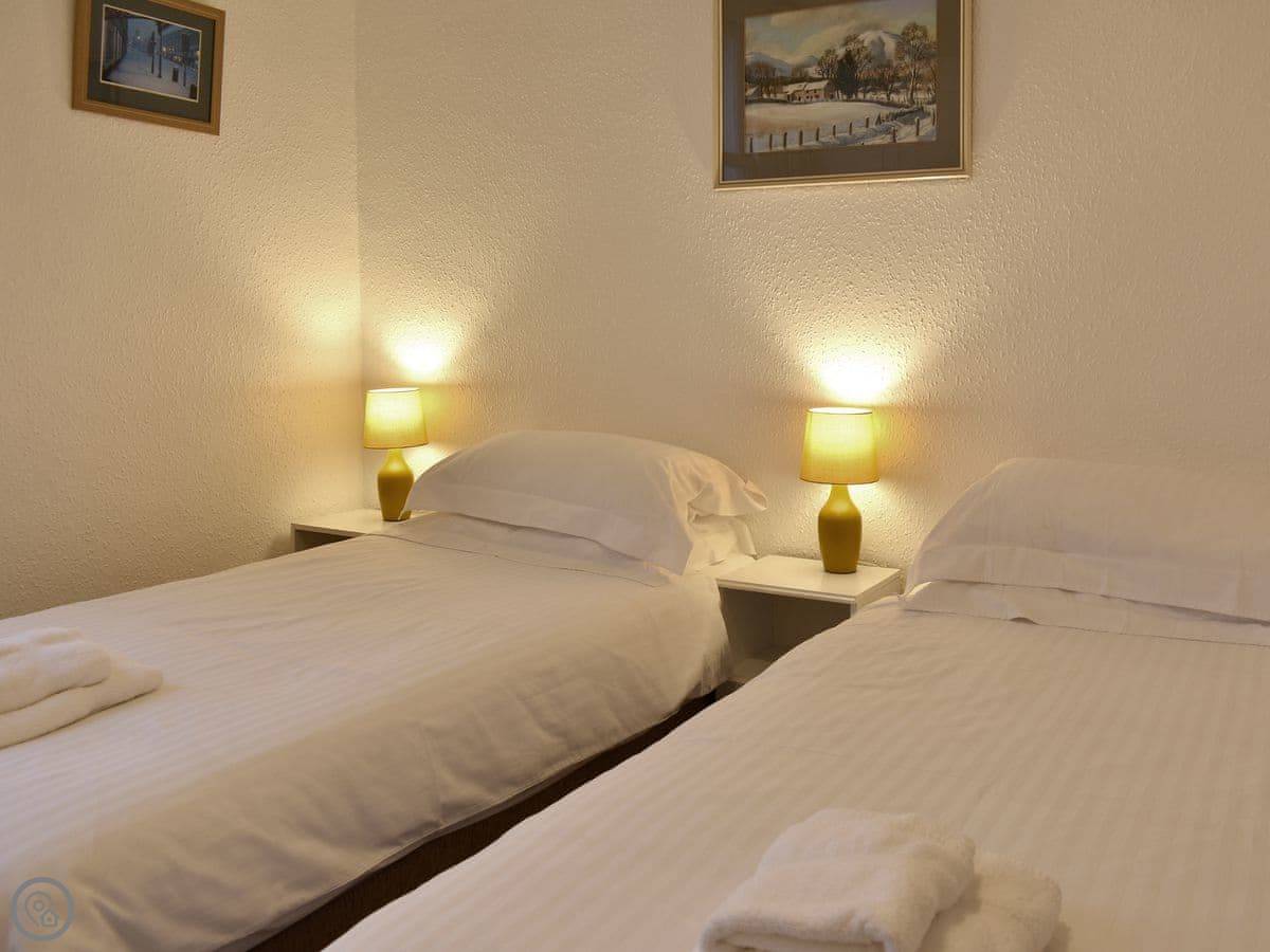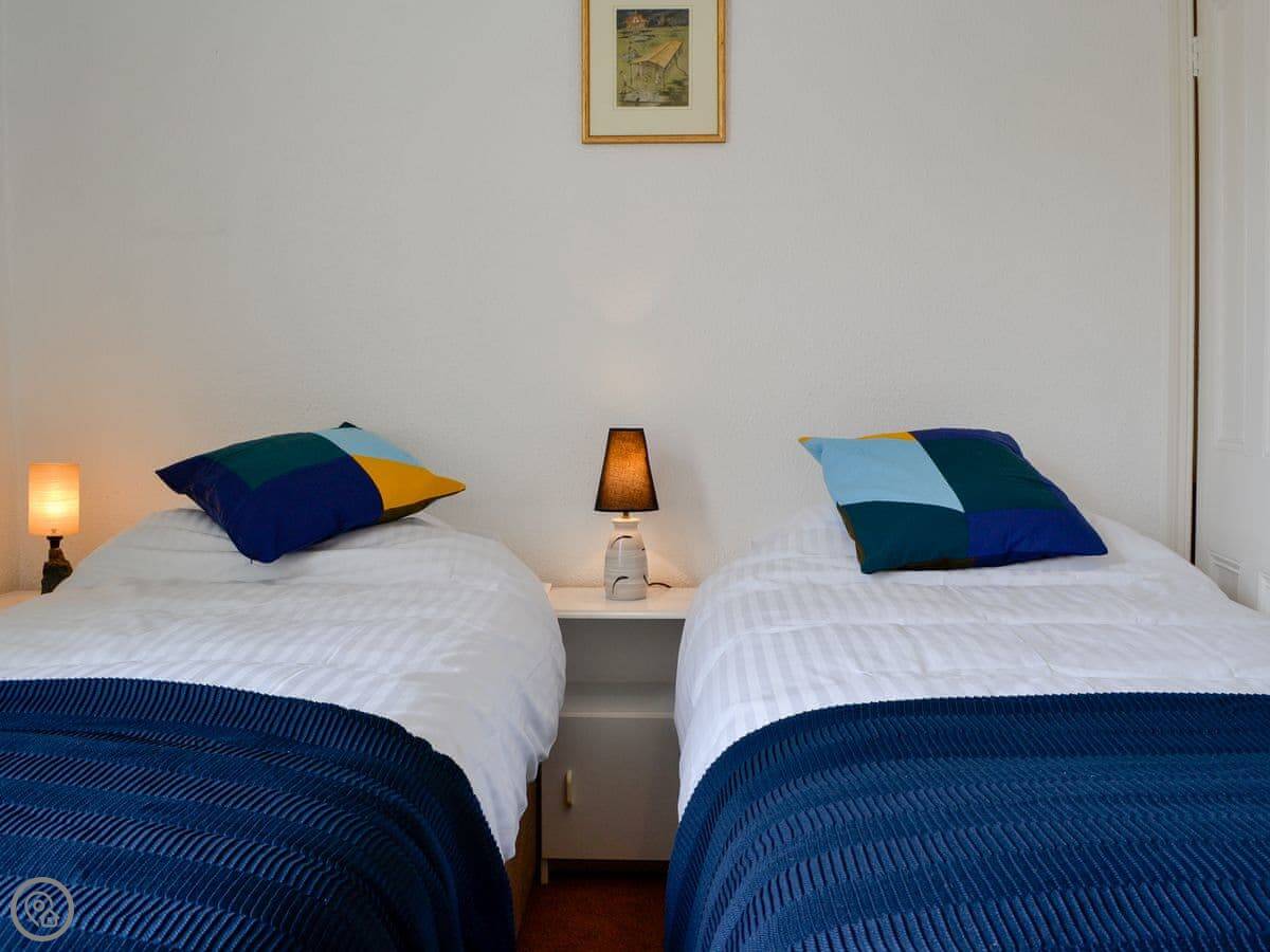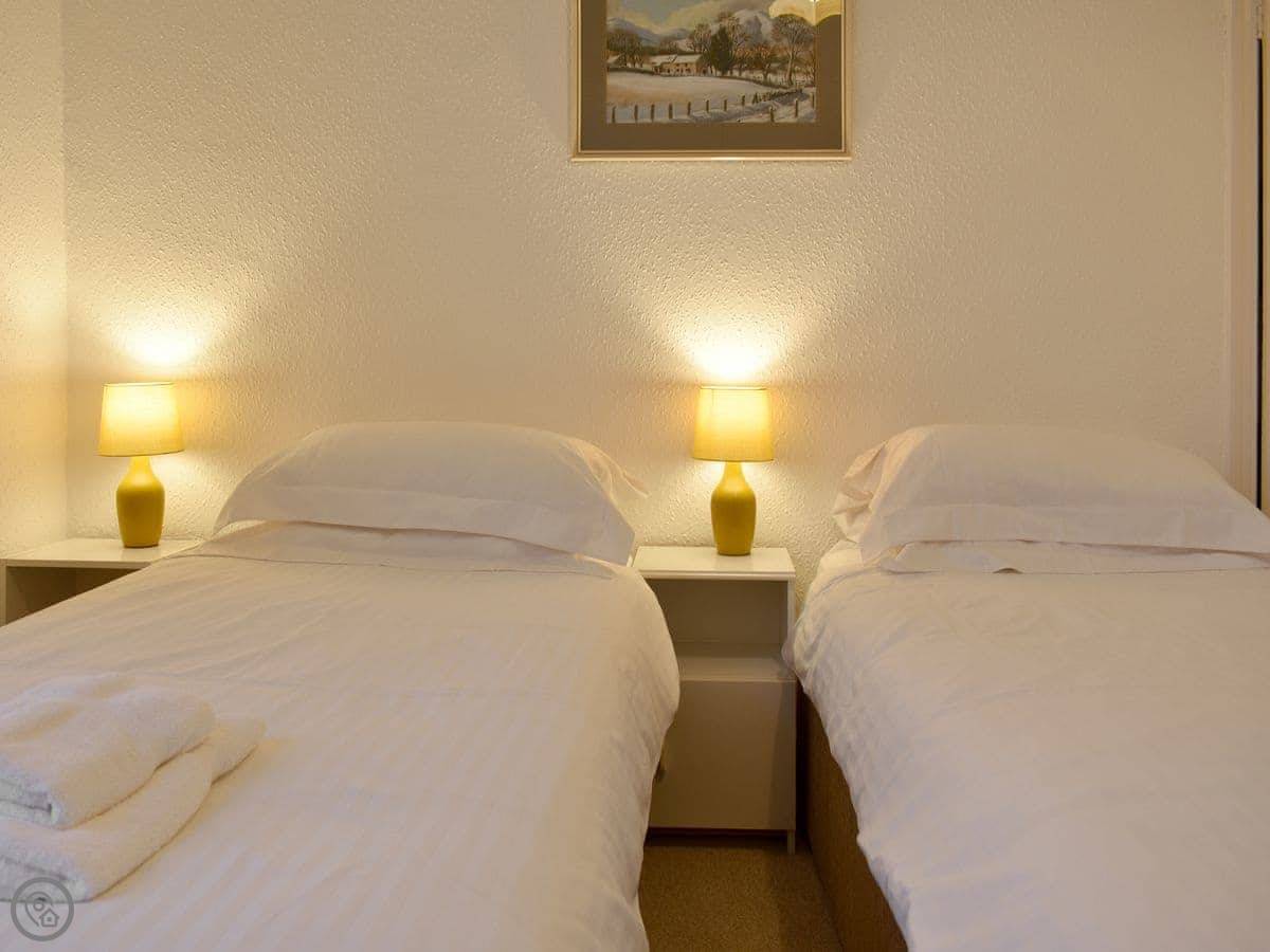 It sleeps five. Three bedrooms upstairs: a double, a twin, and a single. There's one bathroom with a bath and a separate shower cubicle, plus a downstairs loo. It's got a 3 Star rating. It's clean and practical, not luxury. The ceilings are high so it feels quite spacious inside.