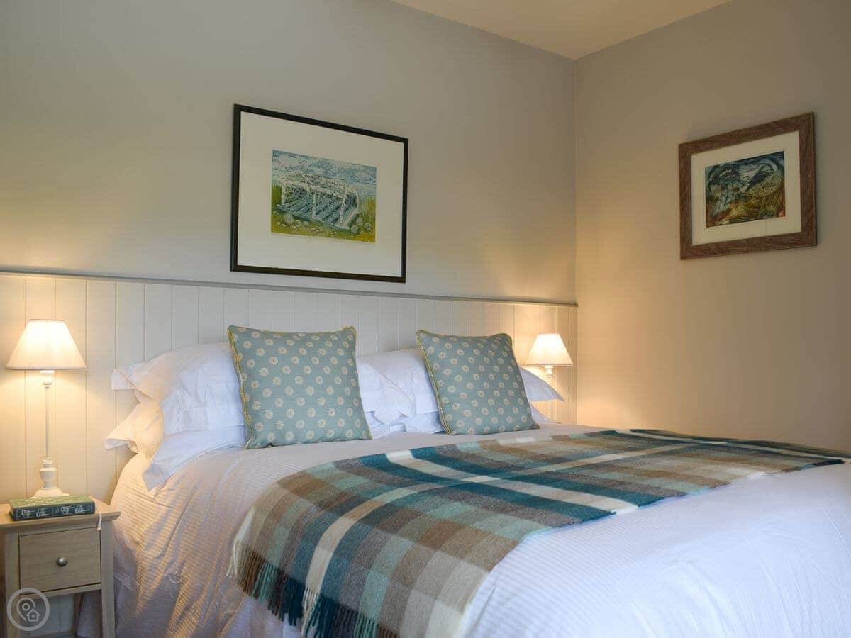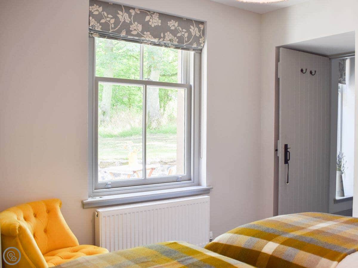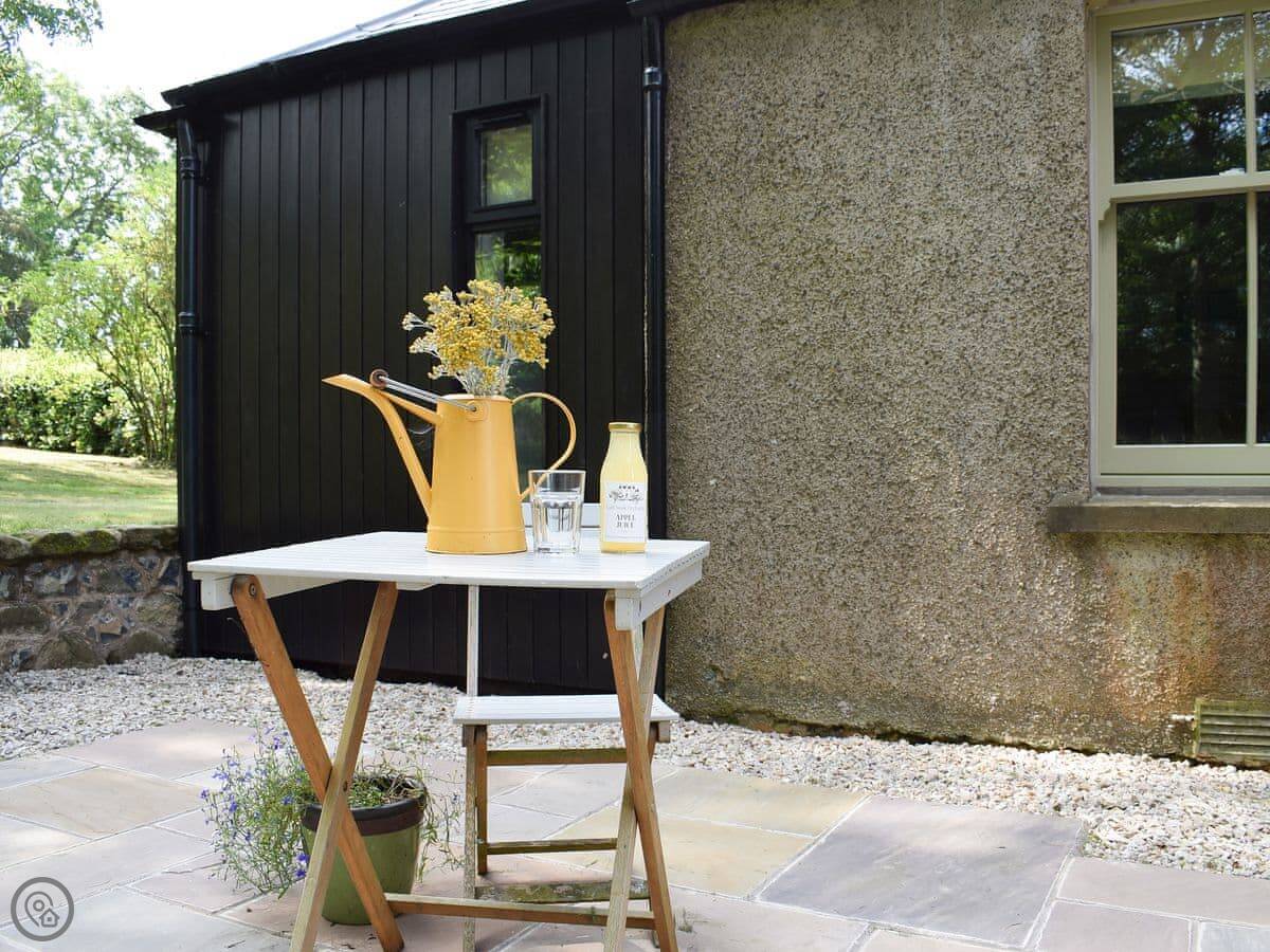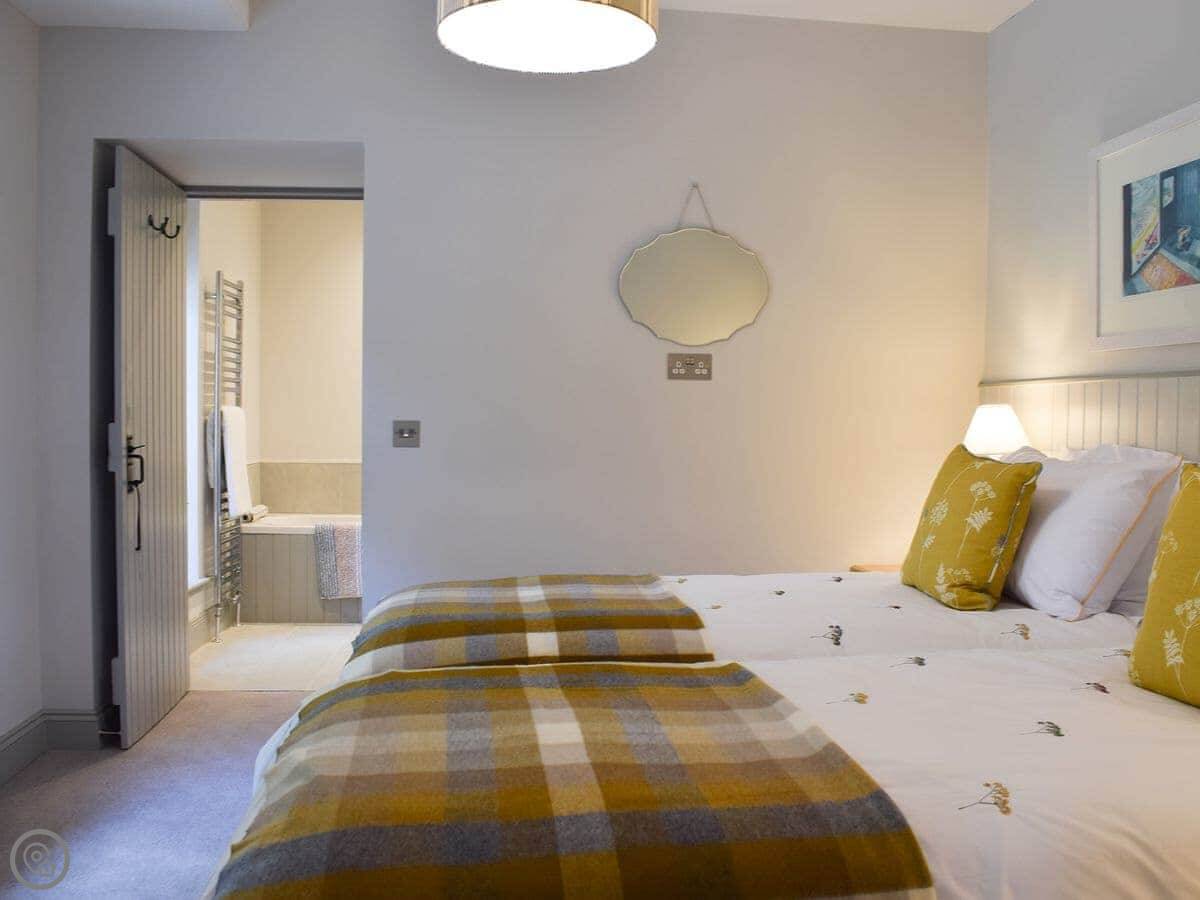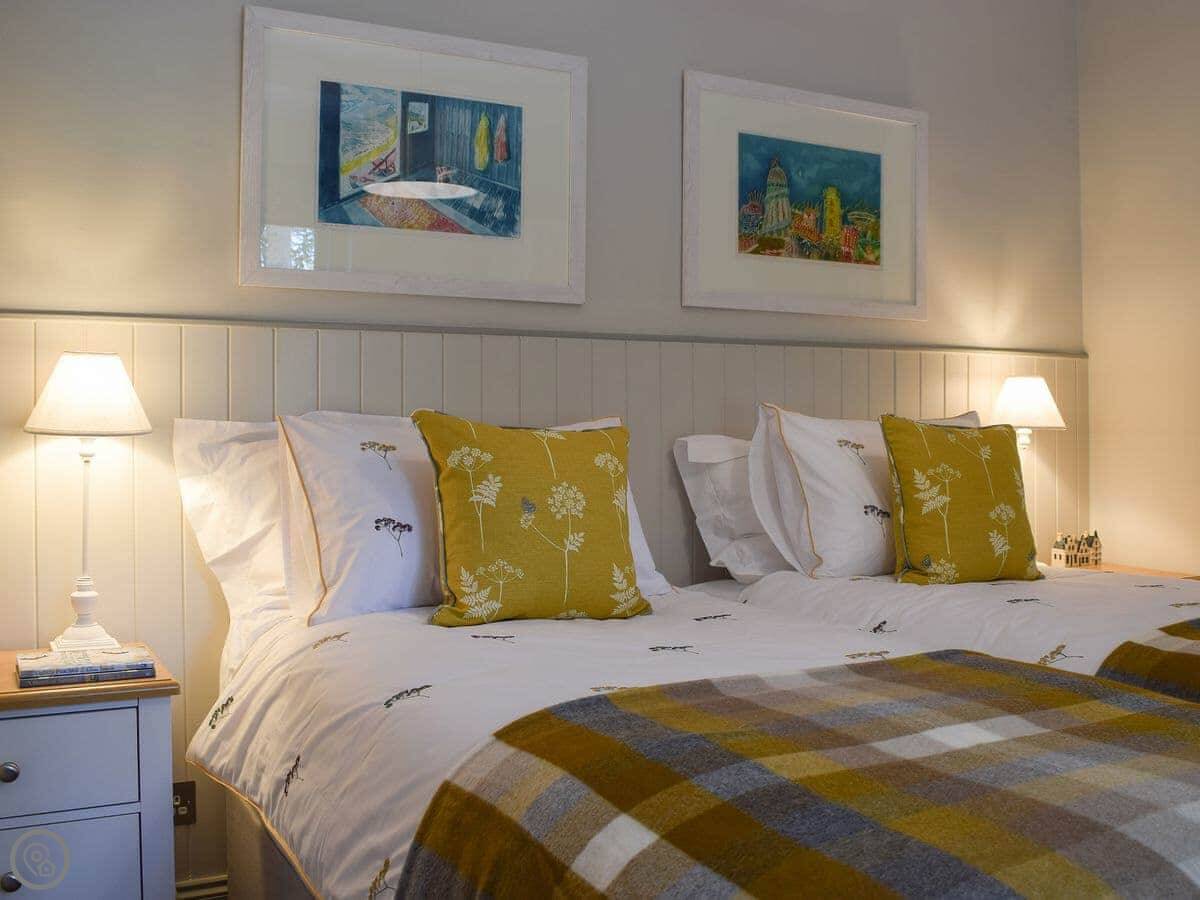 It sleeps four. Two bedrooms, both with their own ensuite bathrooms. It's a 5 Star place, so it's comfortable and well-equipped. There's underfloor heating and a wood burner. The garden has a patio with seating. You can see the reservoir from there.