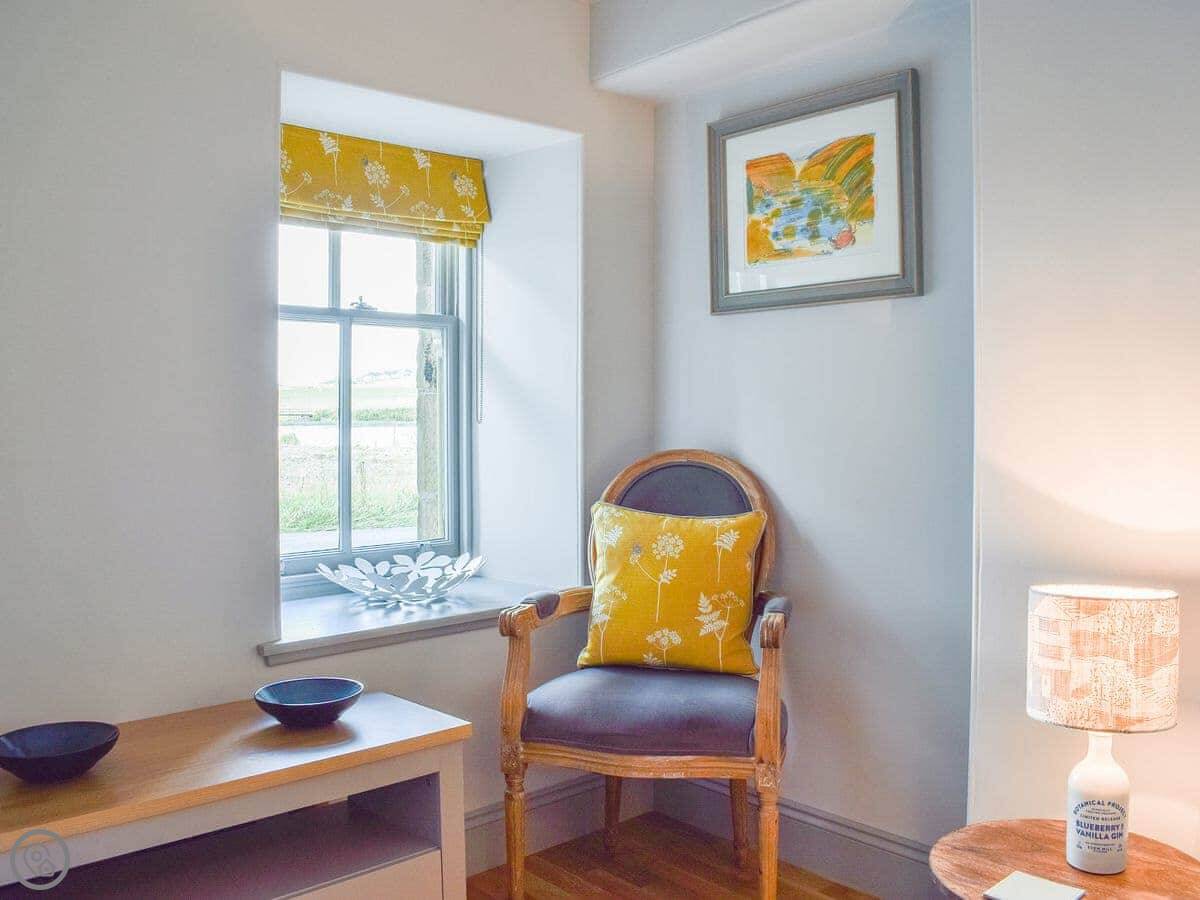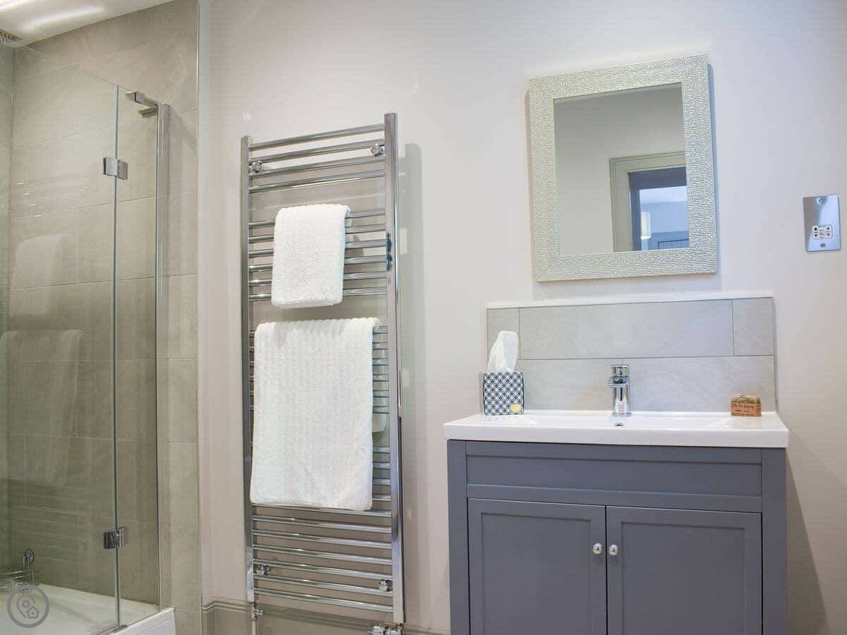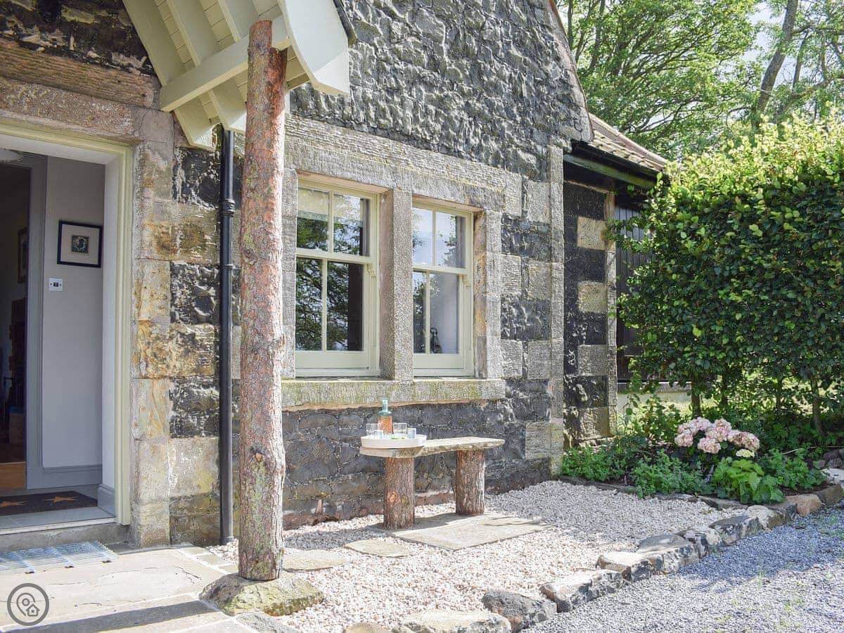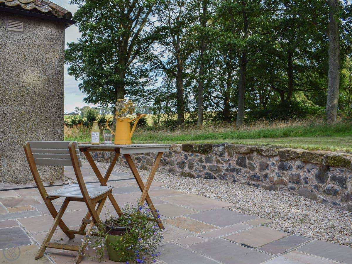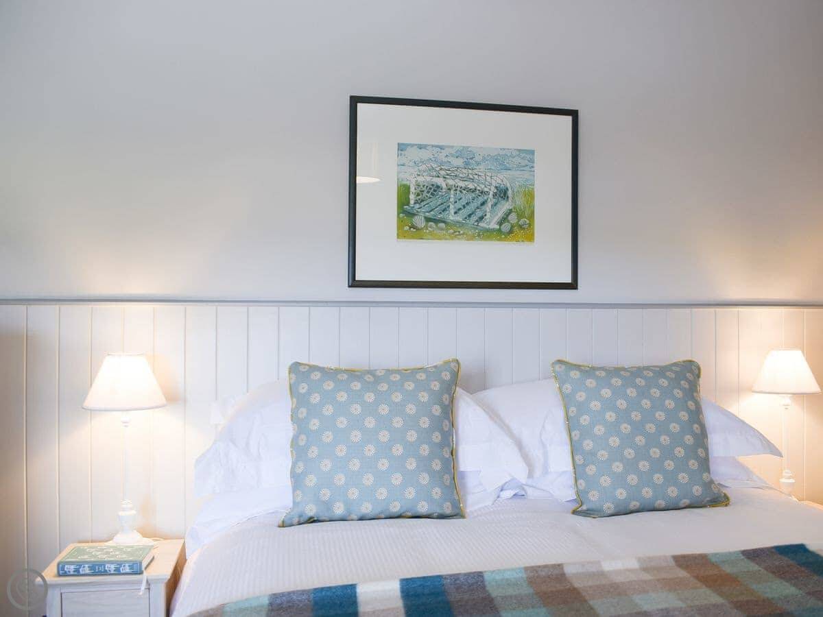 It sleeps four. Two bedrooms, both with their own ensuite bathrooms. It's a 5 Star place, so it's comfortable and well-equipped. There's underfloor heating and a wood burner. The garden has a patio with seating. You can see the reservoir from there.