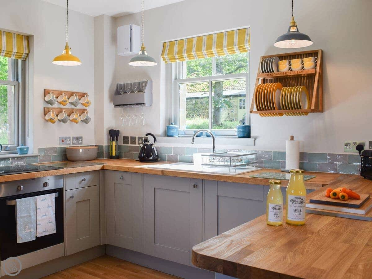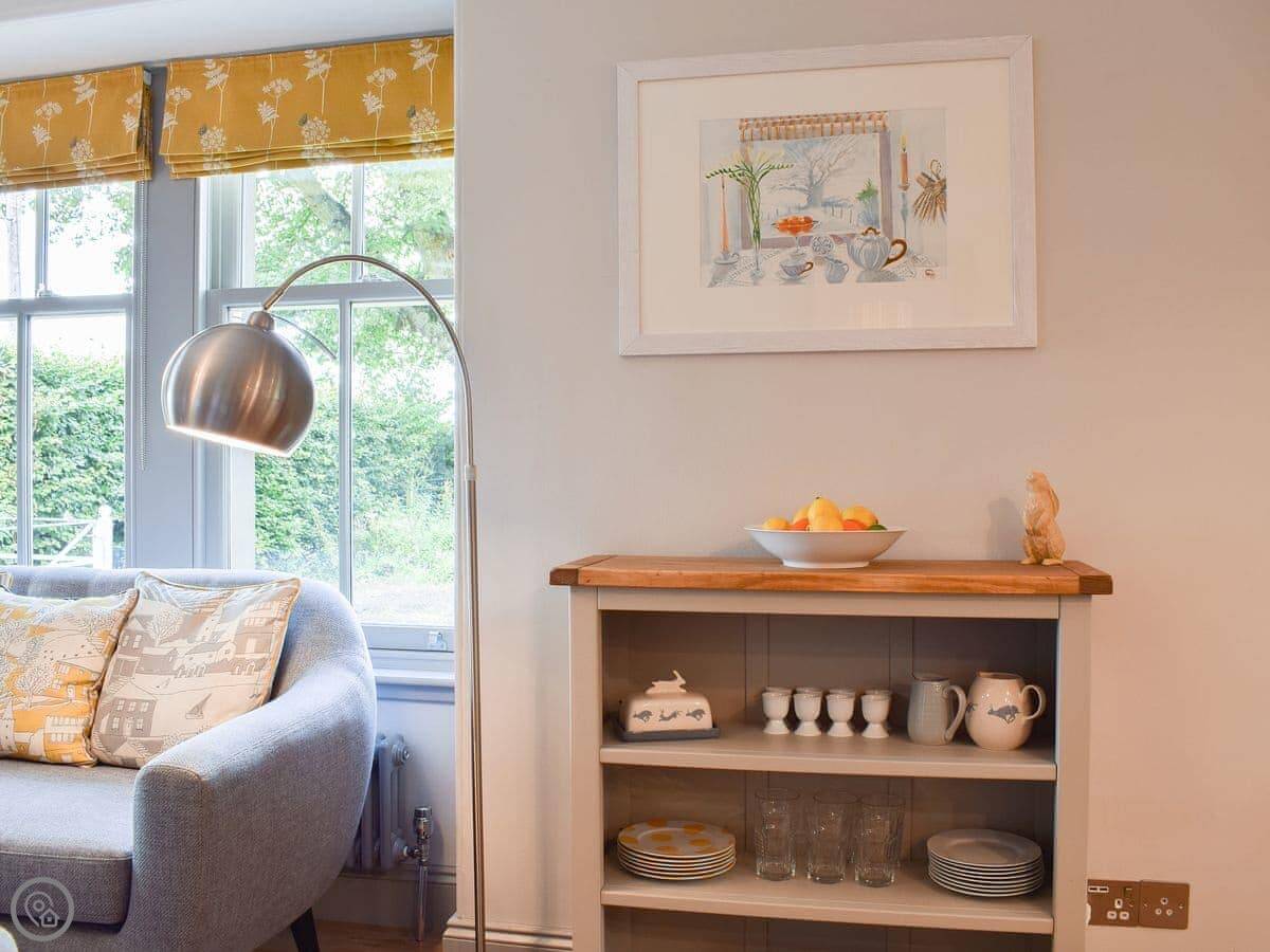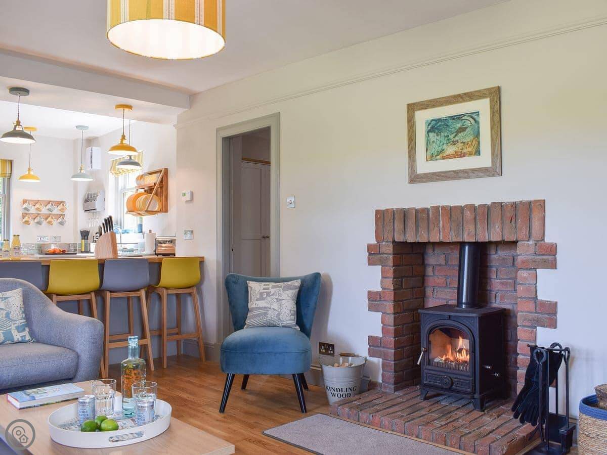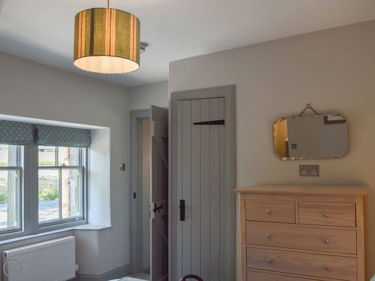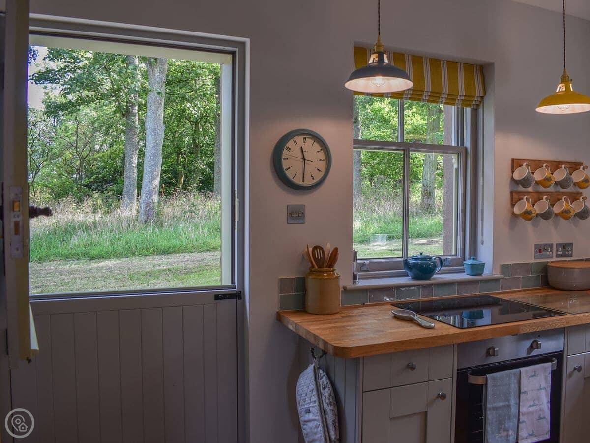 It sleeps four. Two bedrooms, both with their own ensuite bathrooms. It's a 5 Star place, so it's comfortable and well-equipped. There's underfloor heating and a wood burner. The garden has a patio with seating. You can see the reservoir from there.