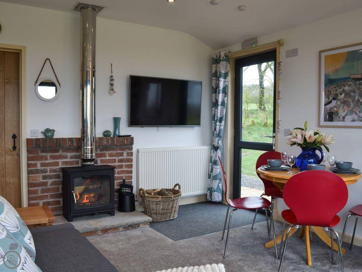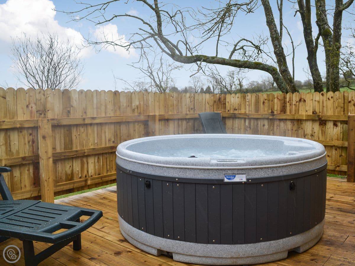 It’s open plan, so the living room, kitchen and dining area are all together. There’s a wood burner. The kitchen has a dishwasher and a washing machine. The doors open out onto a deck with a hot tub.