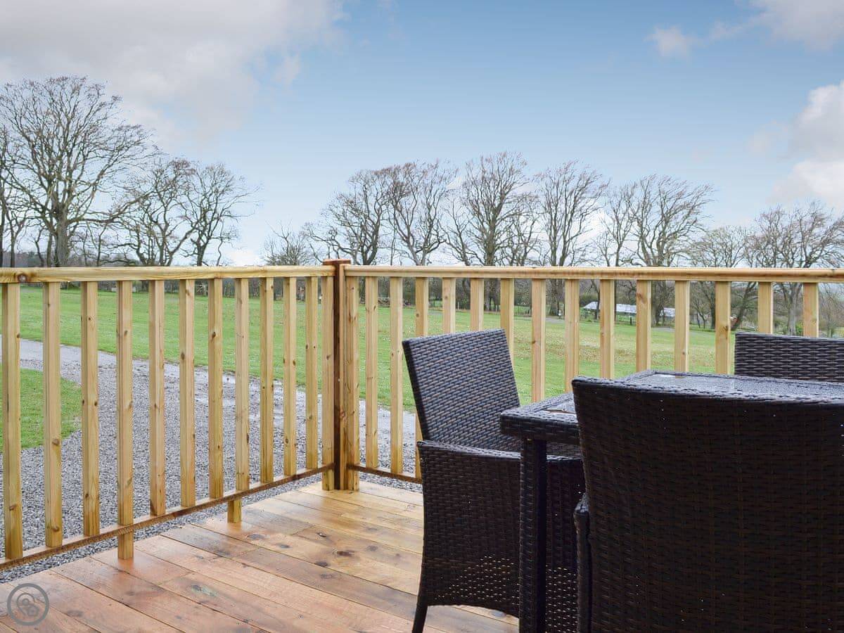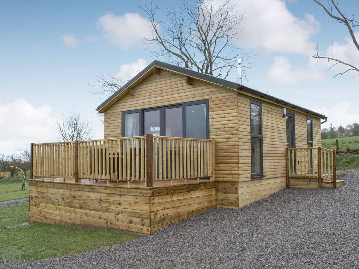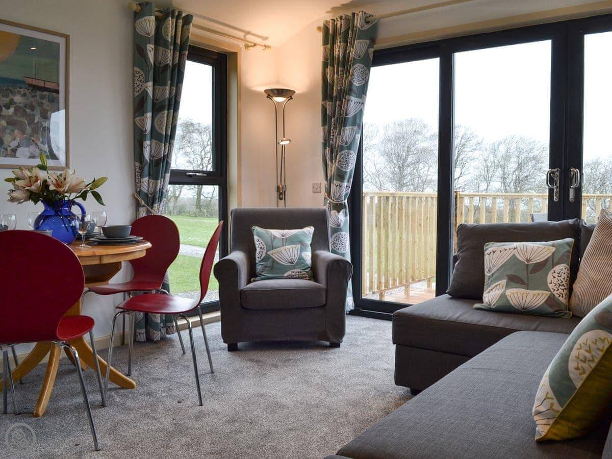 Osprey Lodge is on a small campsite near Brocklebank. It’s one of a row of detached lodges. It looks out over fields towards the Solway Coast.