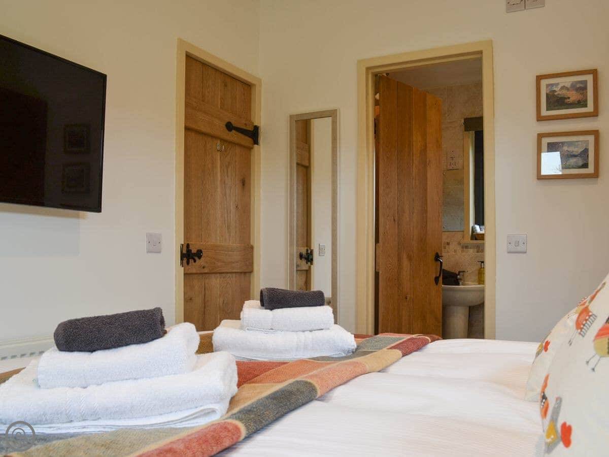 It sleeps two. There's one bedroom with a kingsize bed and an en-suite shower. It’s got a 4 Star rating, which means it's comfortable and well looked after. Everything is on one level.