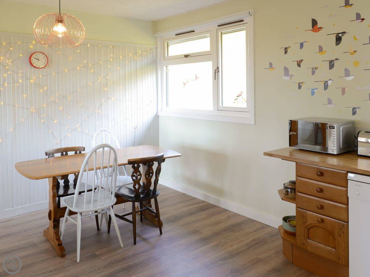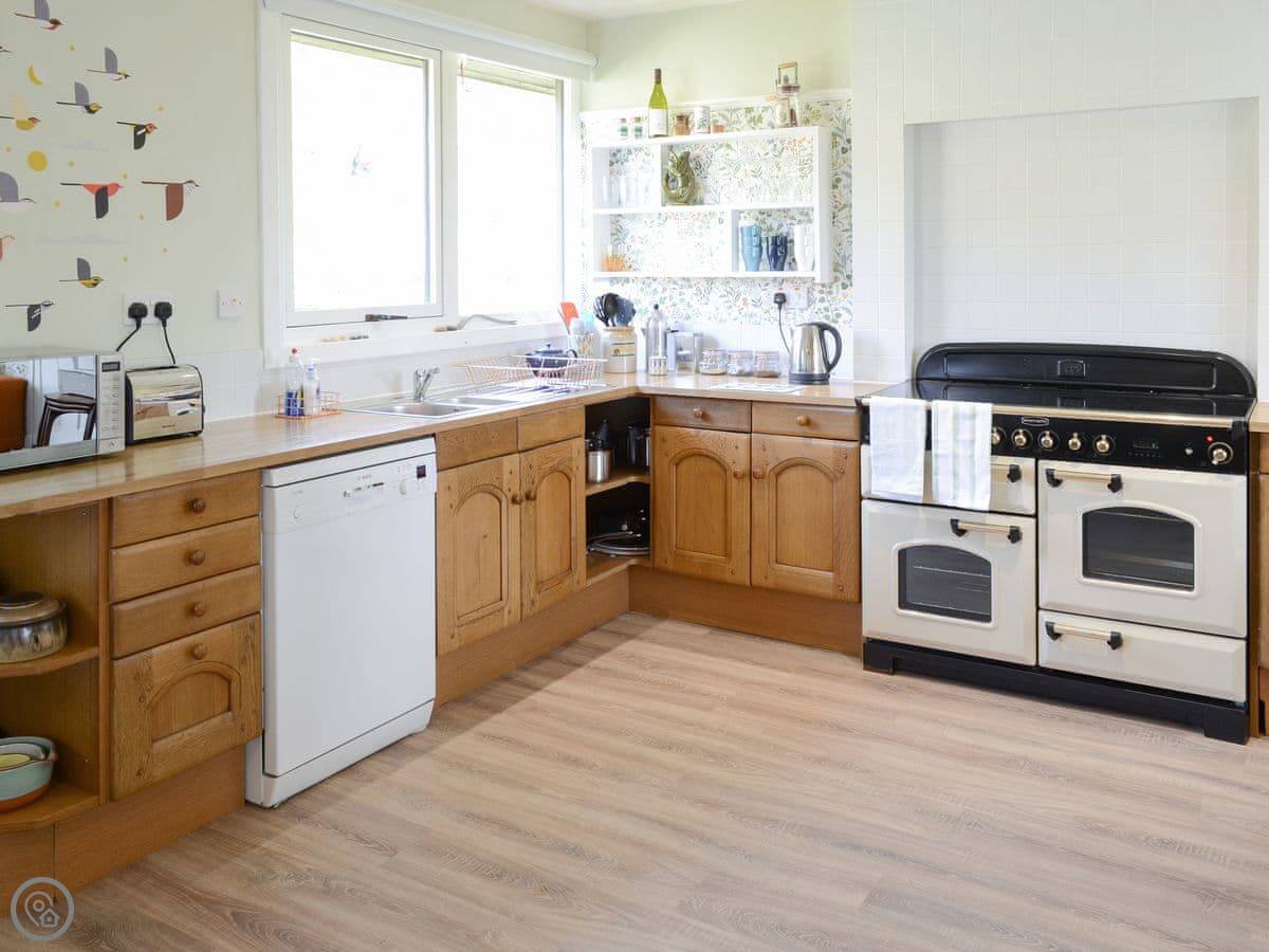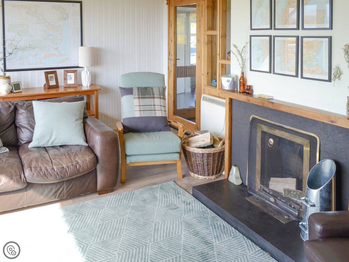 It's a horseshoe-shaped room with an original open fireplace in the middle. There's an electric fire inside it now for extra heat. The kitchen is modern, with a Rangemaster. There's a sun room off the back, good for watching the garden. We get a lot of birds. Goldfinches, curlews, that sort of thing. Deer sometimes. There's a pond.