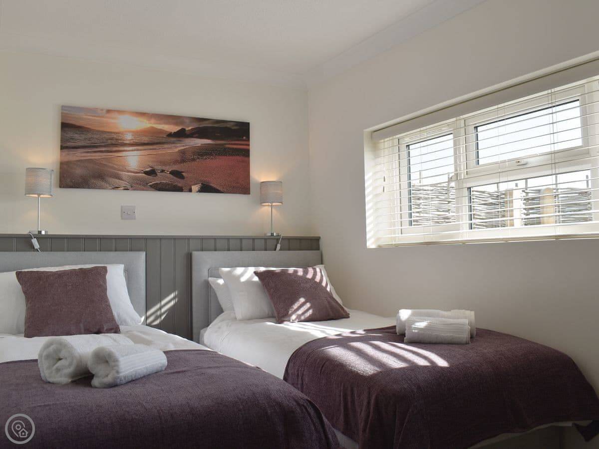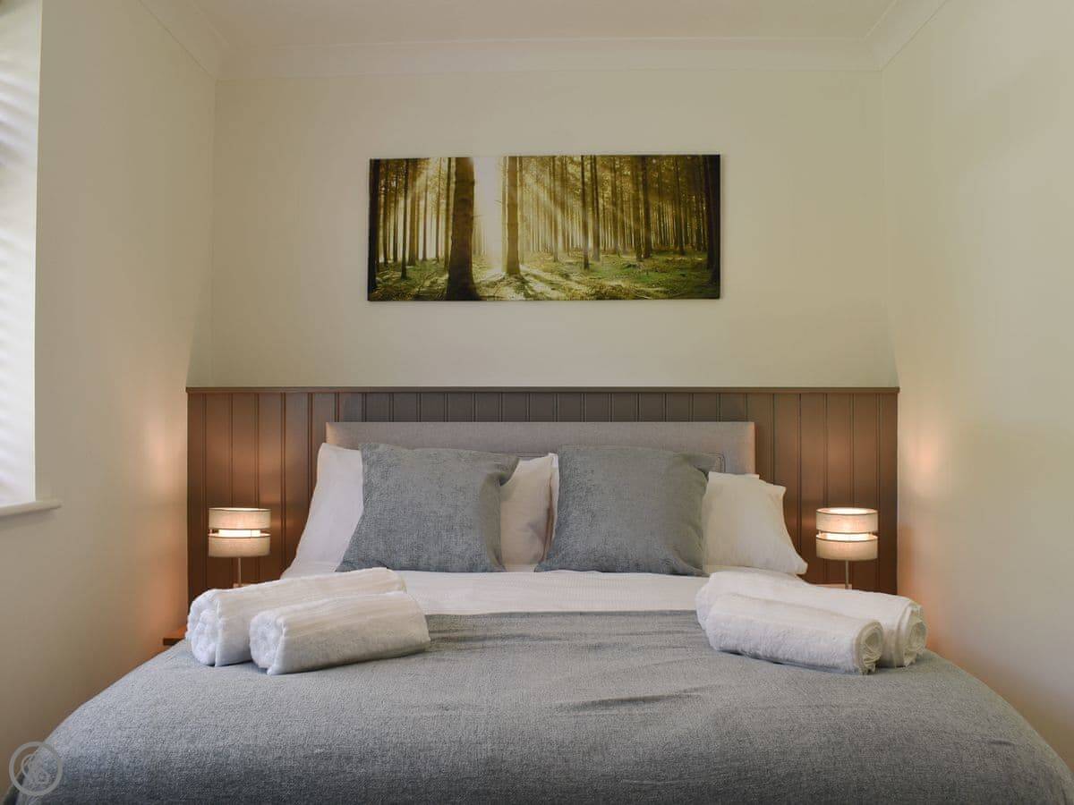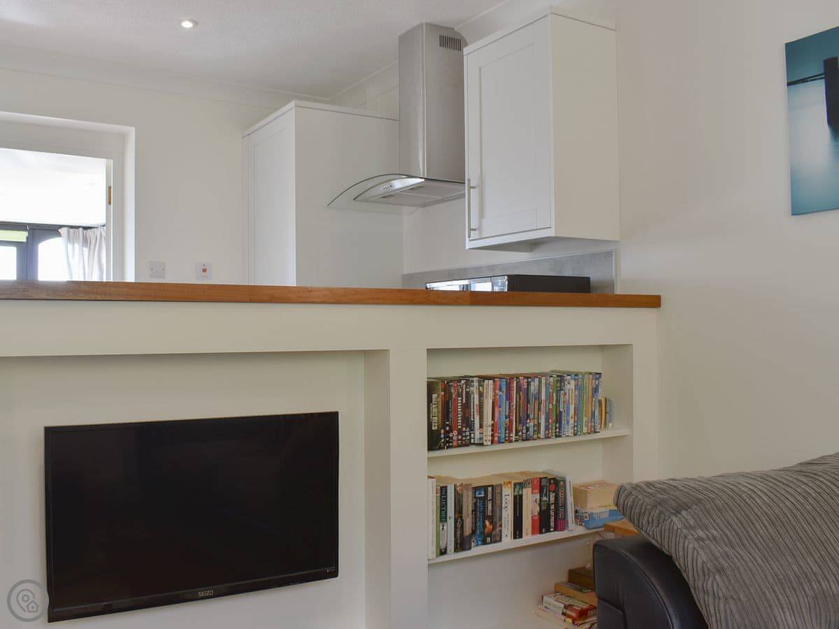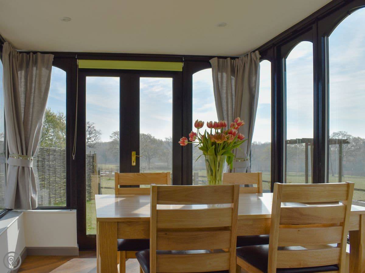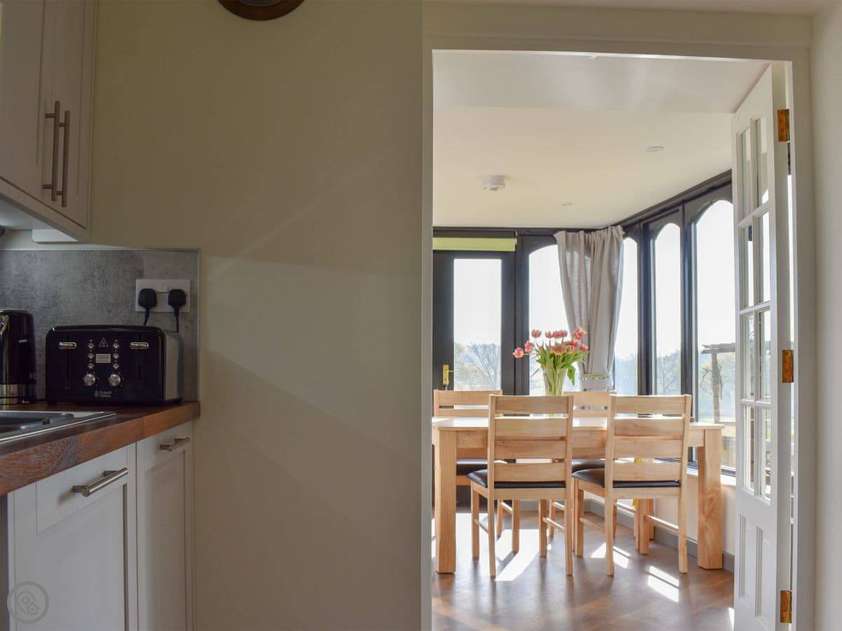 It sleeps four. Two bedrooms, one bathroom, and it's got a 4 Star rating. It's modern inside and everything's clean. The kitchen leads into the dining room. You can see the garden from there. There's a field next door with some alpacas in it.