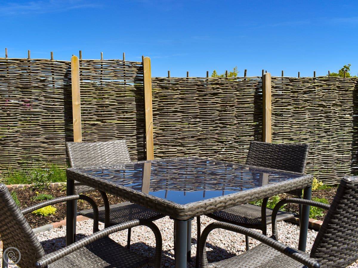 The garden is enclosed. There's a patio table and chairs out there.