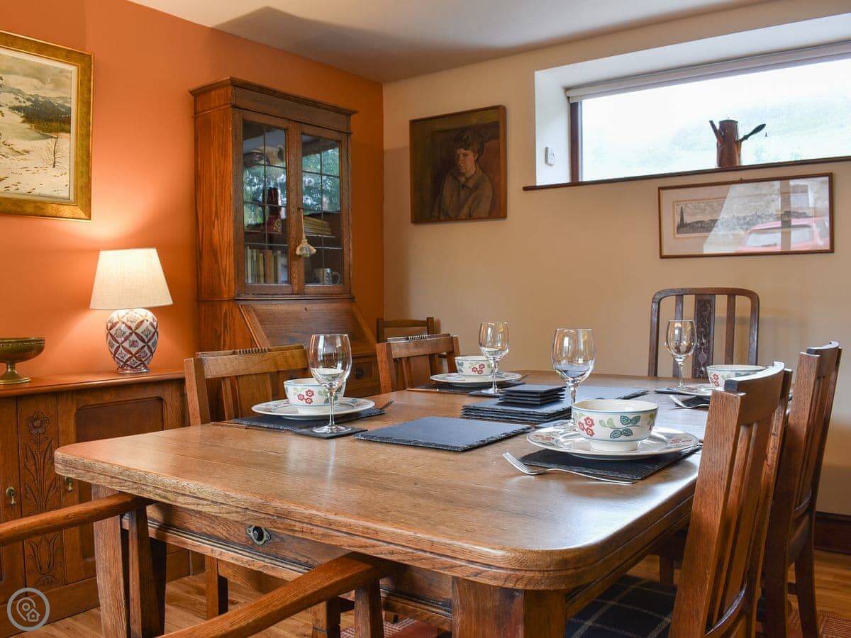 The main living space is all open plan. Kitchen, dining, and sitting area together. There's an open fire. The layout is a bit of an L-shape, so the twin bedroom and one shower room are down a separate hallway. There's a utility room too, which is good for drying off after a walk.