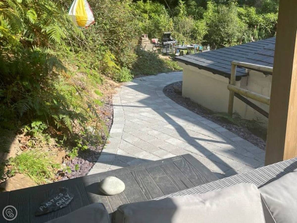The main thing is the space. The front garden is over an acre. It's not manicured, it's just a big, open field. Good for kids to run around in. There's a patio with a hot tub and a barbecue.