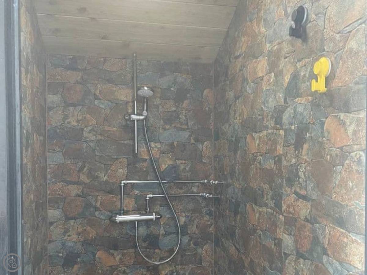 Inside, it's spacious. The living room has an open fire for cooler evenings. There's a TV, WiFi, a dishwasher and a washing machine.