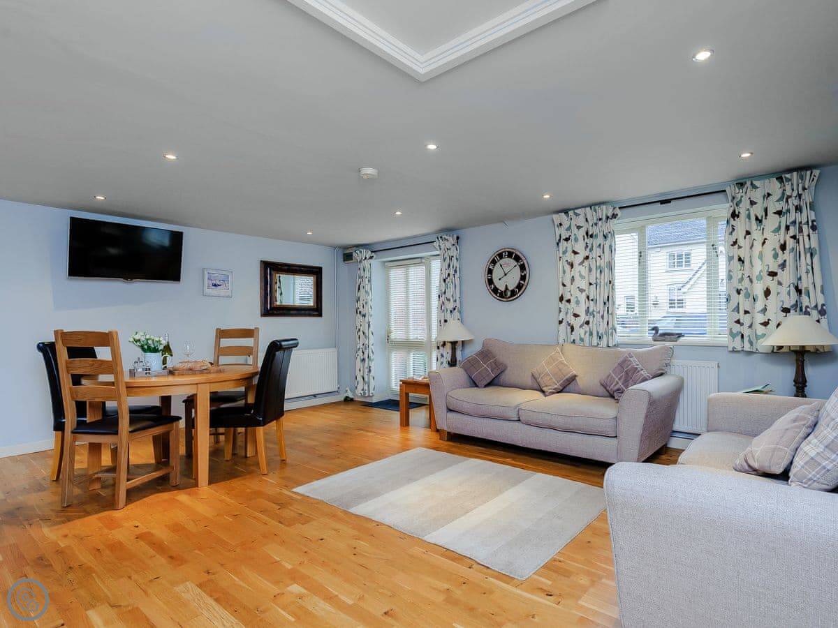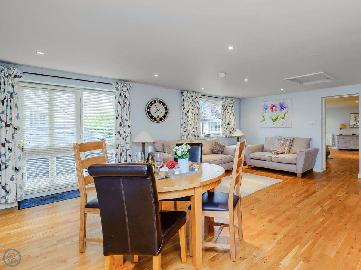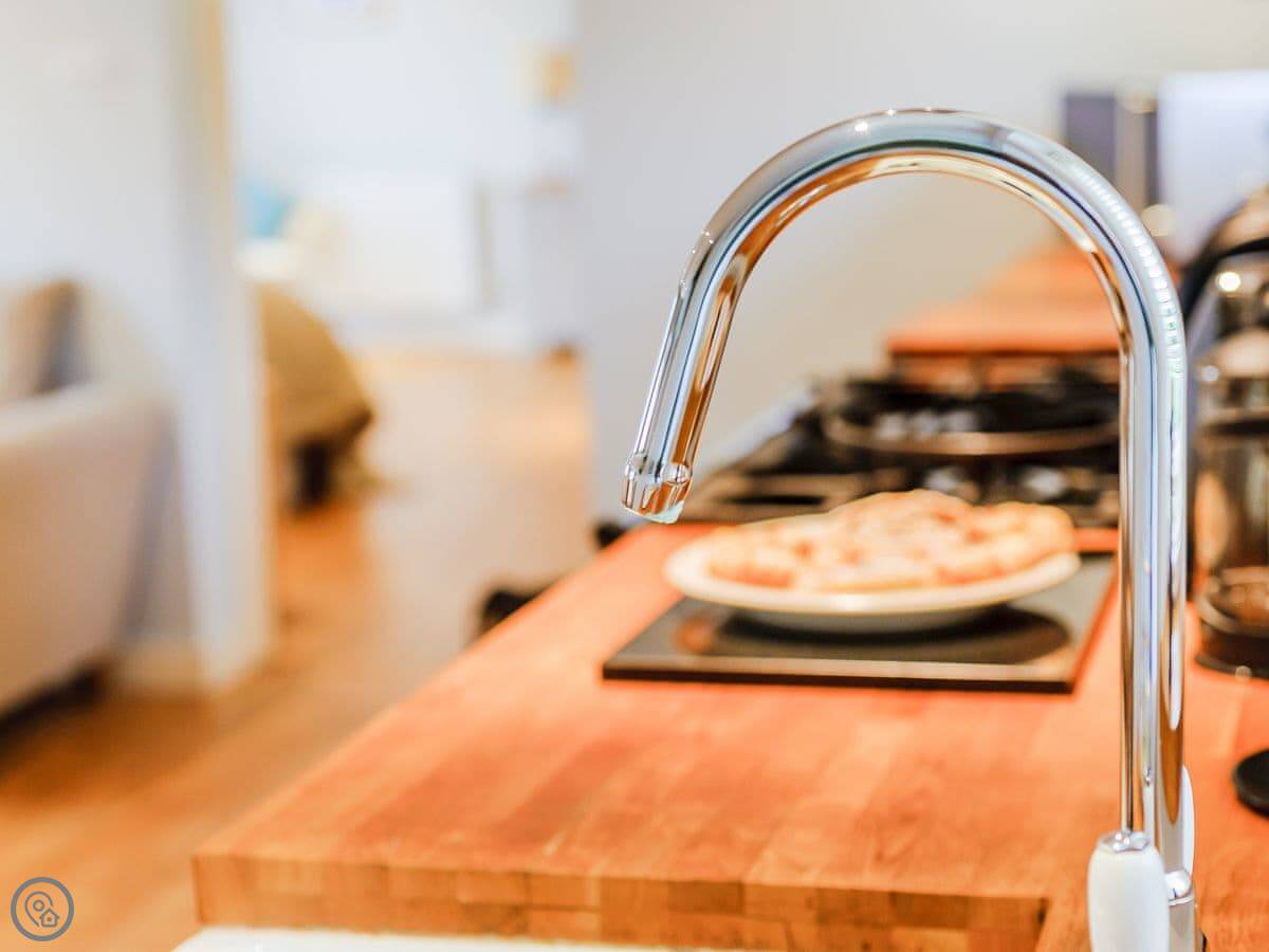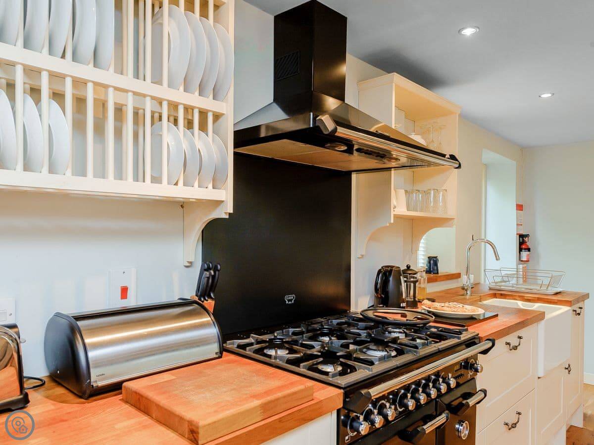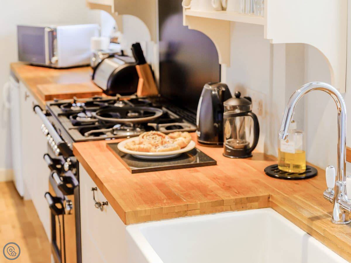 It sleeps three. There's one bedroom, but it's a good size. There's a double bed and a single bed in there. One bathroom with a shower and a bath. The main room is open plan. Kitchen, dining table, seating area. The wood burning stove works and they provide some logs. The range cooker is nice if you like cooking.
