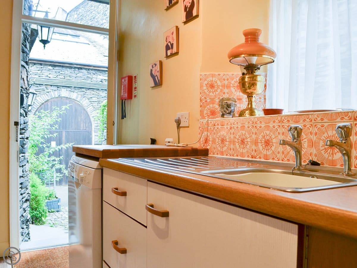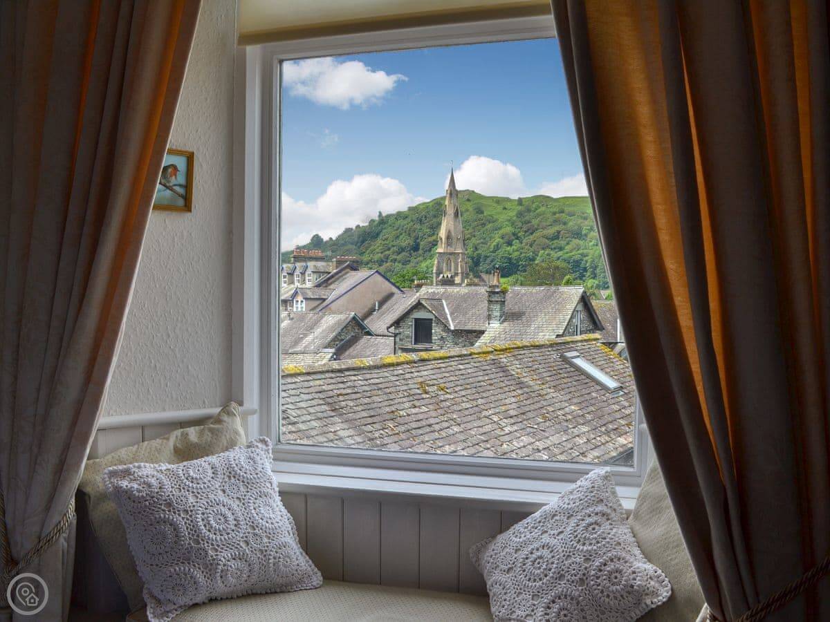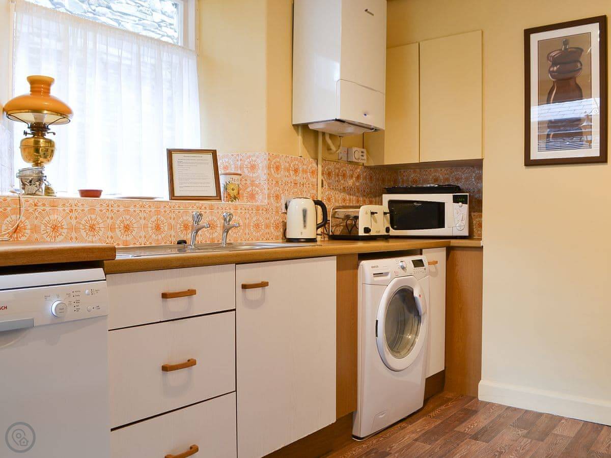 From the upstairs sitting room you get a view over the rooftops to Loughrigg Fell. The kitchen has a big table. There's a washing machine and a dishwasher.
