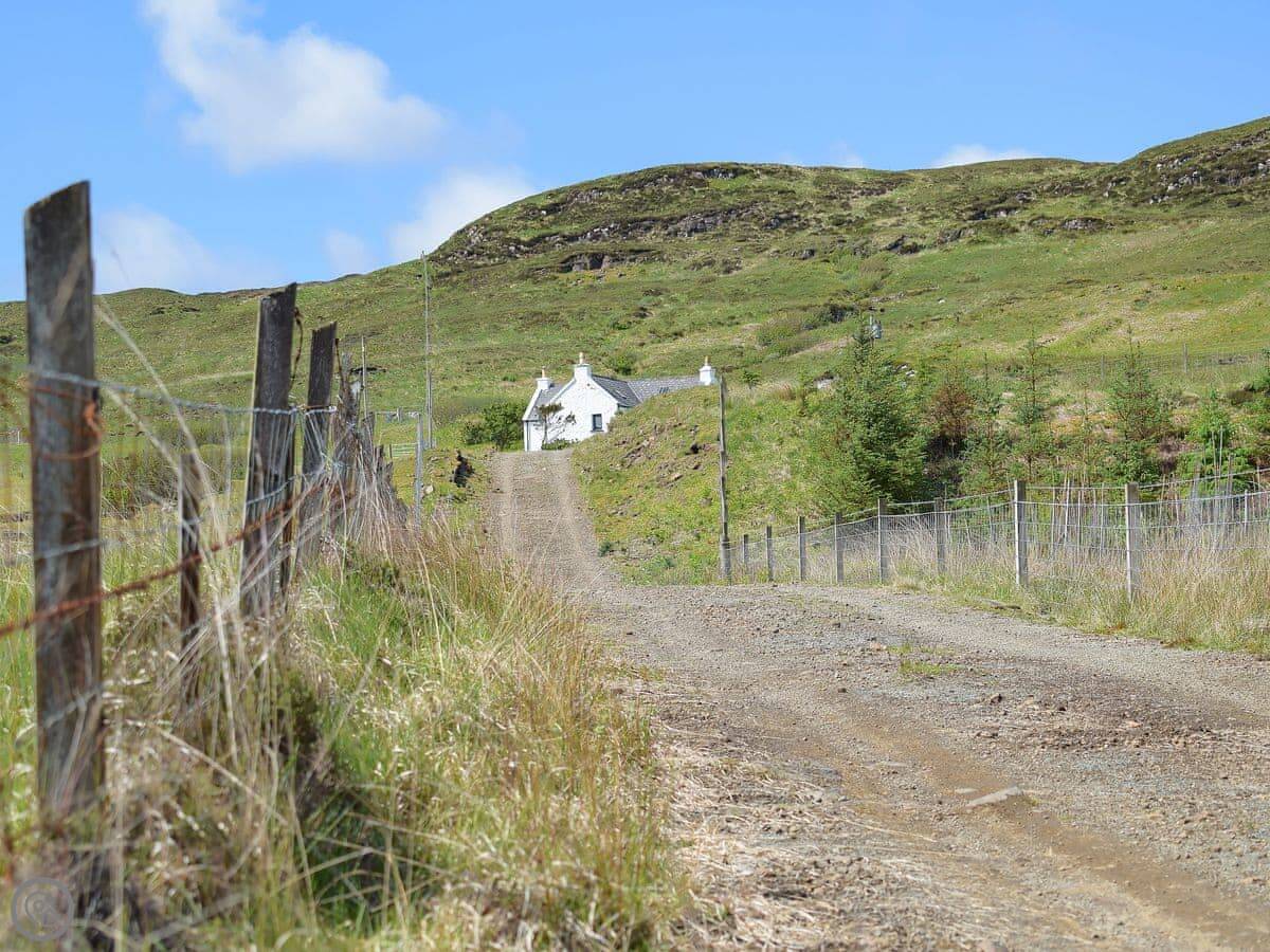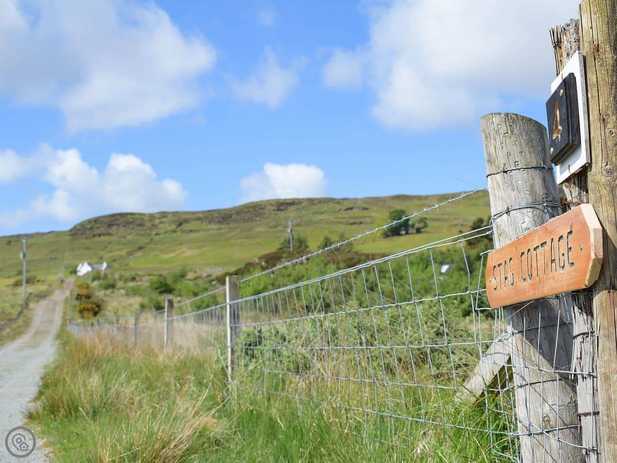 Stag Cottage is in Colbost, on the Isle of Skye. It's a small, white croft cottage up a private driveway, looking out over Loch Dunvegan. The views are good.