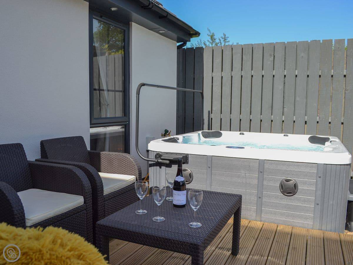 Outside, there's a deck with a hot tub. It's for six people, so there's room. The garden is enclosed.
