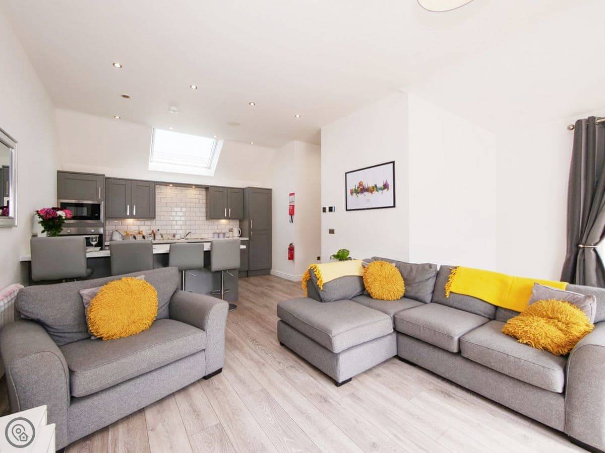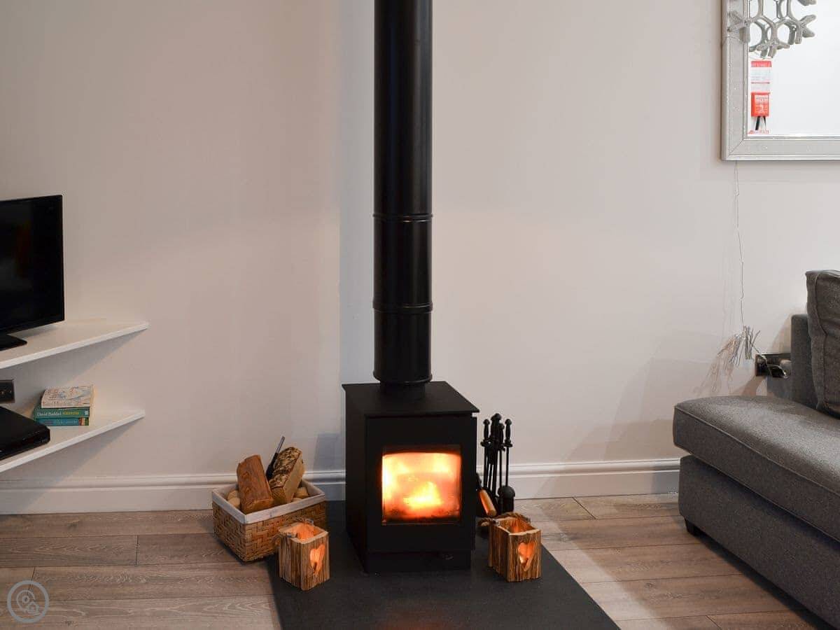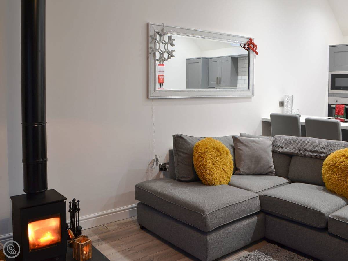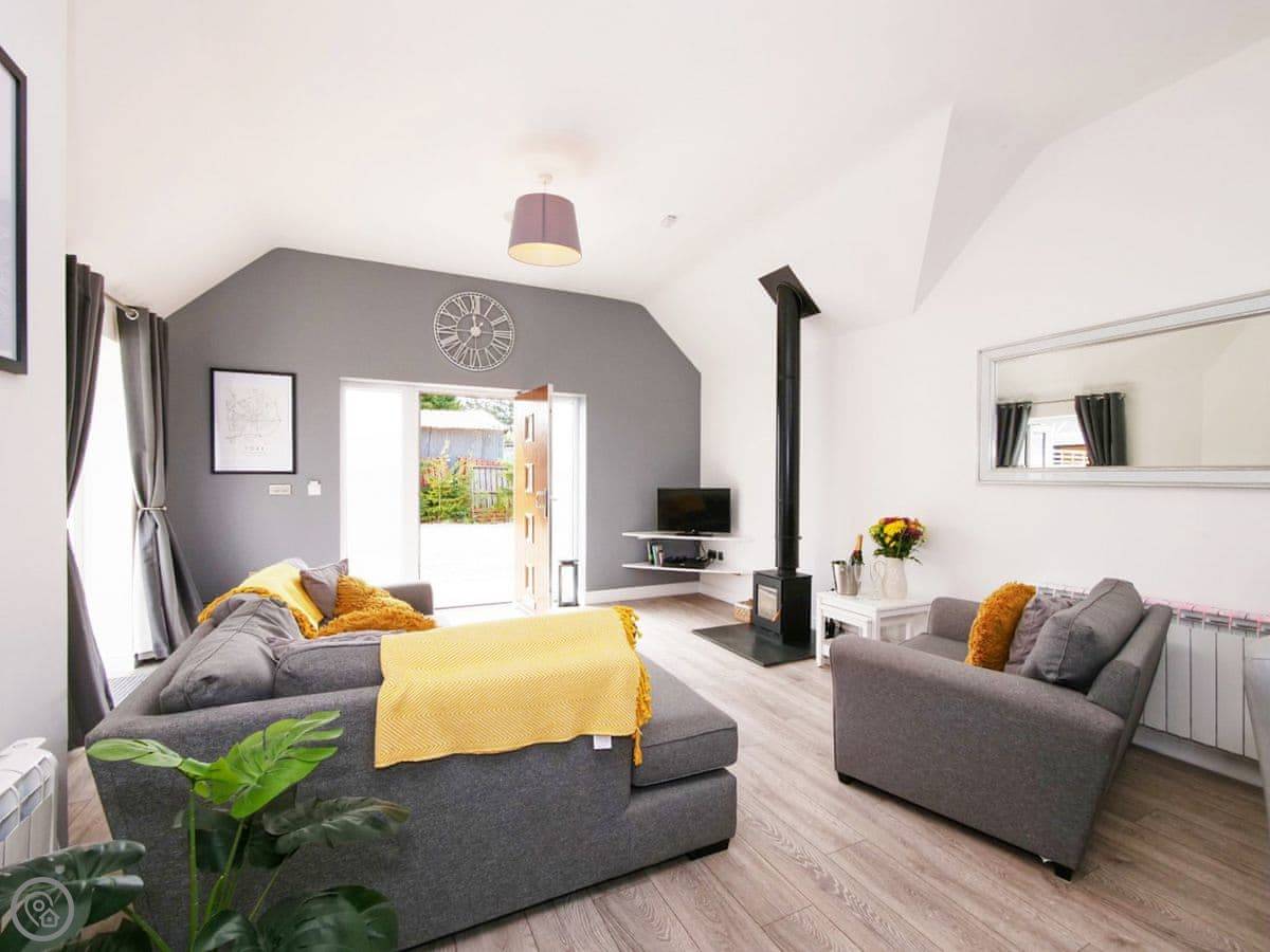 The main thing is it's new. It was built as a holiday let, so it's got things like underfloor heating, an open plan layout, and a wood burner. There's a sound system built into the ceiling. The windows are electric Velux ones. It's all very straightforward and modern.