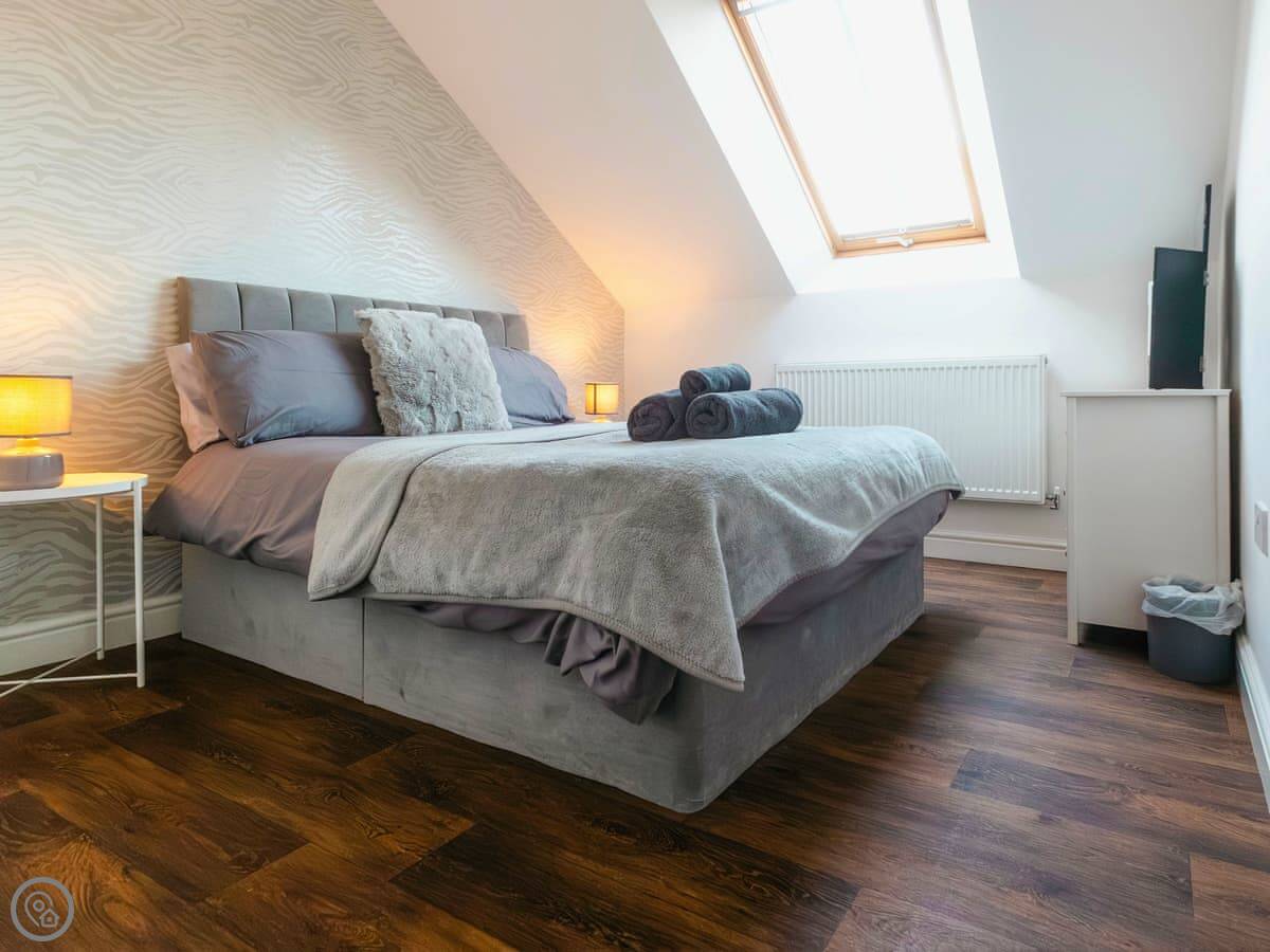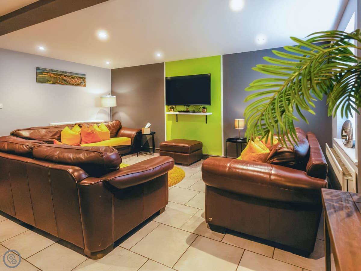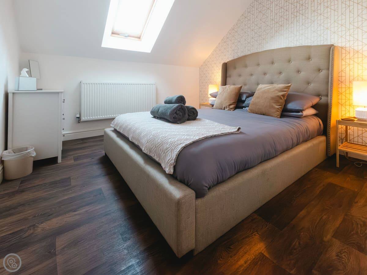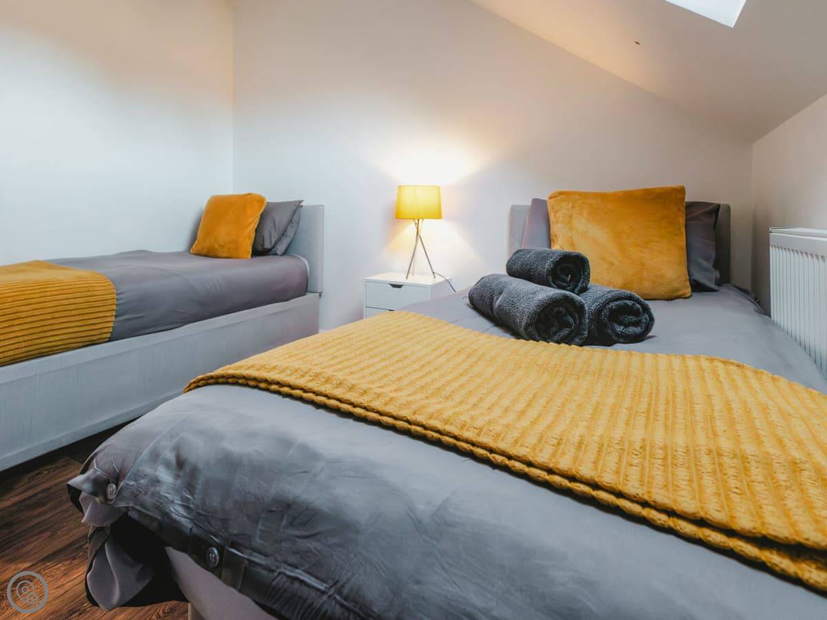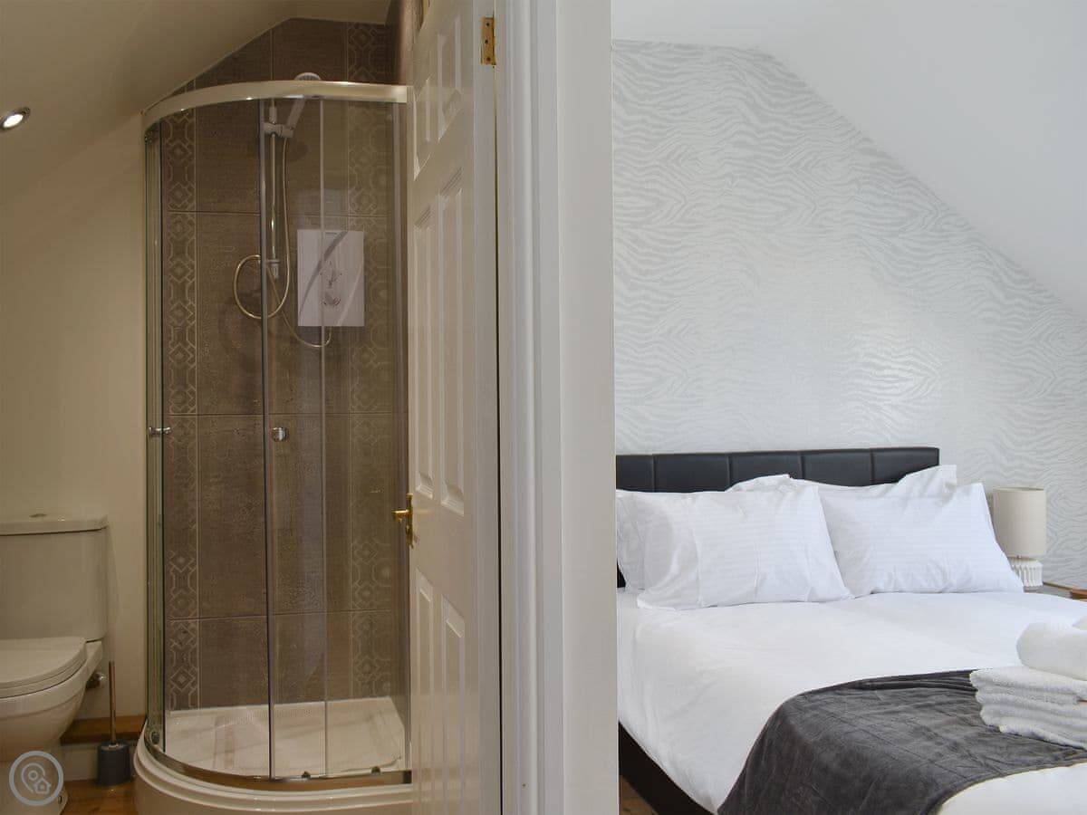 It sleeps ten people. Five bedrooms, three bathrooms. One bedroom and a wet room are on the ground floor. That could be useful if stairs are a problem. The stairs themselves are fine.