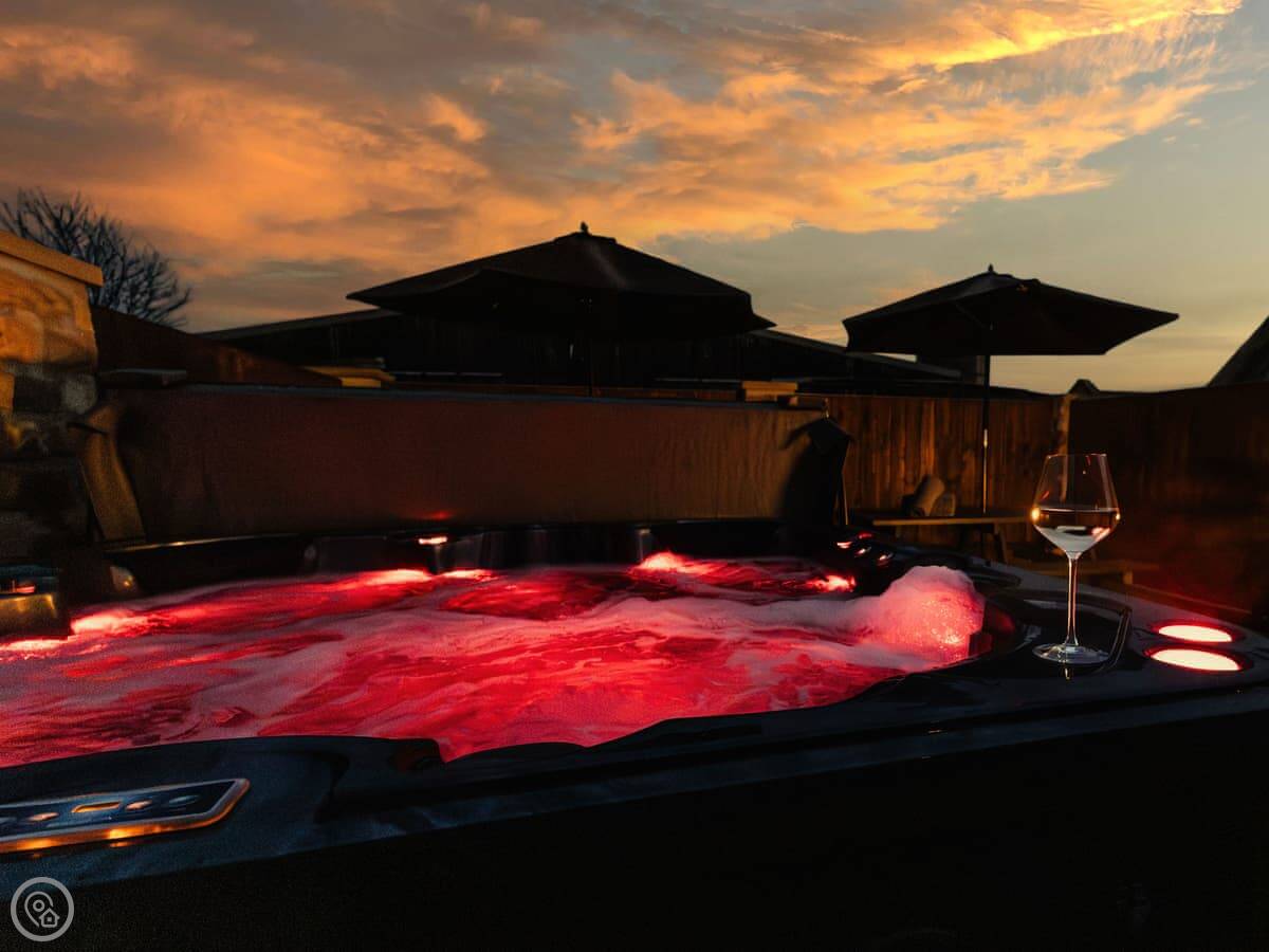 Outside the front door is a small courtyard with a table. For the hot tub, you use a separate private garden just a short walk from the cottage. It's got the tub, some more garden furniture, and a barbecue. It's fenced.