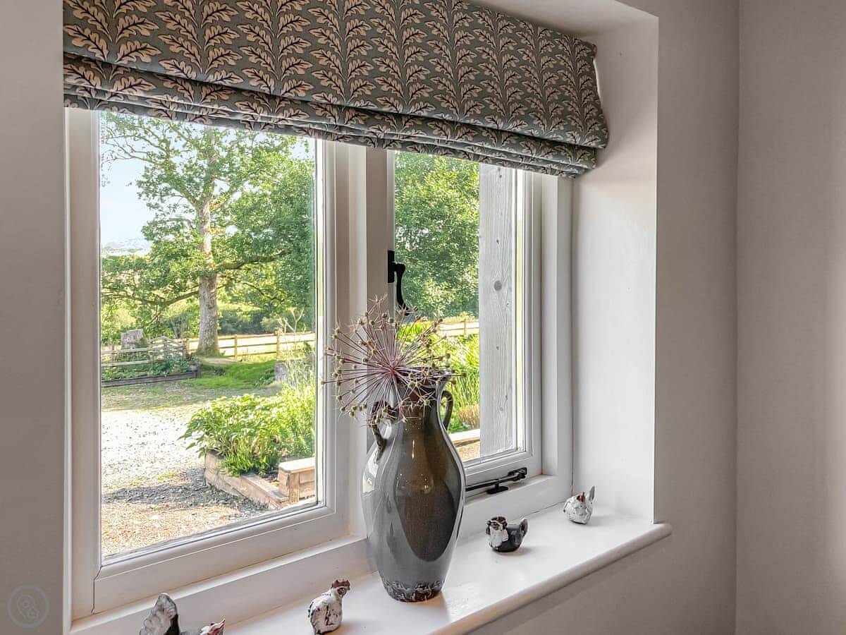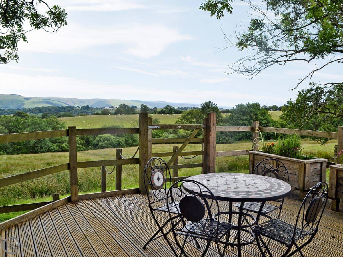 Outside, there's a decked area with some chairs. It looks straight out over fields. You get the sun in the evening.