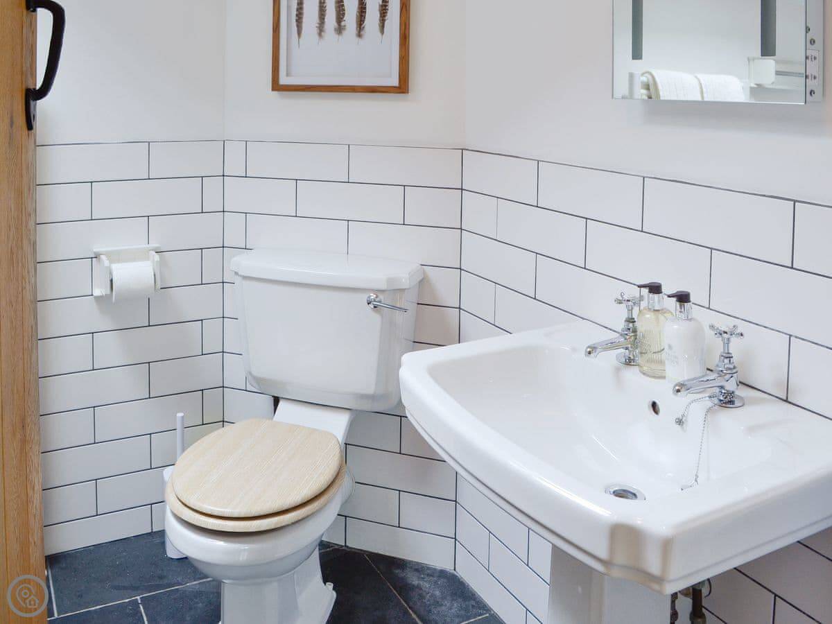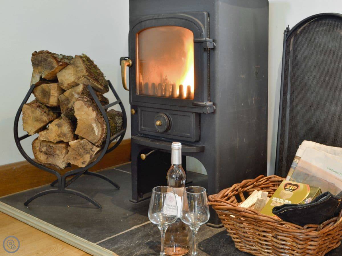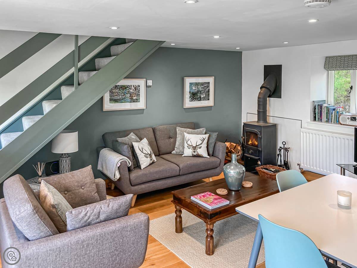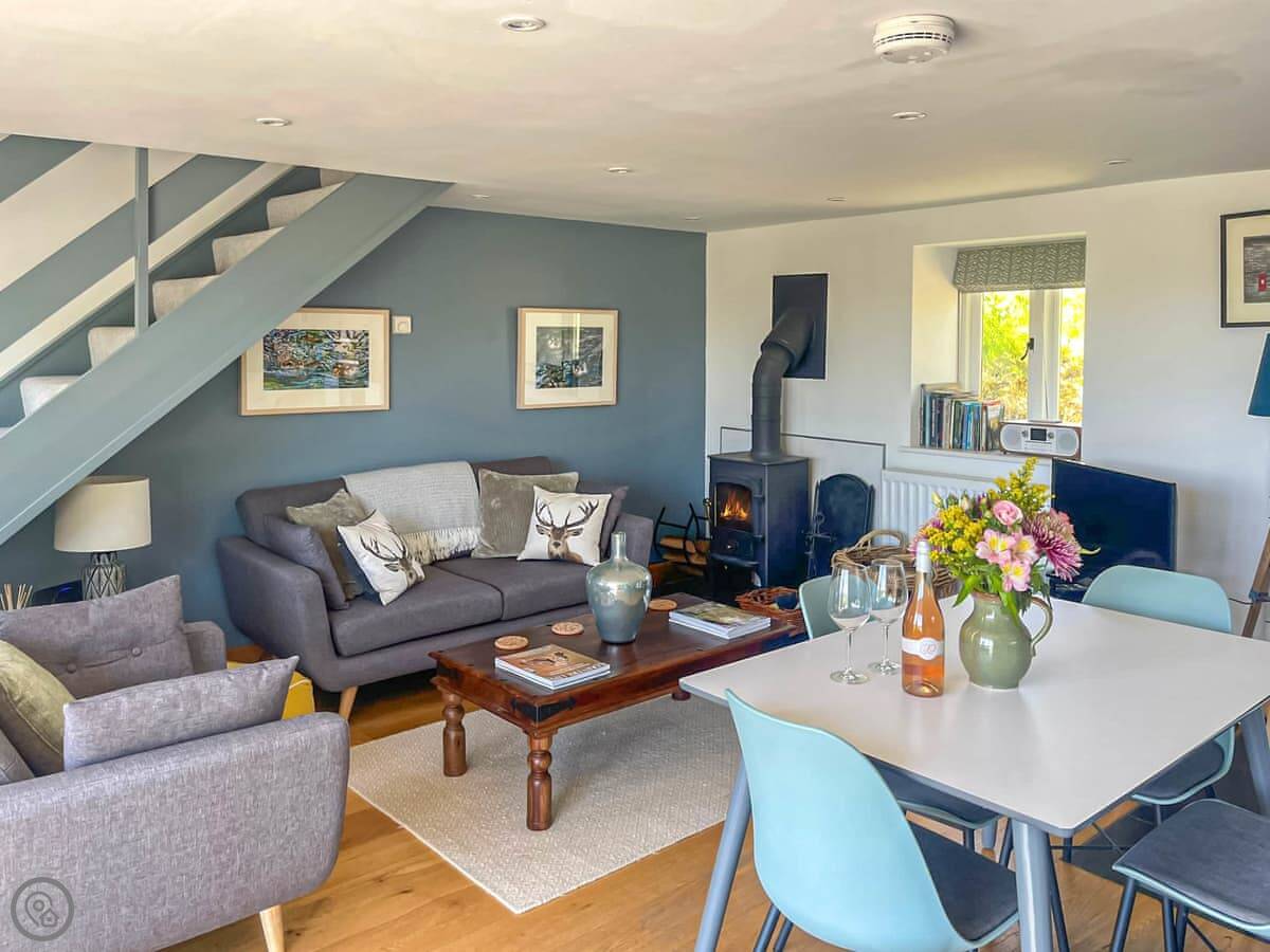It's done up to a good standard. The living space is all open plan downstairs, so it feels quite spacious for two. There's a wood burner, which is good when it's cold. The bedroom's upstairs with a king size bed and the bathroom's en-suite. The water pressure is fine.