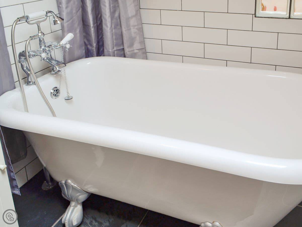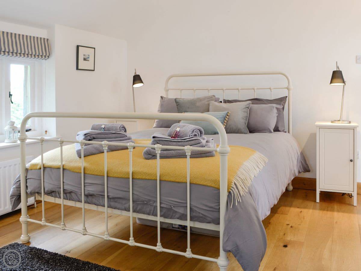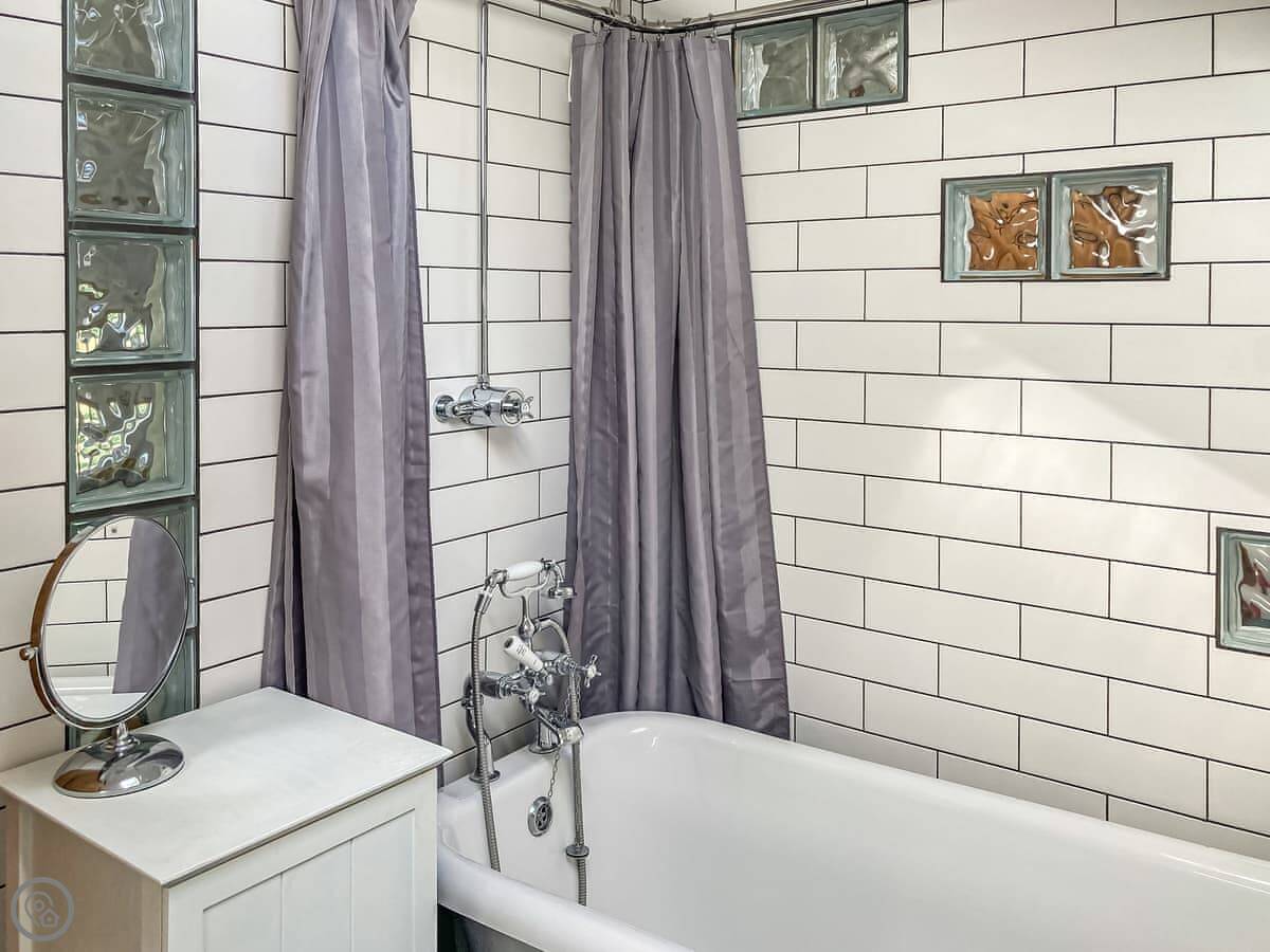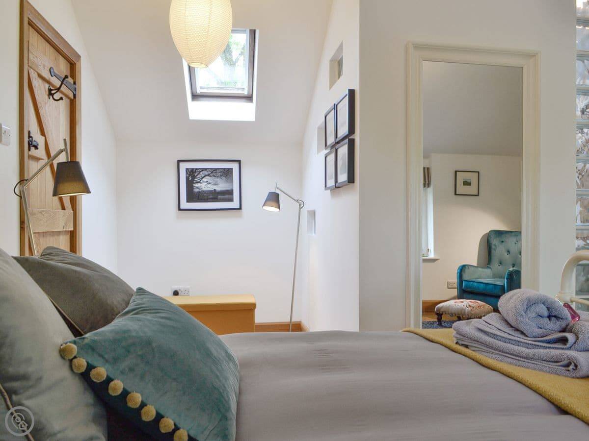 It's done up to a good standard. The living space is all open plan downstairs, so it feels quite spacious for two. There's a wood burner, which is good when it's cold. The bedroom's upstairs with a king size bed and the bathroom's en-suite. The water pressure is fine.