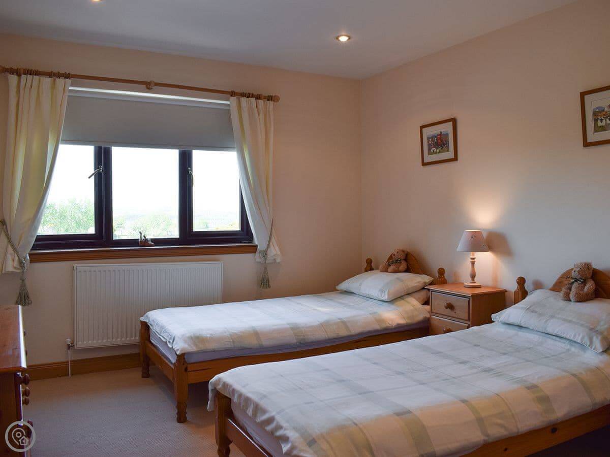 The large open plan living space incorporates a well-equipped kitchen, fitted with quality appliances and a range cooker, and a dining area which is ideal for a celebration meal. Welcoming and bright, the living area is inviting with comfortable sofas and makes a good social hub. Leading off the kitchen is a handy utility room with a sink and a good place to keep outdoor clothing. There are lovely views of the surrounding countryside from all windows, and the three attractive bedrooms are bright and well-presented. Patio doors lead from the kitchen onto a decking area and the large, secluded garden with children’s play area provides plenty of space for all guests to enjoy.