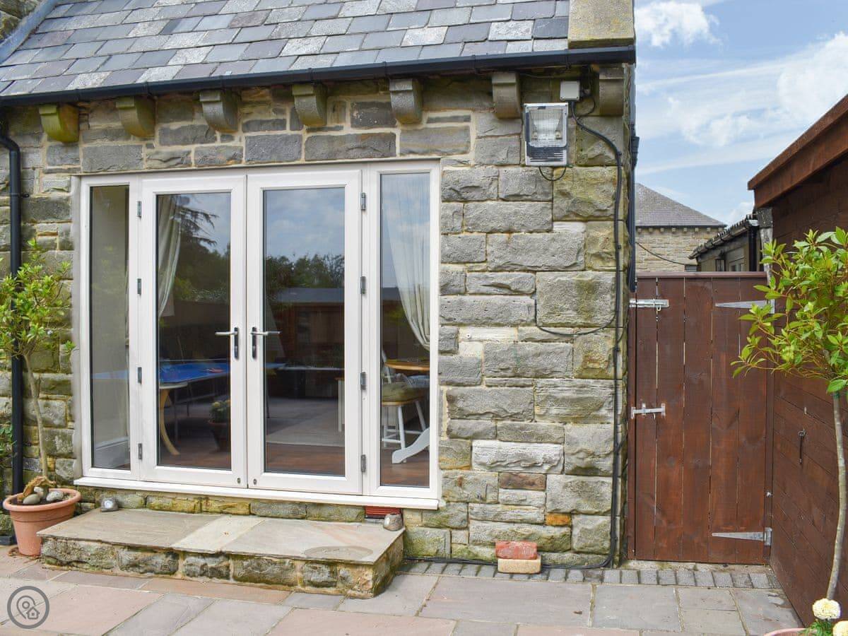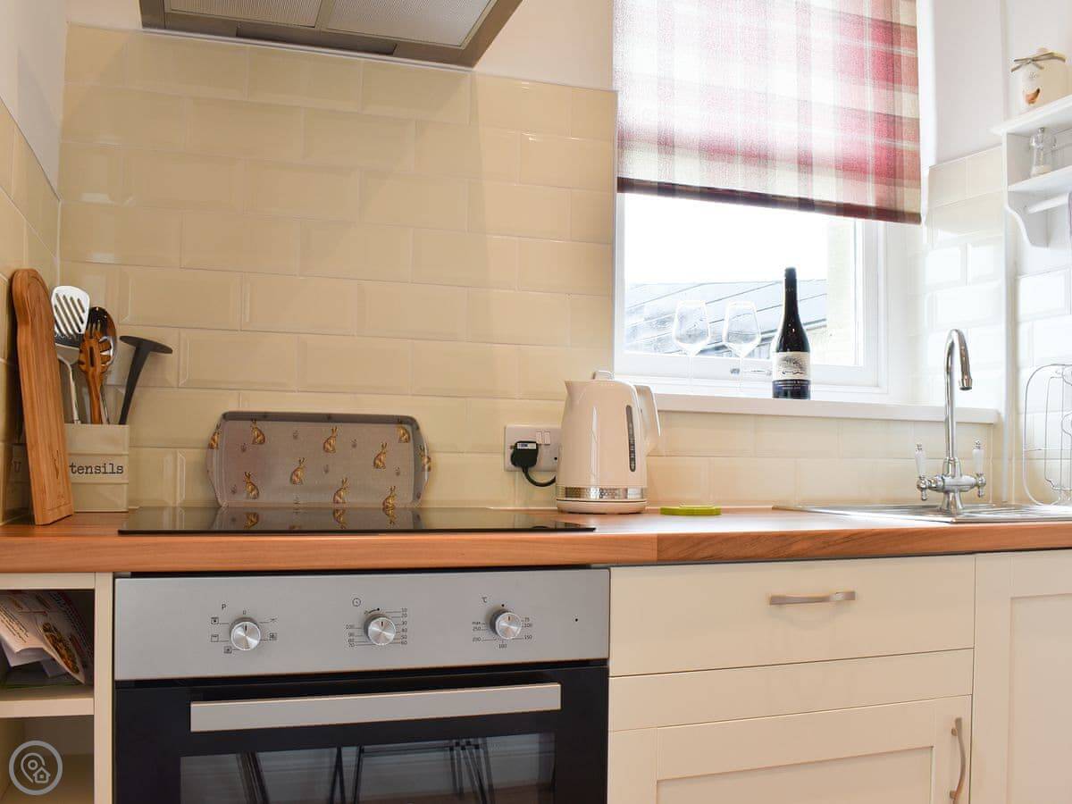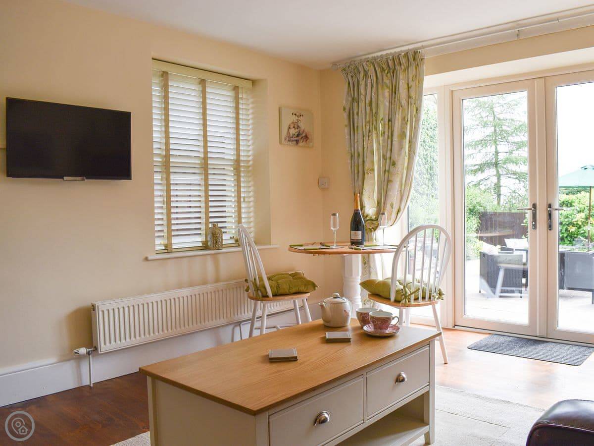 The kitchen is through the front door. It's got what you need. The living room has French doors out to your own patio. There's a wood burner. We provide the wood.
