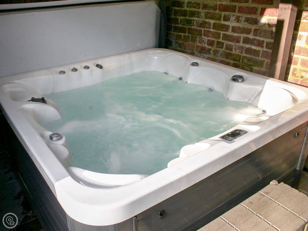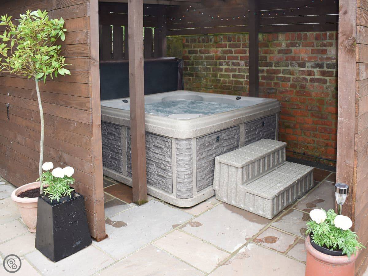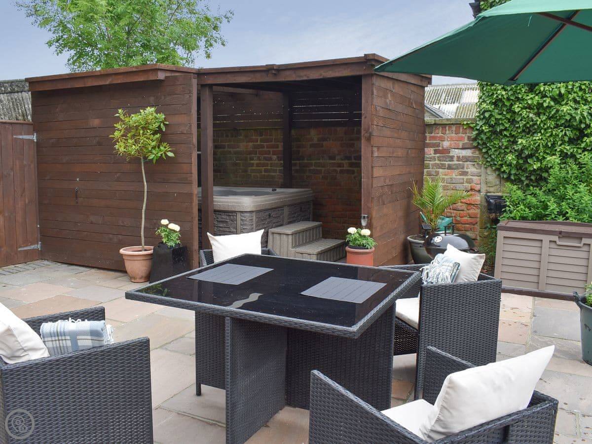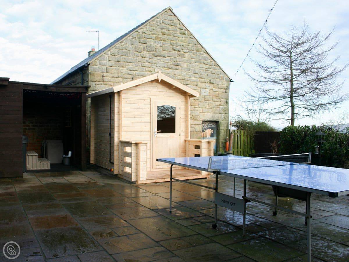 Outside, there's a hot tub and a sauna in a private section of the garden. We leave robes and slippers for that. There's also a barbecue.