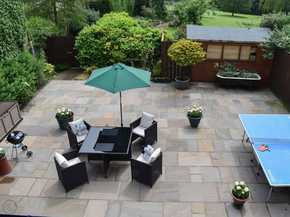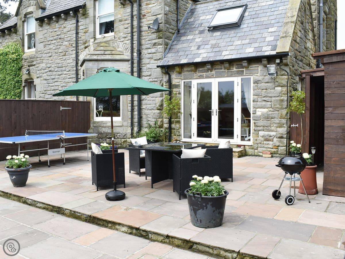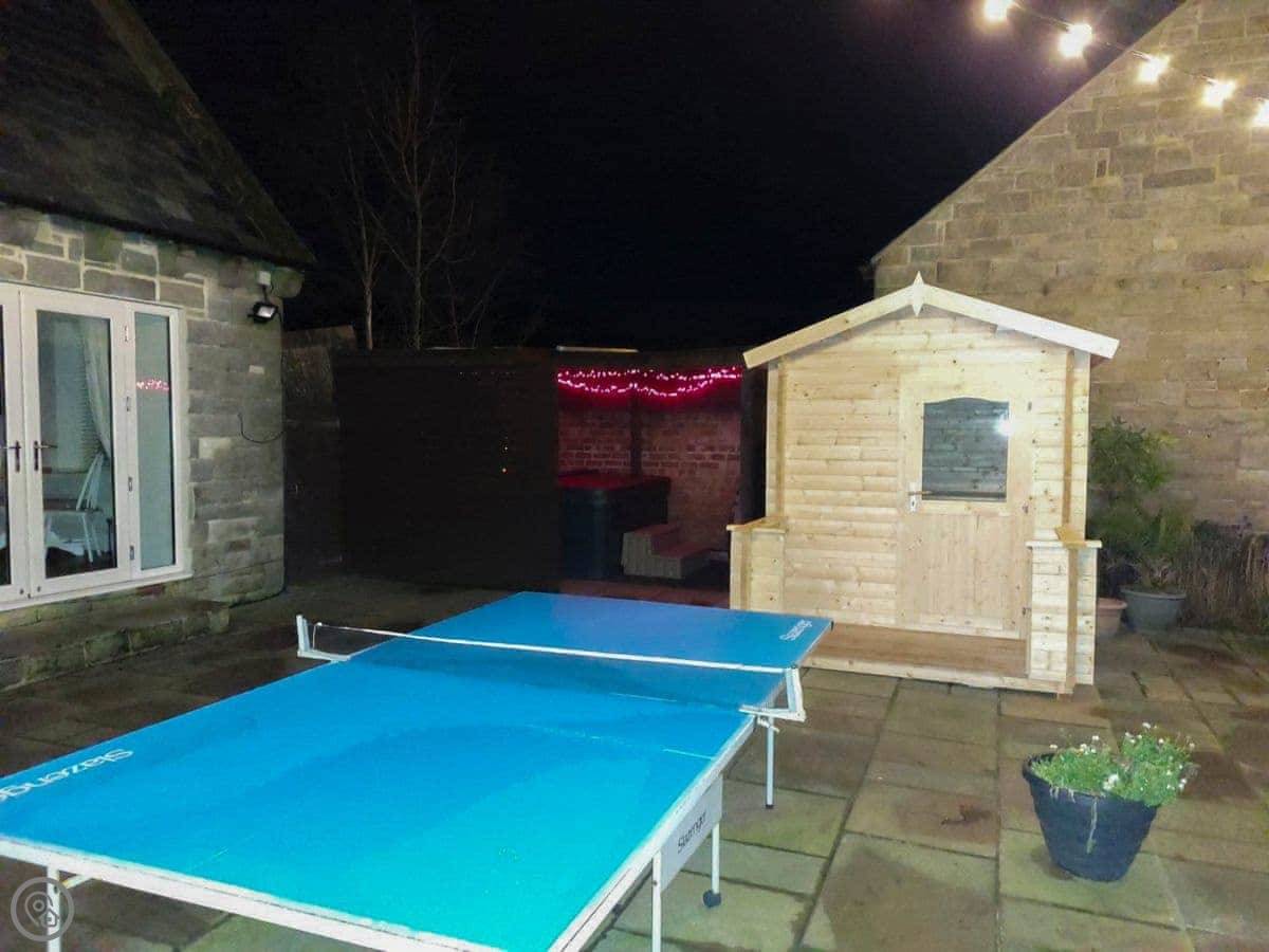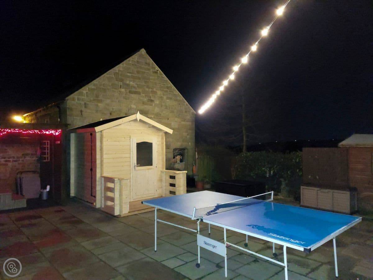 Outside, there's a hot tub and a sauna in a private section of the garden. We leave robes and slippers for that. There's also a barbecue.