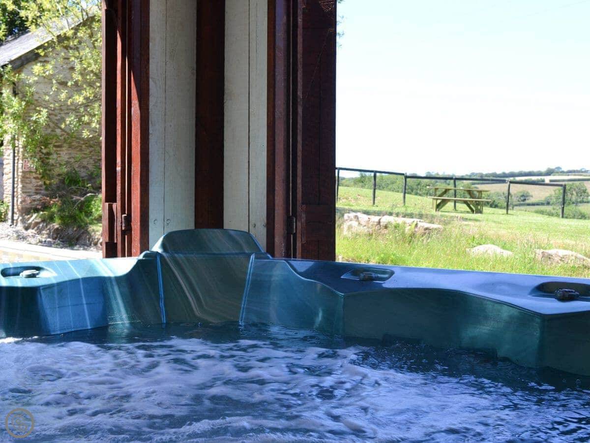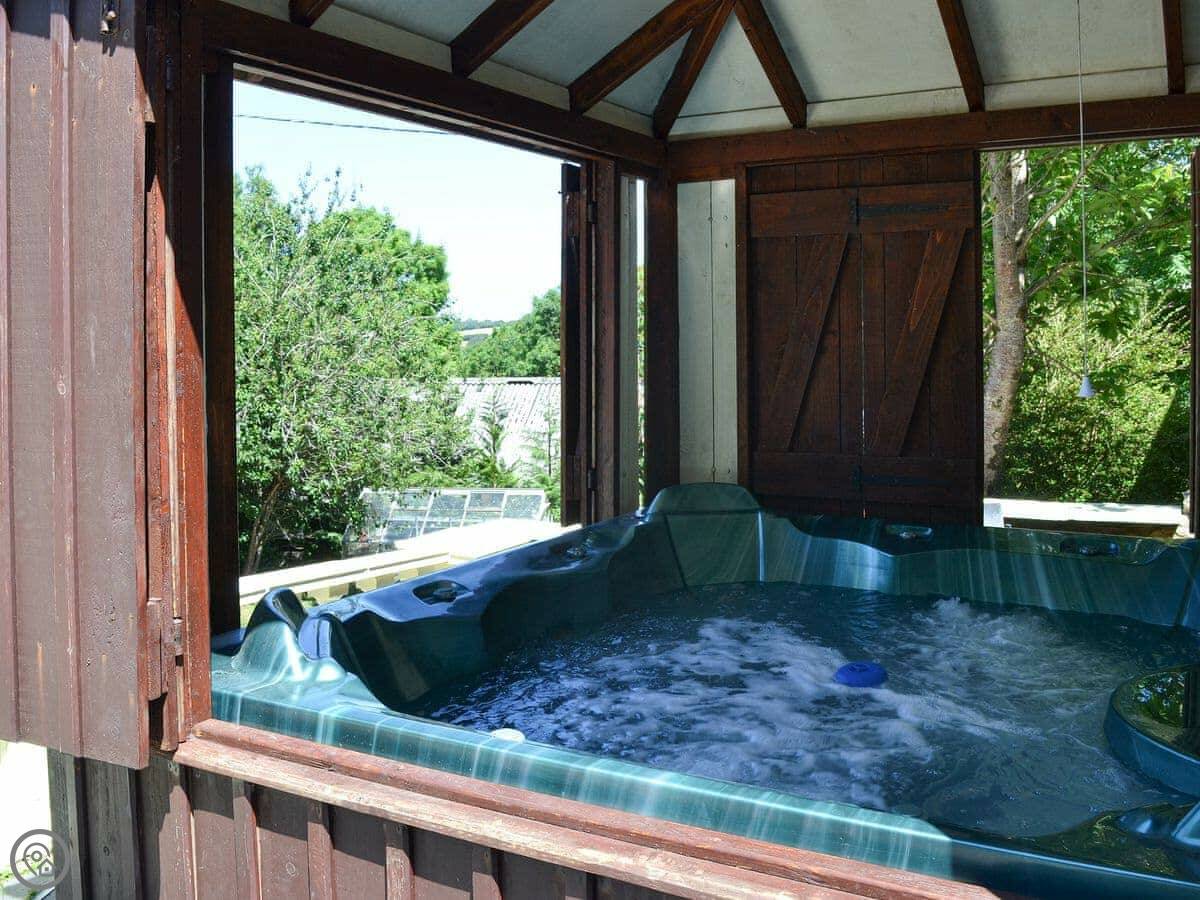 Outside, there's a big patio area with a hot tub. There's also a garden. Parking is on site.