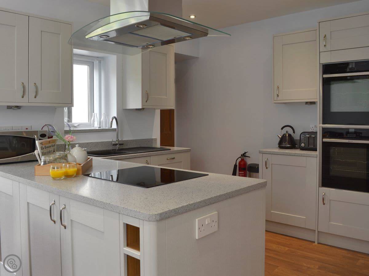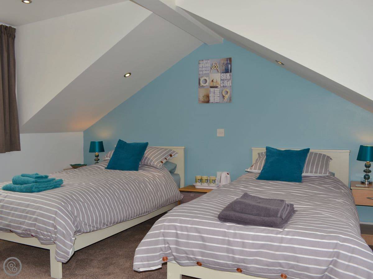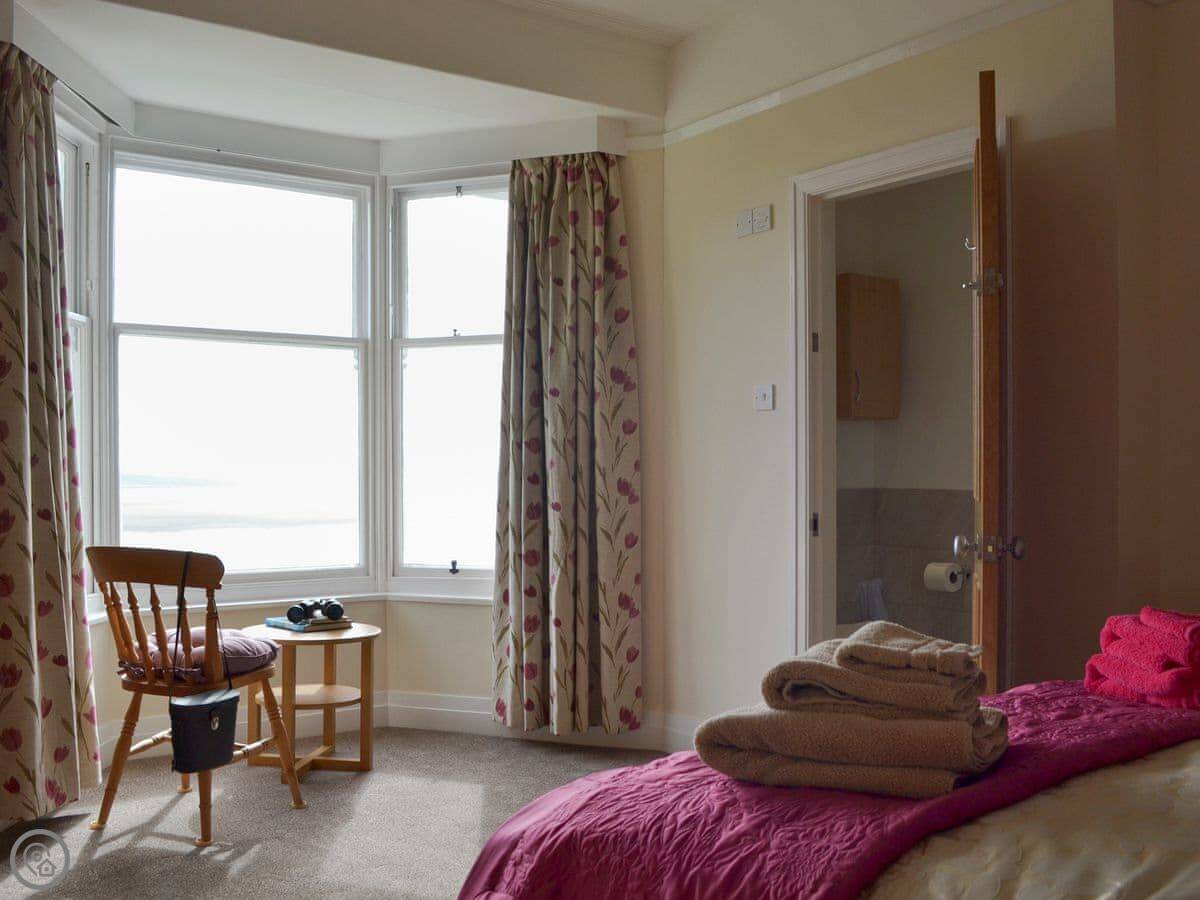 The living room is at the front with big windows for the view. There's a wood burner. The kitchen is at the back. There's a utility room and a shower room on the ground floor too. The main bedroom has an en-suite. Up on the second floor is a room with three singles.