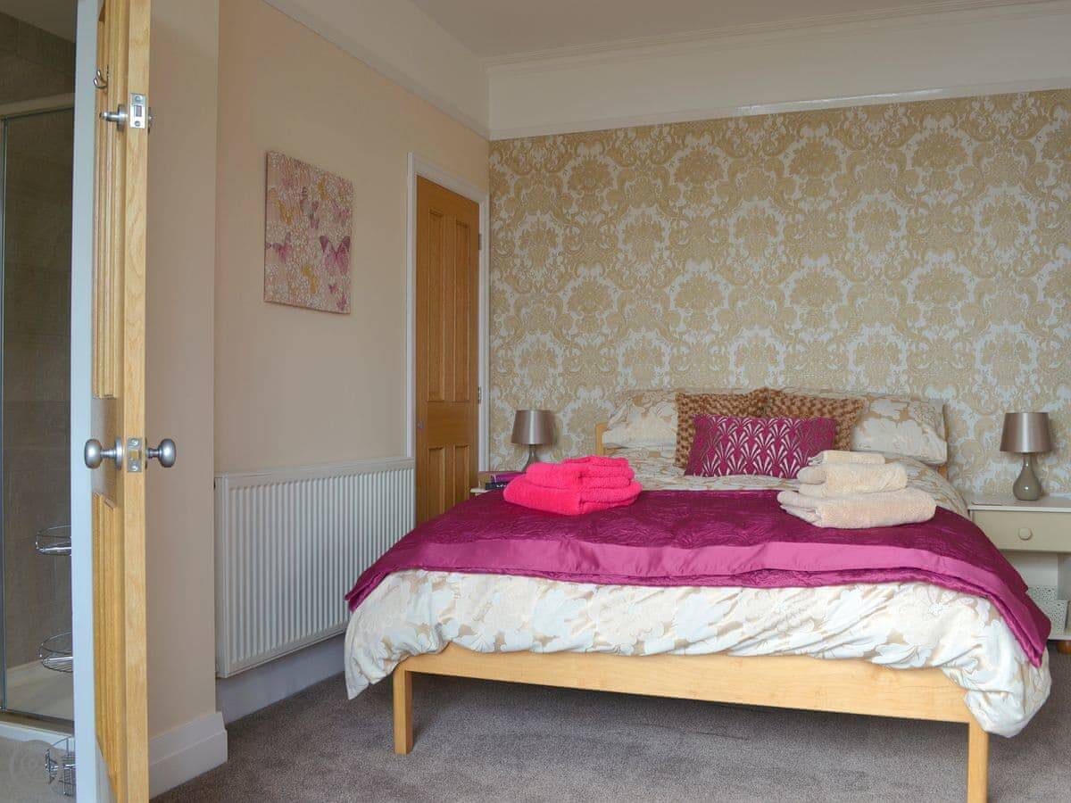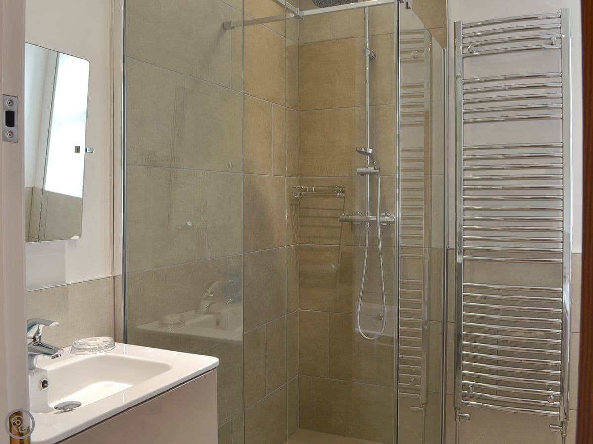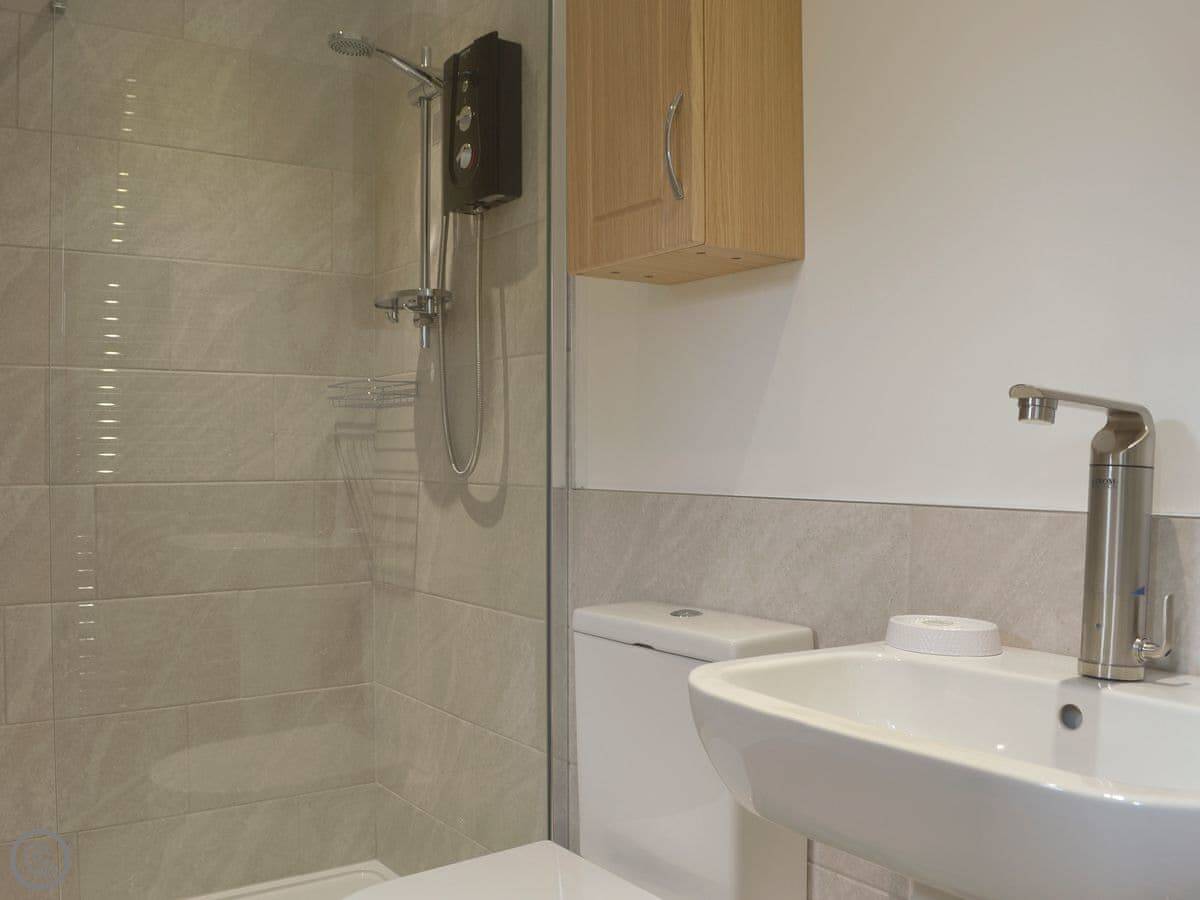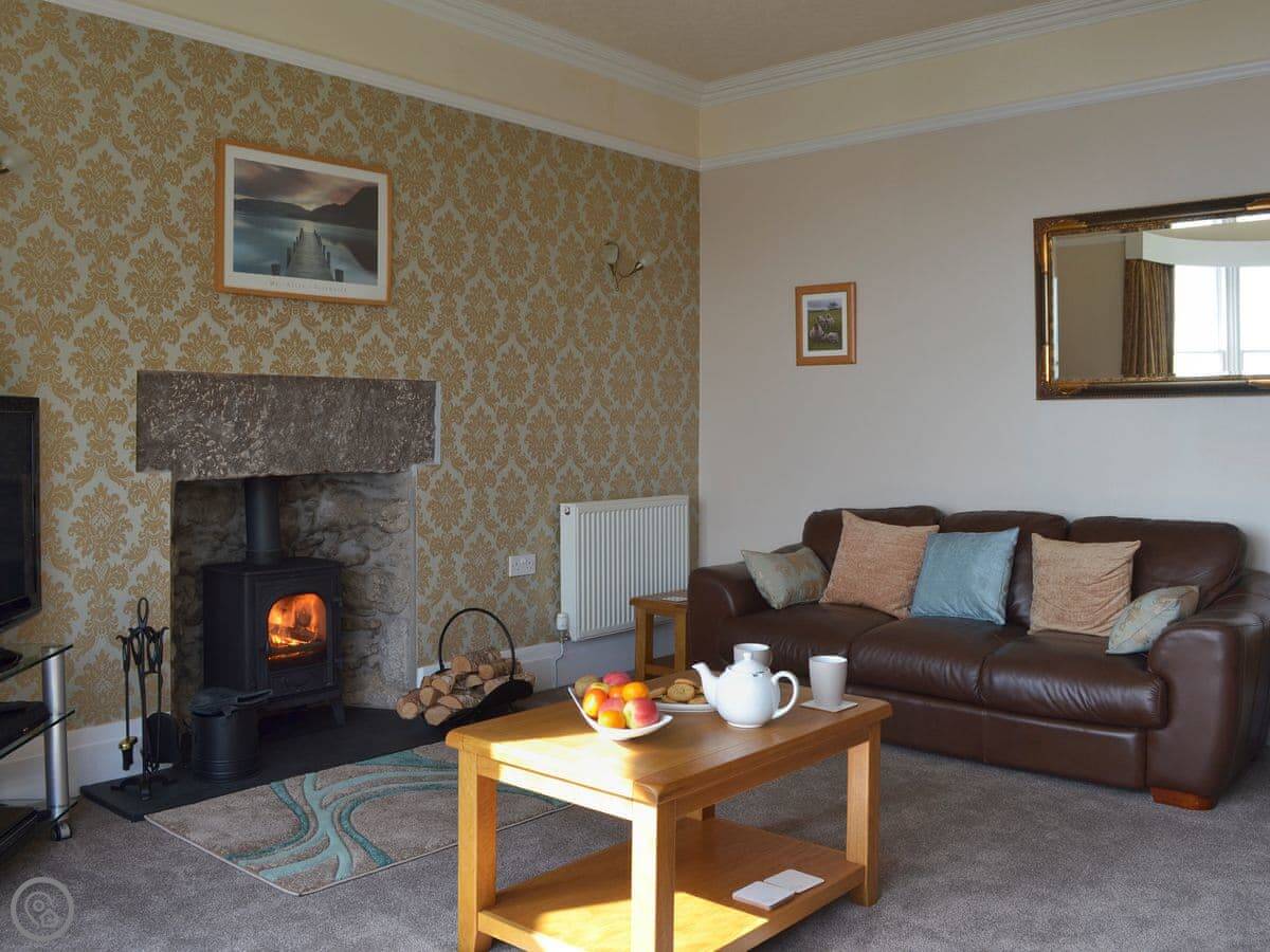 The living room is at the front with big windows for the view. There's a wood burner. The kitchen is at the back. There's a utility room and a shower room on the ground floor too. The main bedroom has an en-suite. Up on the second floor is a room with three singles.