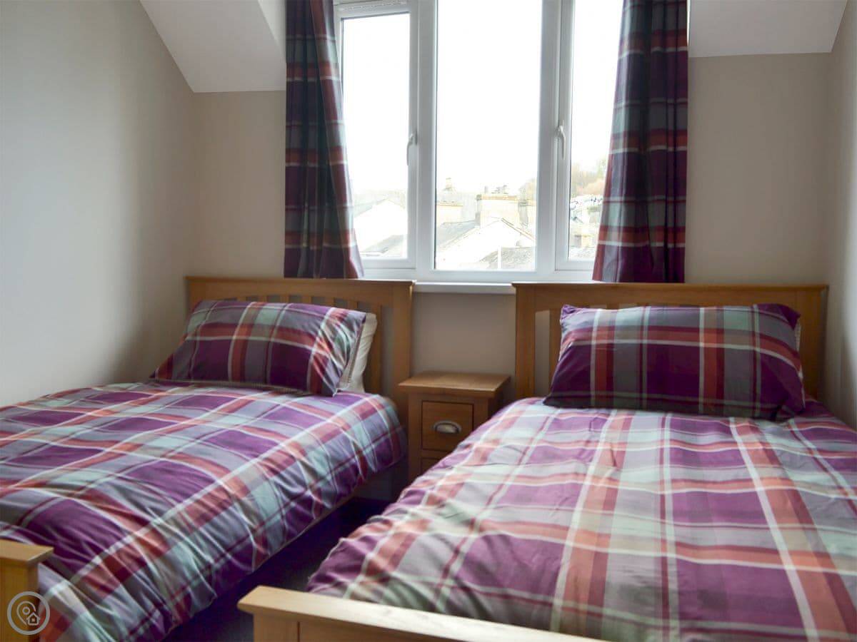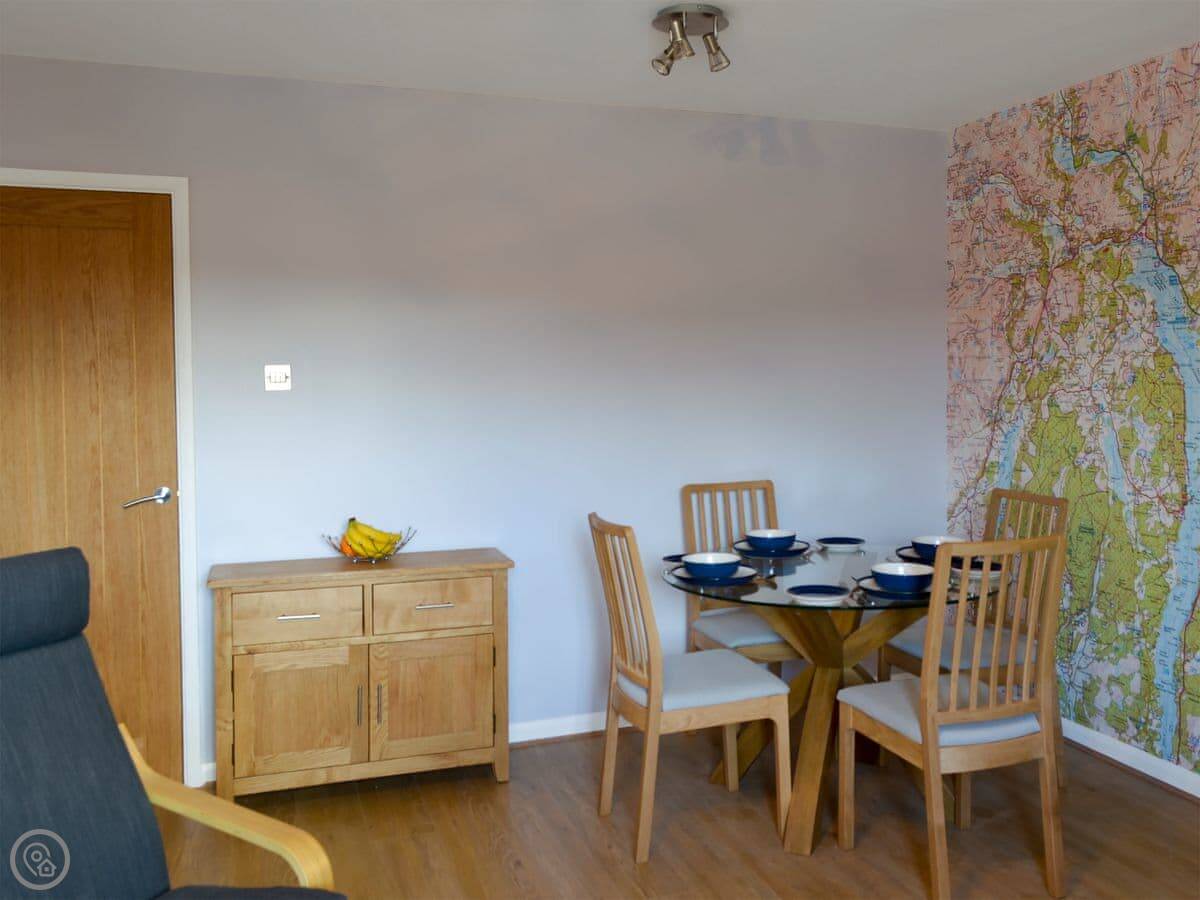 It sleeps four. Two bedrooms, one bathroom. It's got a 4 Star rating. It's modern and clean. The kitchen is small but has what you need. There's a parking space for you, which is useful in Bowness.