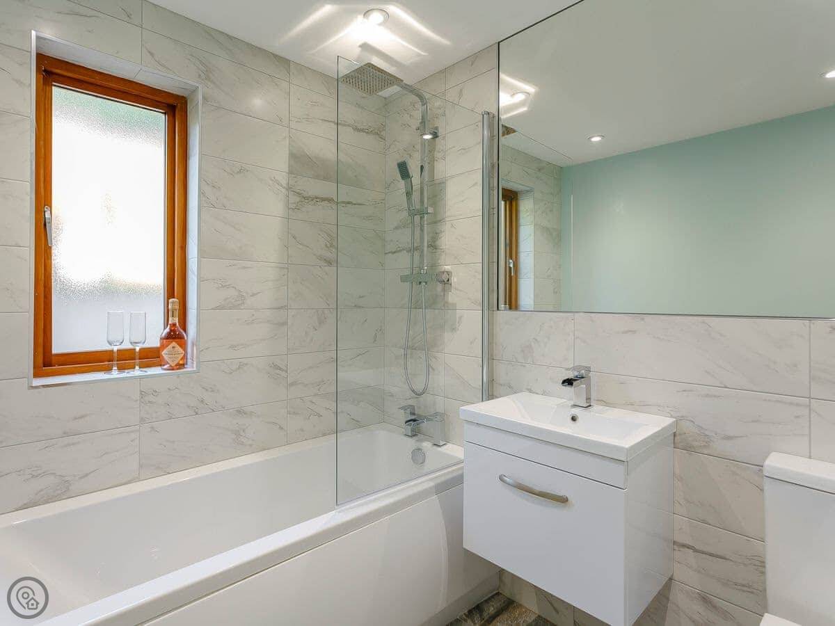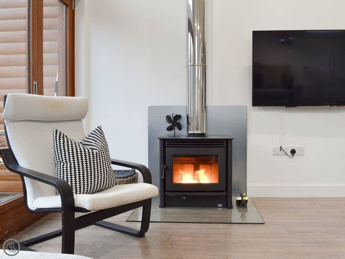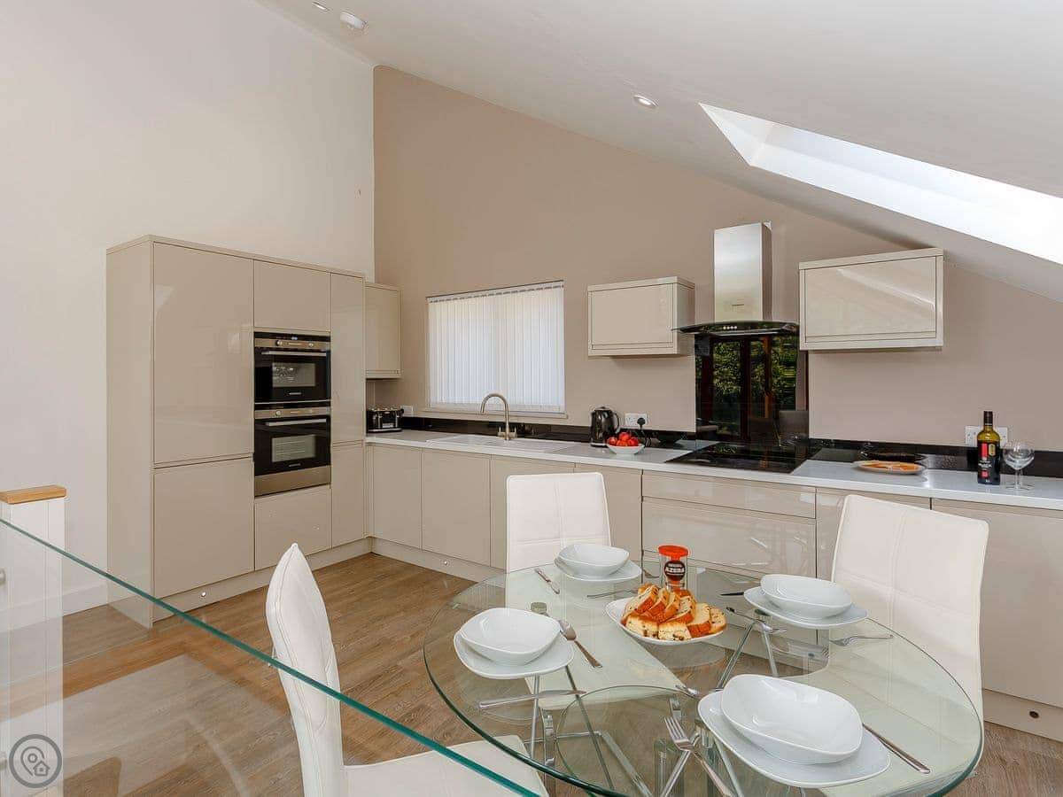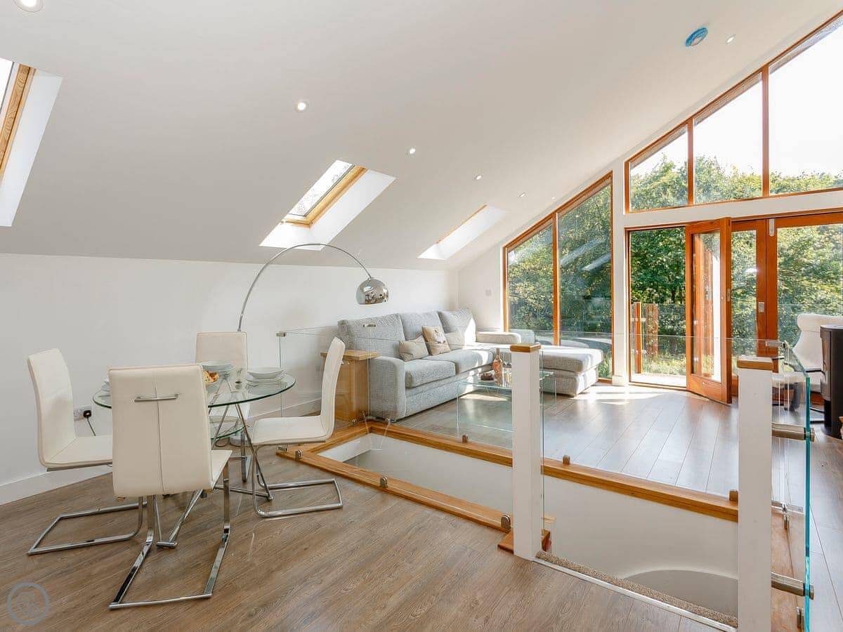 The lodge is on three floors, which is a bit unusual. The main living area is on the top floor. It's open plan with big doors that open out. There's a small balcony there. The views from that floor are good, mostly over trees and water.