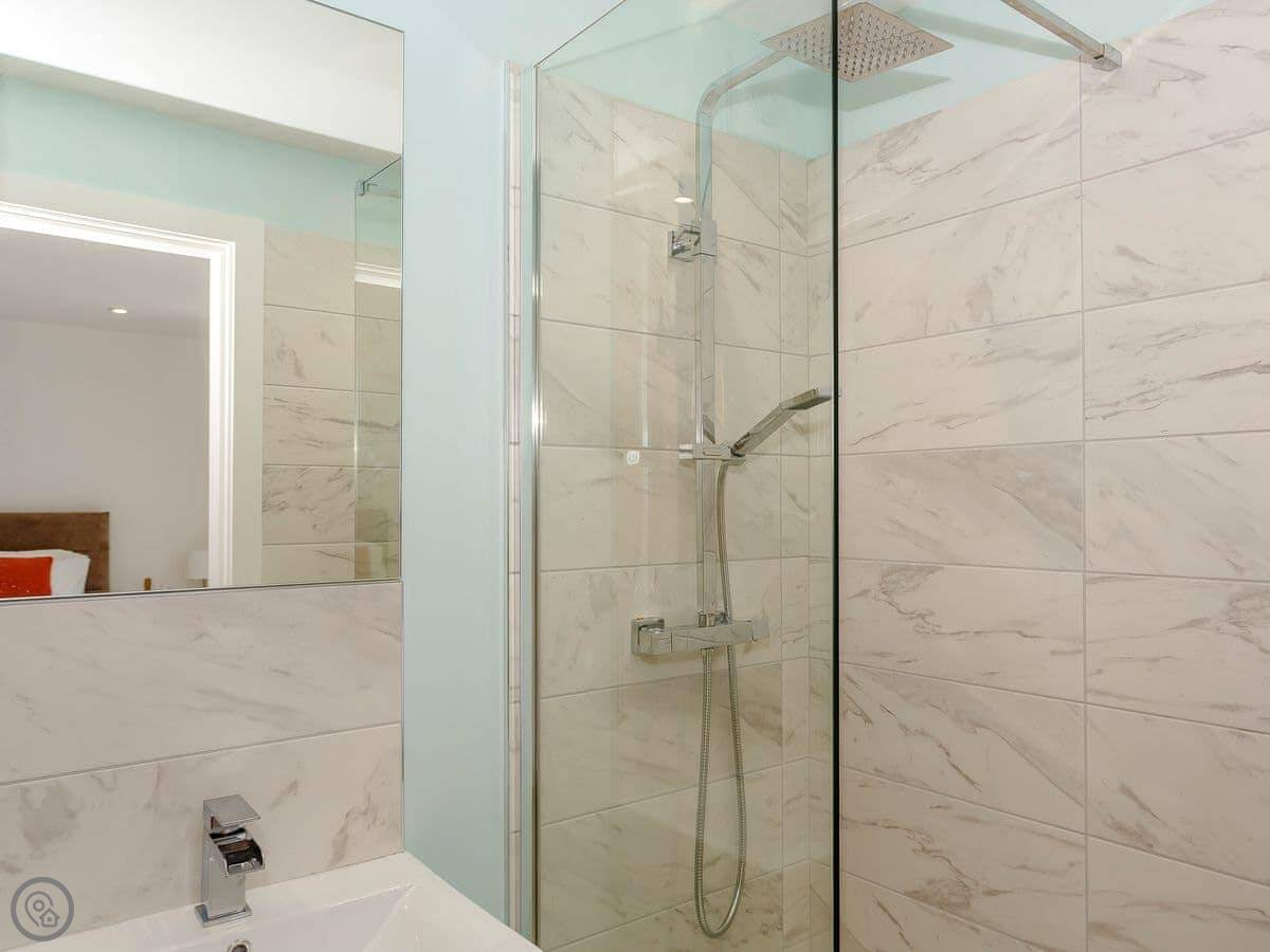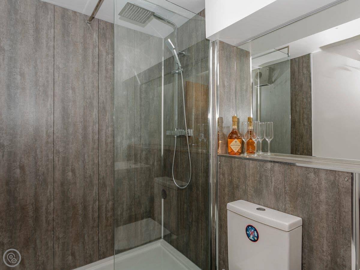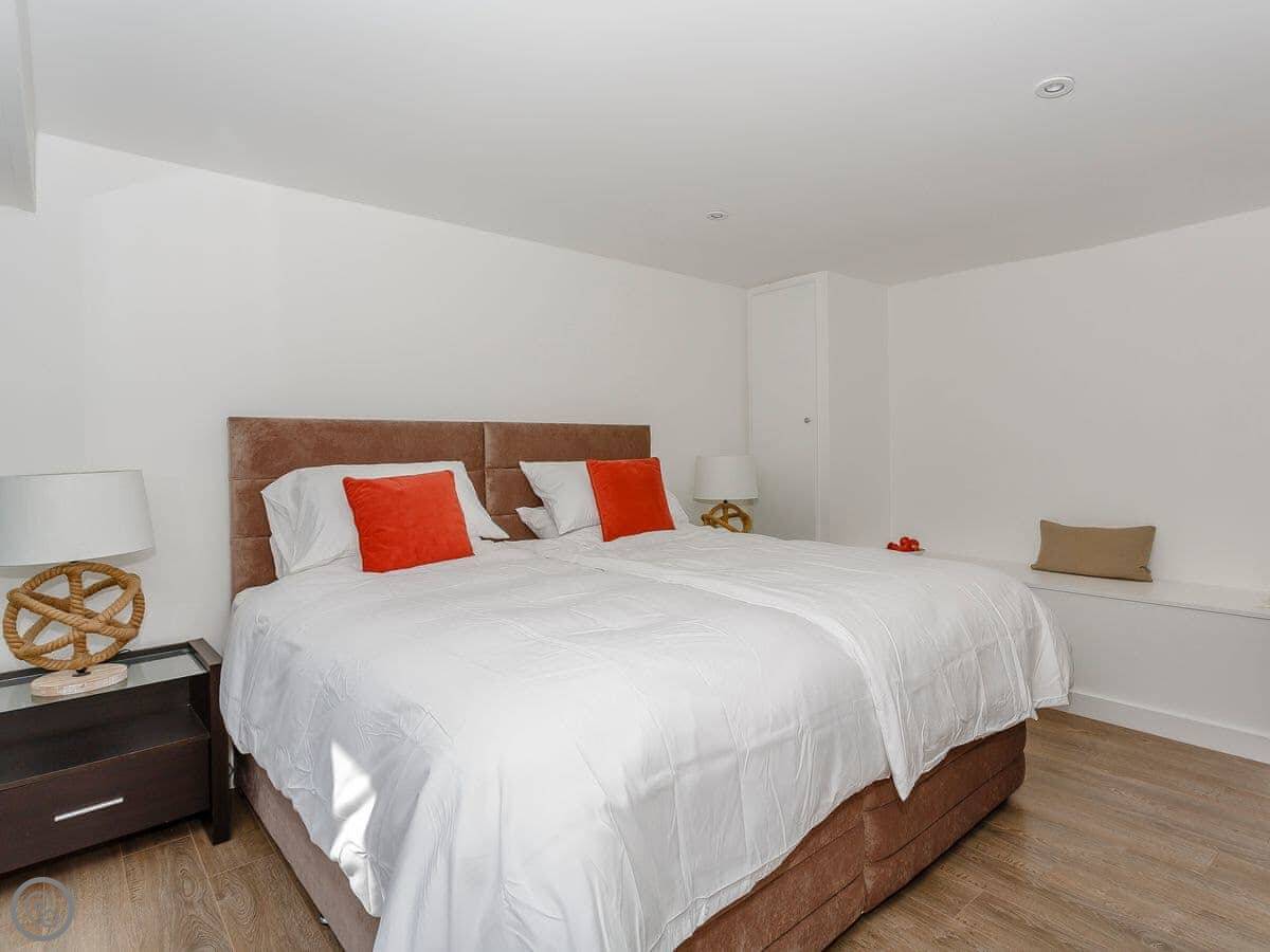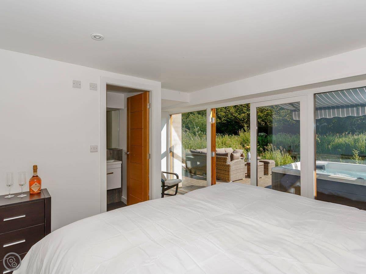 There are three bedrooms and three bathrooms, so one each if you're a group of six. Two bedrooms are on the middle floor. The third bedroom is on the lower ground floor. You get to it from outside via some external stairs. That bedroom has its own doors opening onto a big deck by the water. It's private.
