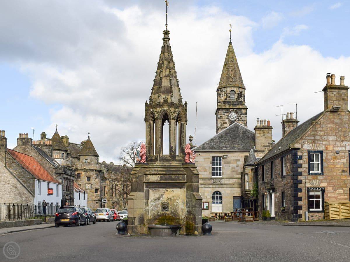 Falkland is two miles away. It's an old village with Falkland Palace. You can visit the palace and gardens. It was also used as a location in Outlander. The beach at Leven is about ten miles, and you can pick up the Fife Coastal Path from there.