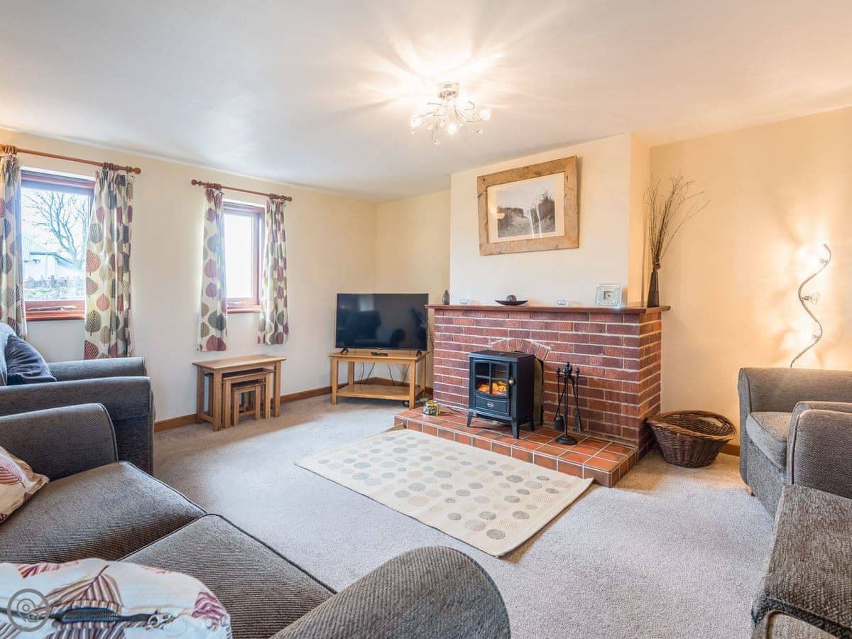 Cider Cottage boasts a front hallway leading into a spacious living space with open fire and electric coal effect fireplace. The room has a dual aspect with views from the rear across fields to the village church.