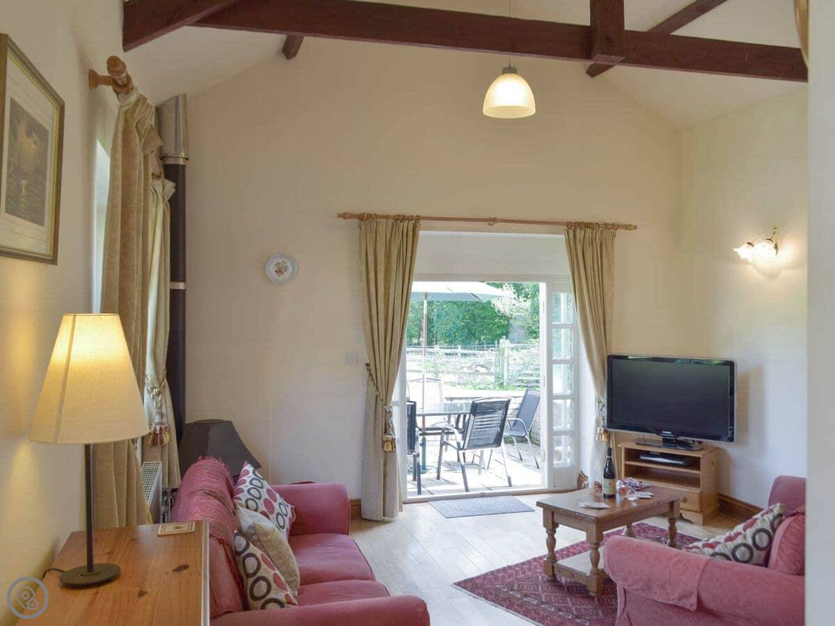 It sleeps six people in three bedrooms. There's one bathroom. It has a 3 Star rating, so it's comfortable and clean. The living area is open plan with a wood burner. The ceilings are vaulted with beams, and there's stonework and oak flooring. French doors open onto the patio.