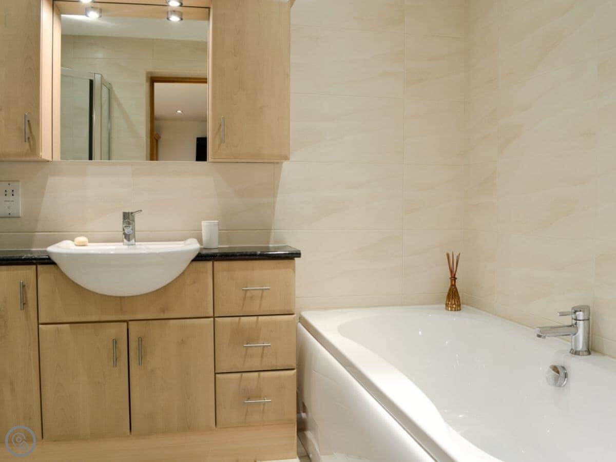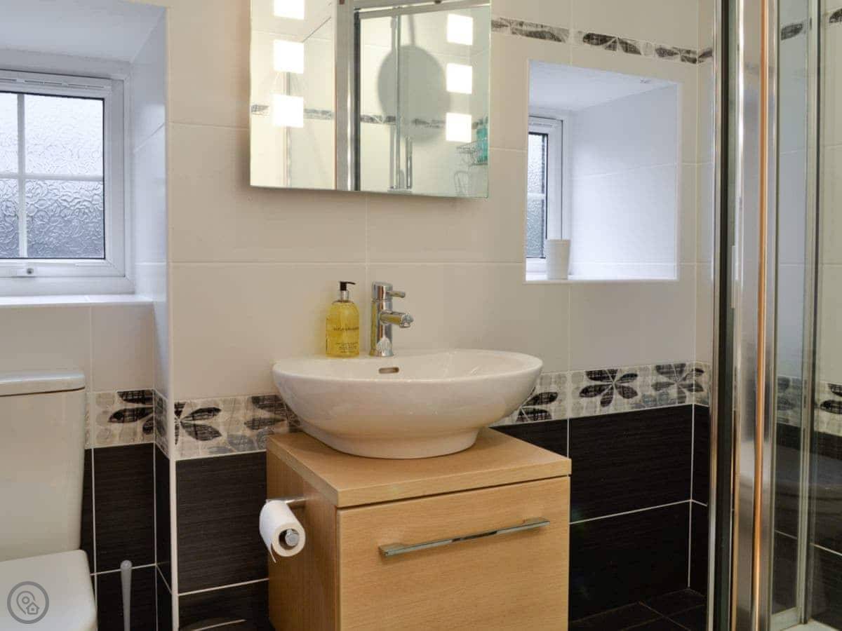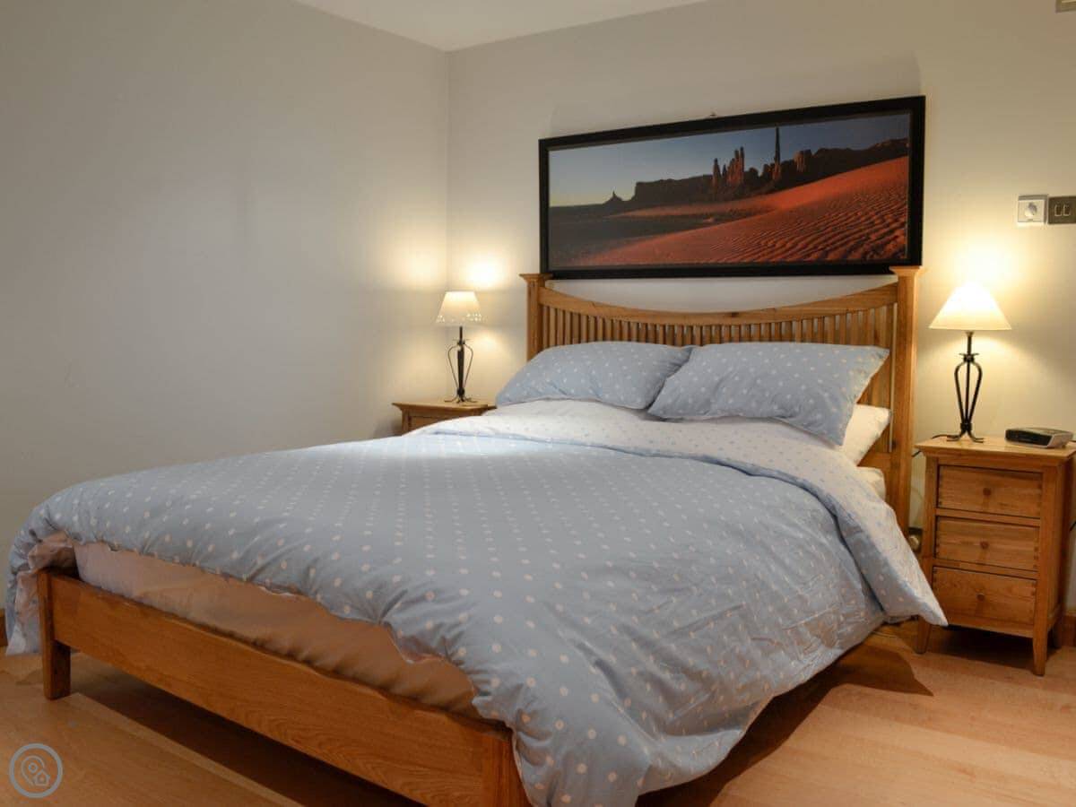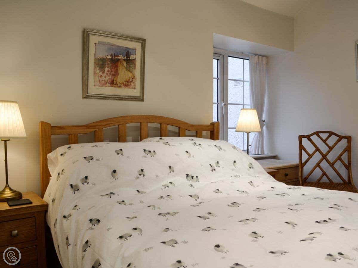 It sleeps four. Two bedrooms, two bathrooms. The rating is 4 Star, so it's comfortable and well equipped. It feels solid and clean. You can park right outside. There's a porch for boots, which fits a couple of bikes if you bring them.