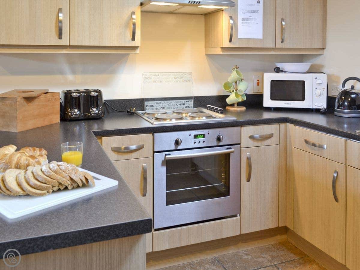 The facilities are straightforward. There's a washing machine and a dishwasher, bedding is included, and there's a cot and highchair if you need them. You can bring one dog. There's a TV and wifi.